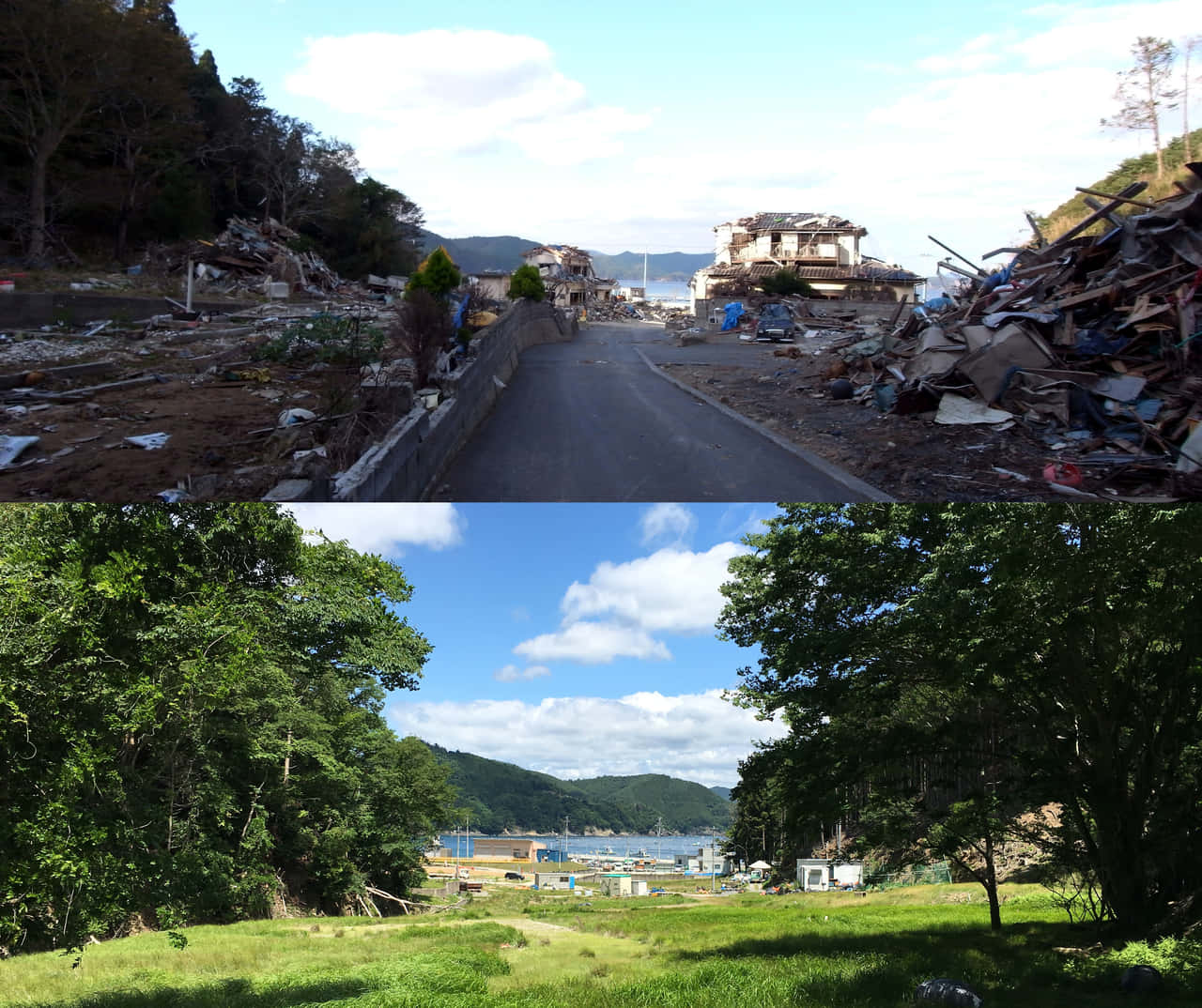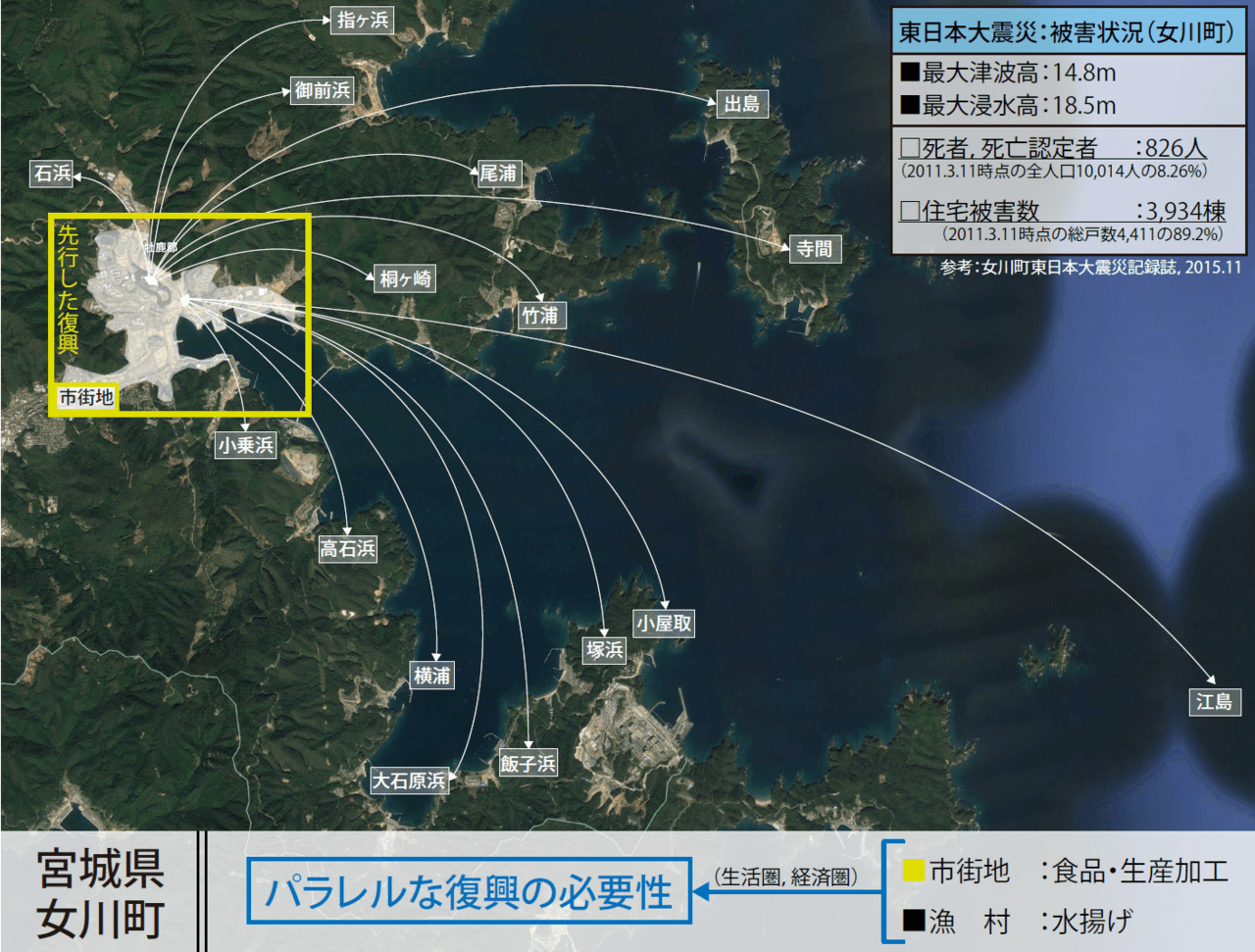 特集・3.11 職住一体の「まちづくり」(前編)—事前復興計画という考え方— 2021.3.8 下田 元毅(しもだ もとき) 印刷する 地域住民不在の復興|目に見えるカタチ・見えないカタチにほんの⾥100 選にも選ばれている漁村の⾵景(三重県尾鷲市須賀利町)漁村は⾃然と向き合いながら⽴地し、地形、⽣業、社会構造がダイレクトに呼応しながら⽬に⾒えるカタチで⼒強く存在する。 また、⾃然と⼈為の折り合いの中で、そこに住む⼈々の⻑い時間の営みの集積により創り出された地域固有の祭祀や習慣・慣習など、⽬に⾒えないカタチで地域の⽂脈が継承されている。 私たちは、これら可視・不可視の相互浸透的な総体のカタチとして漁村が成⽴していることに魅了され続けている。 東⽇本⼤震災から10 年間の復興過程は、⽬に⾒えるカタチを信じてきた私たち建築・都市計画に関わる「計画者」に対し、ある意味での無⼒感を突きつけた。 それは、多くの漁村の復興過程において、⽬に⾒えない⼤切なカタチと主体(地域住⺠)不在のまま復興が進まざるを得なかった側⾯を感じているからである。 「事前復興計画・まちづくり」で先を見据える事前復興計画・まちづくり(案)の⼀部(和歌⼭県広川町)私たちは、復興過程における東北のこれまでを含めた「今」を検証しながら、来たるべき南海トラフの災害に向けて、漁村の復興計画を地域住⺠と事前に考えておく「事前復興計画・まちづくり」を進めていく必要があると感じている。 「事前復興計画・まちづくり」とは、いつ来るか分からない災害に対し、 ①「事前」の範囲を現在の地域課題と向き合いながら社会や空間を少しずつ動かし始めること。 ②地域の持続性を担保する仕組みを構築すること ③地域住⺠と地域分析や⾏動計画を⽴てること これらを事前復興計画・まちづくりとして定義している。 最終的には、避難経路策定や⼀時避難地点、仮設・拠点設定などの防災的側面や産業復興、福祉・医療等、様々な要素を包括した計画の策定を⽬指すものである。 本特集の前編では、事前復興計画・まちづくりの必要性について述べ、後編では、実際の取り組みについて紹介したい。 生業(なりわい)と生活の並行した復興市街地と漁村の連関図と東⽇本⼤震災の被害概要(宮城県⼥川町)⼩規模な漁村は⽣活圏だけでなく、⽔産業における保冷、加⼯、流通ネットワークが市街地と連関した地域経済構造である事が多い。 ⽇常⽣活と⽣業を並⾏して復興していくためには、市街地と漁村の並⾏した復興計画を実⾏する必要がある。 しかし、復興過程において多くの地域が、市街地優先で復興計画の実⾏がなされた。 宮城県⼥川町でも漁村の⾼台移転や災害公営住宅の再建までに2017 年12 ⽉迄の約7 年弱を要することとなり、職住⼀体での暮らし⽅を⾏う漁村において、⽇常⽣活と⽣業の復興における空間・時間的な間隙が⽣じた側⾯もある。 来るべき南海トラフ地震・津波災害は、広域且つ都市圏を含めた甚⼤な被災が予測されている。 これらを踏まえると、政府や各⾃治体が、都市圏及び市街地優先で復興計画を進めることは容易に想像できる。 市街地(保冷・加⼯施設等)が先⾏した復興をしても、⿂の⽔揚げを⾏う現場が復興しなければ意味をなさない。 ⽇常⽣活と⽣業、さらには広域的な地域構造を⾒据えた際にも、漁村の事前復興計画・まちづくりは積極的に思案すべき事項であると考える。 人が住めなくなった漁村|災害危険区域写真上:⽡礫撤去中の⾵景_2011.10/写真下:⼈が住めなくなった⾵景_2016.06(⼥川町飯⼦浜)写真は⼥川町飯⼦浜の2011 年と2016 年の写真である。 この写真で伝えたいのは被災後5 年の⾵景の違いではなく、⺠家が⽴ち並んでいたはずの漁村に1 軒も⺠家が建っていないことである。 この⾵景が創り出された要因は、浸⽔した漁村や市街地の⼀部のエリアで、住宅などの居住の⽤に供する建築を建てることができない「災害危険区域(建築基準法第39 条)」の指定がかかったためである。 区域指定内は住宅を建てることが法律的に不可能となり、その代替地として、集団で⾼台移転(防災集団移転促進事業)を⾏うための新たな住宅団地が整備される事となる。 分離した生活と生業(なりわい)|高台移転⾼台移転をした漁村の⾵景_2016.06(⼥川町桐ヶ崎)⾼台移転した漁村集落の写真である。 ⾼台移転した漁村は、海から離れているため、漁師は旧漁村に通う。 神社や墓地などの祭祀に関わる事柄も旧漁村で⾏う。 私は、この新しい漁村の⾵景を⽬の当たりにした際、⽬に⾒えるカタチと⽬に⾒えないカタチの両⾯を重ねた復興の在り⽅の必要性を強く感じた。 ⼤災害は、ともすれば先祖代々引き継いできた⼟地から離れた場所に住まなくてはならなくなるかもしれないことを⽰唆する。 さらに、突然襲いかかってくる⼤災害からの復興は、地域住⺠の主体的な復興計画とならないかもしれない。 しかし、私は、地域が主体的に「事前」を想定しておくことによって、