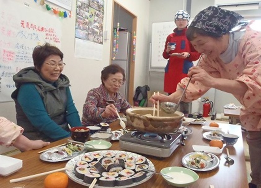 特集・3.11 「仲間がいたから立ち上がれた」――災害時に力を発揮したJF女性部の活動(岩手県・JF釜石東部女性部) 2021.3.11 大浦 佳代(おおうら かよ) 印刷する どん底で、頭より先に体が動いた被災時、炊き出しの様子「津波ですべてを失ったどん底で、『もう1回やろう!』と思えたのは、女性部の活動と仲間のおかげです」。岩手県釜石市の釜石東部漁業協同組合(以下、JF釜石東部)女性部長、前川良子さんは10年前の“あの頃”をこう回想する。 文字どおり「体ひとつ」で逃げた前川さんだったが、避難生活を送る中で「生きるためには、何かしないと」と、女性部の有志で炊き出しを始めた。 「頭より先に体が動いた感じ。長年続けてきた女性部活動の延長という感覚だったから、動けたのかもしれません」と、感慨深そうに話す。 その「長年続けてきた活動」とは、郷土料理の伝承をベースとした食育、加工品の商品開発と販売、漁家レストランの経営、さらには漁業体験などのグリーンツーリズムまで、幅広いものだった。 食をテーマに積み上げた活動、山と海の連携母さん手作りの郷土料理を楽しむ会、農家女性とともにスタートは2004年。県による伝統食の調査をきっかけに、JF釜石東部女性部と山間部の農家女性のグループが意気投合し、郷土料理研究会を発足させた。 伝統食の研究のほか、地元食材の魅力を伝える「郷土料理を楽しむ会」を毎月開催。 ヒジキご飯やホヤの吸い物、すき昆布の天ぷら、サケと白菜や大根の漬物など山海の恵みを並べ、大好評だった。 「2006年には、念願の活動拠点ができました。うれしかったですね」と、前川さん。海水浴場とキャンプ場のある根浜海岸で、市からレストハウスの運営を任されたのだ。 被災前の根浜海岸レストハウス夏には漁家レストラン「浜茶屋」を営業し、海辺を訪れる人たちをもてなした。また、加工品の製造販売やイベントへの出店のほか、市が進めるグリーンツーリズムにも参画するように。 漁場見学をガイドしたり、郷土料理の昼食を振る舞ったりなど、女性部は地域の交流事業に欠かせない存在になっていった。 連携の多様性がリスク分散に津波に襲われて傾いた根浜レストハウスしかし10年前の津波は、愛着のあるレストハウスも押し流してしまった。 胸のつぶれるような思いを抱えながらも、女性部は、炊き出しで一歩を踏み出す。その場となったのは、レストハウス近くの旅館の前庭。女将が女性部メンバーで、宿をボランティアの拠点として開放していたのだ。 「まだ水道も電気もない時期。でもイベントなどで屋外での調理は手慣れていたし、物資の調達もメンバーのネットワークで乗り切れました」と、前川さんは振り返る。 その上、心強い助っ人が駆けつけてくれた。 郷土料理研究会でともに活動してきた内陸部の農家女性のグループだ。気心が知れた「山の母さん」たちの救いの手には、張り詰めた気持ちをふっと緩めてくれる効果もあったという。 これまでの活動で漁家と農家が手を携えてきたことは、図らずも災害時のリスク分散になっていたのだ。 食支援活動の様子やがてJF女性部の「海の母さん」は、「山の母さん」たちと一緒に、食の支援活動を始める。 仮設住宅の高齢者に郷土料理を届け、談話室でおしゃべりする会を定期的に開いたのだ。 この活動は3年にわたって続いたという。 「手料理を口にすると、お年寄りも子どもも、本当にいい笑顔を見せてくれるんです。食は心も癒すと痛感しました」と、前川さん。そしてこの活動でさらに自信をつけ、覚悟を新たに次の活動へと進むことになった。 さらに地域を巻き込んだ女性部活動へ写真:NPO法人釜石東部漁協管内復興市民会議そして今、女性部は地元NPOと連携し、活動の幅を広げている。JF釜石東部は市北部の8つの浜からなるが、震災後に復興まちづくりを目的とする「NPO法人釜石東部漁協管内復興市民会議」が誕生。 事務局はJFに置かれ、国の復興支援員制度で移住した若者が事務を担い、運営体制もがっちりしている。 活発なJF女性部の活動は、復興まちづくりの大きな力だ。そこで、NPOは女性部と連携。 加工品の開発と販売、イベントへの出店、親子向けの郷土料理講習会の定期開催など、女性部の活動を支援している。ほかにも、NPOが主催する「漁業の学舎(うみのがっこう)」でのワカメの収穫や加工体験などのガイド、食事提供でも、女性部メンバーは大活躍している。 写真:NPO法人釜石東部漁協管内復興市民会議JF釜石東部の佐々木哲也参事は「10年でようやく復興を果たし、今が本当の出発点です。サケの不漁など漁業が厳しい中、付加価値を生む活動は重要であり、女性たちの明るさと度胸には、希望を感じますね」と、期待を寄せる。 昨年10月、JF釜石東部管内に新たな活動拠点となる「釜石漁師みんなの家」が完成した。 建築家から市に寄贈されたおしゃれな建物で、昨年末には、この施設でホタテの佃煮など6品のギフトセットを作り、全国に送り
