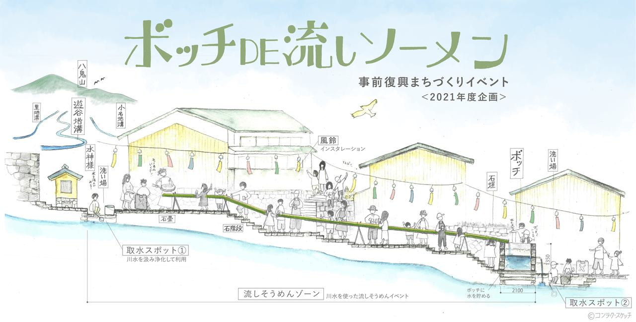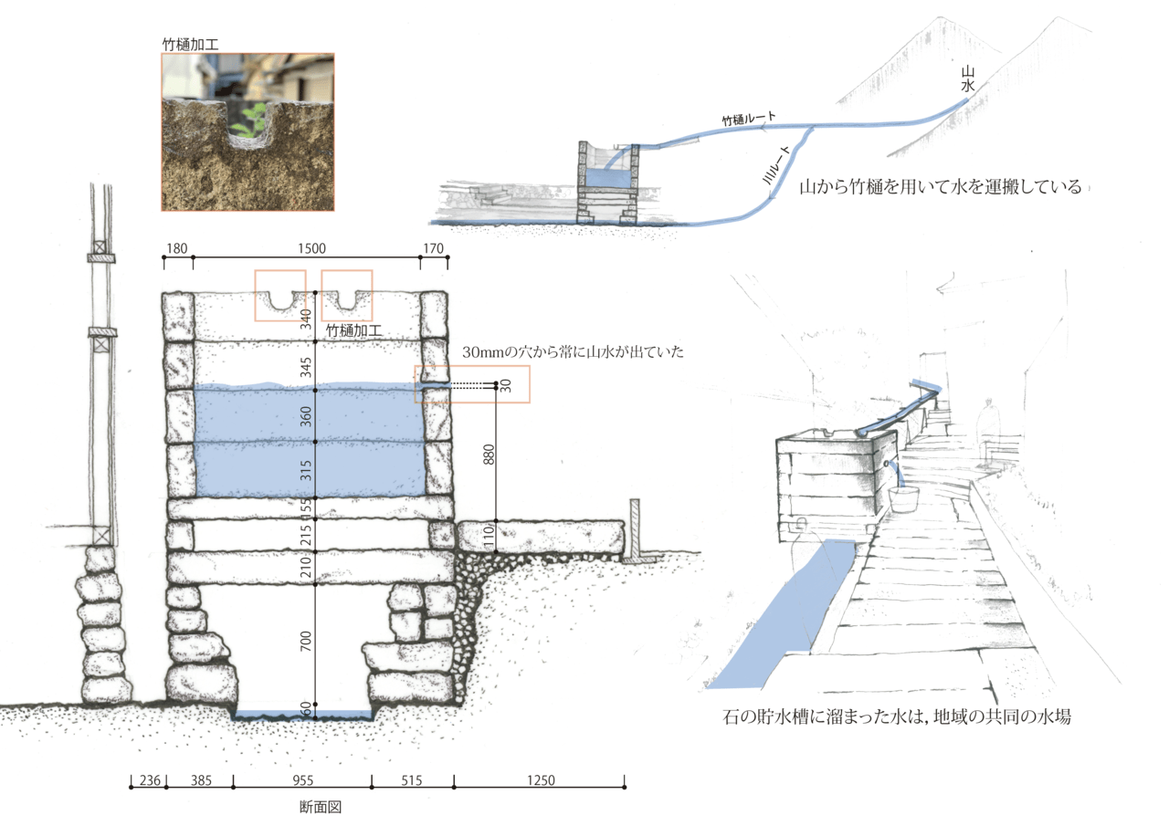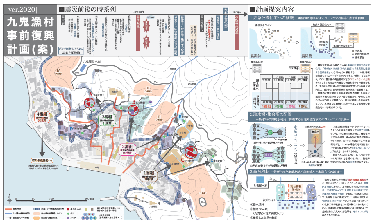 特集・3.11 職住一体の「まちづくり」(後編)—九鬼漁村の事前復興まちづくり— 2021.3.8 下田 元毅(しもだ もとき) 印刷する 漁村の⾵景と浸⽔域図(三重県尾鷲市九⻤町)先を⾒据えた「事前」を考えることは、「今」を考えることに繋がる。 計画を⽴案しても実⾏できなければ意味を成さない。 私たちは、「事前復興計画(案の提⽰)・まちづくり(実践)」を並⾏に⾏いながら、計画案を⾒直し、更新し続けていくことも重要であると考えている。 後編は、三重県尾鷲市九⻤漁村の「事前復興計画・まちづくり」の取り組みの初動を紹介したい。 九⻤漁村は、鰤の⼤敷網を基幹産業とする⼈⼝400名の⼩さな漁村である。紀伊半島東部の熊野灘に⾯するリアス式海岸の湾奥に⽴地し、標⾼差約50mの斜⾯地に等⾼線を刻むように密度⾼く住居が⽴地し、美しい屋並みの景観を創り出している。 漁村内は、幅0.6〜1.5mの細い路地が網の⽬状に⼊組み、⽴体的な⽯垣や⽯塀に誘導され、奥⾏きをもった路地空間を体感することができる。 九⻤漁村は、尾鷲市のハザードマップによると最⼤津波⾼さ17mが予測され、浸⽔域を地図上に重ねてみると約7割の住居が浸⽔する事となる。 ▼前編:事前復興計画とは 職住一体の「まちづくり」(前編)—事前復興計画という考え方— 九鬼漁村の事前復興計画図版作成:⼭本翔也(⼤阪⼤学⼤学院 建築・都市計画論領域 修⼠1 年)私たちは、九⻤漁村への調査・研究やまちづくりの継続的な関わりの中で、「九⻤漁村事前復興計画(案)」を⽴案し地域住⺠へ提⽰した。 計画(案)は、 ①空き家の状況(⼾数,分布,維持管理)などを踏まえ、浸⽔域外空き家の仮設住宅での活⽤可能性。 ②応急仮設住宅の建設候補地の選定や建設可能⼾数の算出。 ③被災後の避難先が各地にバラバラになり、コミュニティの問題があった東⽇本⼤震災を踏まえ、祭りのコミュニティ単位毎の避難先の提案。 ④被災後の断⽔などの⽔不⾜に備え、井⼾や河川利⽤した取⽔⽅法を把握し、⽣活⽤⽔の確保などの計画を盛り込んだ。 生活遺産「ボッチ」九⻤漁村内にある貯⽔槽(地域内の呼称:ボッチ)写真は、ボッチ(地域固有の呼称)と呼ばれる貯⽔槽である。 後背地の豊かな⼭⽔に恵まれた九⻤漁村では、幅0.4〜1.7 m の⼩さな河川上にボッチが設置され、⼭から⽵樋を利⽤して⽣活⽤⽔を確保していた。 上⽔道敷設後は、利⽤されることがなくなり現在のボッチは、⽣活遺産として存在している。 「ボッチ」を生かした事前復興まちづくりイベントボッチの断⾯図/スケッチボッチをよく観察すると、⾃然⽯を基礎とし、剛健な⽯組みと⽵樋の掛かるための繊細で細やかな加⼯が同居した設えになっている。 ボッチのすぐ下には、河川に降りる階段があり、かつての洗い場があるだけでなく、ボッチ横の路地の階段も扇状に広がっており、この場所がかつての井⼾端会議が⾏われていた⾵景が容易に想像できる。 私たちは、ボッチを九⻤固有の空間資源(かつての可視・不可視が重なるカタチ)として捉え、被災時の⽣活⽤⽔を確保する取⽔装置の役割として活⽤可能性を⽰すため、イベント(流しそうめん)の提案を⾏った。 事前復興計画に向け、地域の⼈々とまちづくりの実践を通して、事前の意識を⾼め理解を共有化していくことが⽬的である。 「流しそうめん」で共有する有事の行動断⾯スケッチ作成:江端⽊環(コンテク・スケッチ/⼤阪⼤学⼤学院 建築・都市計画論領域 博⼠1 年)現在、地域側に提案を⾏い、2021 年の夏に実施したいと準備を進めている。 準備を⾏う中⼼メンバーは、地域内外の地縁・⾎縁を含め九⻤にルーツのある⼈々で、10 代~30 代前半の世代を中⼼としたスキームを考案中である。 南海トラフ地震は30 年以内に80%の確率で発災すると予測されているため、30年後に地域の主体世代となるメンバーで実⾏することに意義を⾒出している。 さらに、その準備過程を経験しておくことは、有事の際の⾏動計画と同期することを想定している。 かつての九⻤漁村の取⽔の仕組みを流しそうめんという仕掛けとしてのイベントで再現することが、有事の際の⽔の確保にも有効に機能することを⽬的とした事前復興まちづくりとしての位置付けである。 残すべきもの、変えていくべきもの東⽇本⼤震災から10 年、復興のみならず、漁村に関わる暮らしや制度にも⼤きな変化があった10 年だったのではないだろうか。 これらの変化をつぶさに解読すると、漁村の主体性・⾃律性が求められる時代となる事は想像に難くない。 起こりつつある様々な変化と起こり得る⼤災害を別の事柄として捉えるのではなく、「事前」を思案することを契機に能動的な地域の更新の⽷⼝を⾒出すことが、漁村における東⽇本⼤震災から学ぶべき事項だと認識している。 SDGs近畿祭り下田 元毅(しもだ もとき)1980年伊豆生まれ・広島育ち.大手前大学 建築&芸術学部 講師. 建築・都市計画・まちづくりの観点から漁村の生活と生業の一体となった空間に関する調査・