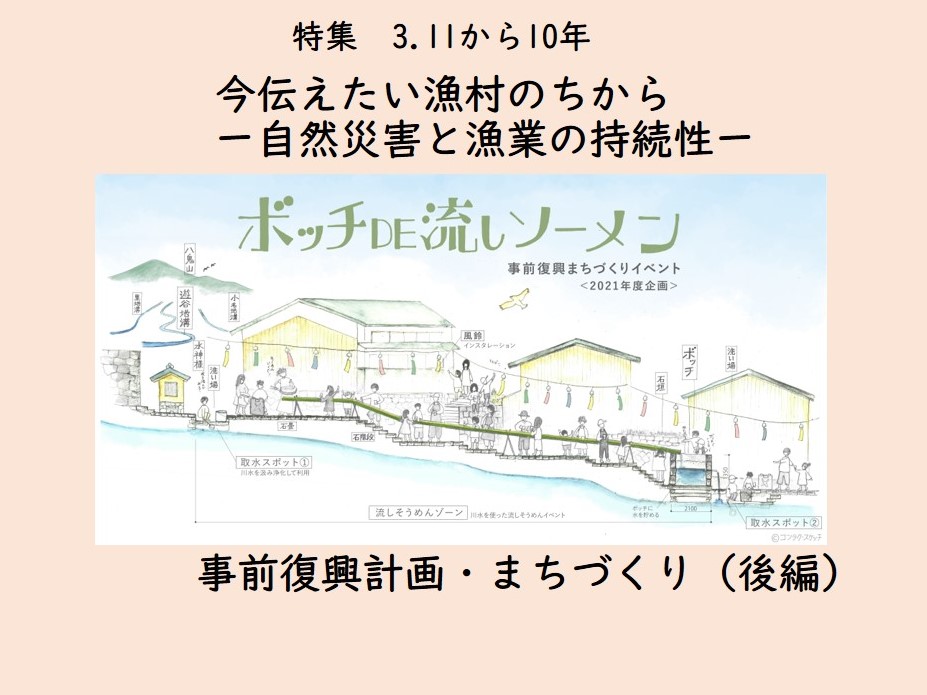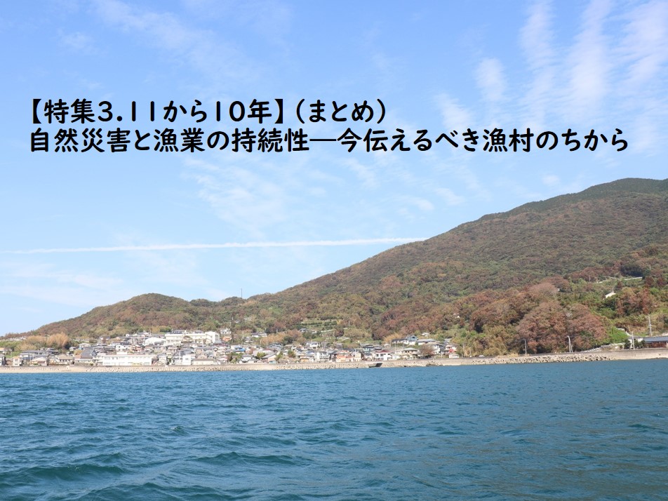 【特集3.11から10年】(まとめ)自然災害と漁業の持続性―今伝えるべき漁村のちから恵みをもたらすはずの海は、ときに私たちに猛威を振るう。 10年前、その現実を突きつけられた私たちは、その後も自然の怖さを目の当たりにしています。 3.11以降も、地震、爆弾低気圧や豪雨、台風など自然災2021.3.25特集・3.11JF全漁連編集部
