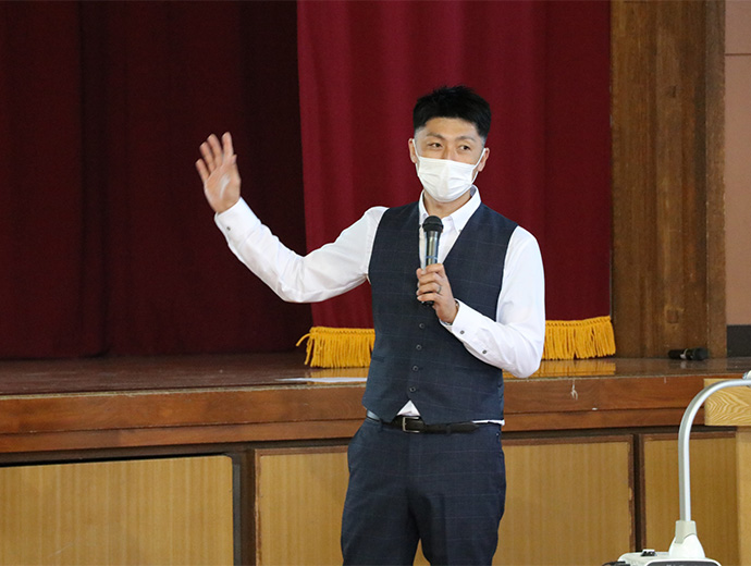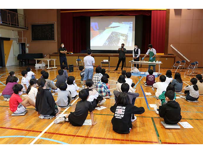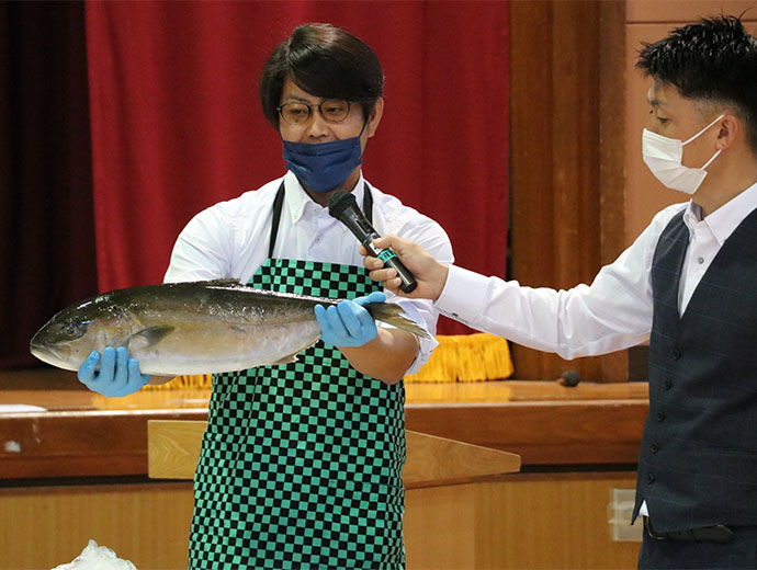 日本の漁師たち 若手漁師が東京・練馬区立春日小学校で出前授業 2022.11.1 JF全漁連編集部 印刷する 漁業協同組合青年部の全国団体であるJF全国漁青連は10月20日、練馬区立春日小学校で出前授業を実施しました。 春日小学校での出前授業は本年で6回目。JF全国漁青連の川畑友和会長(鹿児島・定置網)、尾崎勇太副会長(北海道・定置網)、竹内大生副会長(石川・底びき網)、阿部誠二副会長(宮城・刺し網)の4人が、新型コロナウイルス感染症対策を行った上で、実際に学校を訪問しました。 JF全国漁青連の役員4人が講師として登壇しました出前授業では、同校の5年生36人に、日本の漁業の特徴や漁師の一日、海を守る漁師の取り組みなどを写真や動画を使って説明したほか、川畑会長がカンパチの解体ショーを行い、児童らに漁業や魚、漁師の魅力を伝えました。 尾崎勇太副会長初めに尾崎副会長が地元北海道での定置網漁の動画を流しながら、どのように漁が行われているかをわかりやすく説明しました。大量のサケが船に引き上げられると、児童からは歓声が上がりました。 さらに尾崎副会長は、漁網が切れた時に対処するロープワークを披露。児童たちは手際のよさに「すごい」と驚いていました。 竹内大生副会長続いて、竹内副会長が底びき網漁について紹介し、多様な魚が獲れる面白さや、海洋環境が変化した影響で、大量のヒトデが網に入るなどの現状を説明しました。また、竹内副会長は底引き網漁で漁獲したナマコなどを加工し、付加価値をつけて販売する加工会社を経営していることを紹介し、漁業者の仕事の幅広さを伝えました。 川畑友和会長川畑会長は、魚介類の産卵場として重要なアマモなどの藻場を造成する取り組みを紹介しました。藻場が減少していることが水産資源の減少の一因になっていることを説明し、「漁師の仕事は魚を漁獲することだけではない。藻場を維持・構築する取り組みを展開することでSDGs(持続可能な開発目標)にも貢献している」と語りました。 その後、川畑会長は鹿児島県から直送したカンパチの解体ショーを行いました。間近で大きな魚が解体される様子に児童らは息をのみ、包丁が入るたびに感嘆の声が上がりました。 阿部誠二副会長質問コーナーでは、児童たちから「いちばん好きな魚は?」「オスとメスの見分け方を教えてほしい」など、たくさんの質問があり、阿部副会長ほか講師たちが丁寧に回答しました。 質問コーナーでは児童からの質問に丁寧に回答しました「1日の収入はどれぐらい?」との質問に対しては、講師たちが最高月収を打ち明ける一方、「自然が相手なので、全く魚が獲れない月もある。稼ぐためにはいつも勉強することが必要」と答えました。 最後に川畑会長が「漁師になりたいと思った人は?」と尋ねると多くの生徒たちが手を挙げていました。 イケメンJF全漁連漁協(JF)漁師若手中堅青年部イベントJF全漁連編集部漁師の団体JF(漁業協同組合)の全国組織として、日本各地のかっこいい漁師、漁村で働く人々、美味しいお魚を皆様にご紹介します。 地域産業としての成功事例や、地域リーダーの言葉から、ビジネスにも役立つ話題も提供します。 SakanadiaFacebookこのライターの記事をもっと読む