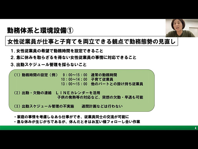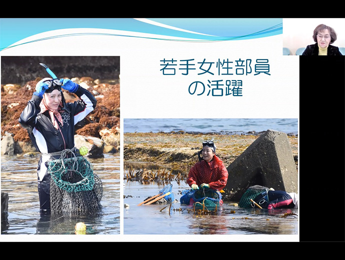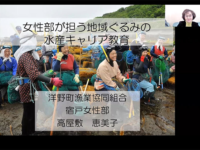 日本の漁師たち 漁村女性の活躍へ! 「第23回 JF全国女性連フレッシュ・ミズ・プログラム」開催 2022.12.13 JF全漁連編集部 印刷する JF全漁連は11月22日、「第23回JF全国女性連フレッシュ・ミズ・プログラム」をオンライン開催しました(共催:JF全国女性連)。 このプログラムは、漁協女性部員および若手の漁村女性が将来の女性部活動を担うべき人材となるための一助として、また早期段階における横断的な人的ネットワークや経験を会得することを目的に、毎年開催されています。 昨年、一昨年に続き本年も新型コロナウィルス感染症対策のためオンラインでの開催となり、若手を含む漁村女性部員がオンライン参加しました。 「私たちは浜のインフルエンサー!」が本年のテーマ本年は「私たちは浜のインフルエンサー!」をプログラムテーマに、漁村女性の優良事例報告をはじめ、農業分野での優良事例や他分野で活躍する女性の特別講演が行われました。 オンラインで交流した登壇者と参加者のみなさん事例1:体験学習を経て5人が漁業者に&新規女性漁業者も続々!漁村女性部の優良事例として発表を行ったのは、洋野町漁業協同組合宿戸女性部(岩手県洋野町)の高屋敷恵美子さん。令和3年度農山漁村女性活躍表彰で全国漁業協同組合連合会長賞を受賞した活動を、「女性部が担う地域ぐるみの水産キャリア教育」と題し紹介しました。 洋野町漁業協同組合宿戸女性部の高屋敷恵美子さん現在女性部では宿戸地区において、小学生から高校生にかけて切れ目なくそれぞれの学齢期に適した体験学習を実施しています。 活動のきっかけとなったのは、浜で遊ぶ子供たちの減少でした。浜の楽しさを知らないままでは将来の浜を支える人が育たないという危機感を抱き、地元の子供たちを対象とした体験学習活動がスタート。稚ウニ放流やウニの漁獲・加工、サケの加工品「さけトバ」作りなどの体験活動のほか、加工した商品を修学旅行先で販売する販売体験、豊かな海をつくるための植樹体験など、漁獲だけにとどまらない、さまざまな漁業関連の体験活動を行ってきました。 これらの活動を継続してきた結果、現在までに参加生徒の中から5人が宿戸地区の漁業者として就業。また女性部の活動が活発に続くなか、本年度は2人の若い女性が漁業者としてデビューしたほか、地区の女性2人が新たに漁業士となり、活躍しています。 新たな担い手や若い漁業者が増えてきたことから、今後はSNSなどの新しい情報発信手段も活用して、地元水産物の認知向上にもつなげていきたいと語りました。 事例2:SNSも活用。「お互い様」のフォロー体制で就労環境改善次に事例発表を行ったのは株式会社村上農園代表取締役の村上枝里さん。令和3年度農山漁村女性活躍表彰で農林水産大臣賞を受賞した活動を、「女性の活躍の場を広げるために取り組んだ就労環境改善」と題して発表しました。 ご自身も3人の子育て中の村上さん。仕事をすると子ども主体で動くことが難しいと感じた経験に基づく企業方針の一つ、「出産後の女性の社会復帰の場として気軽に働ける場所づくり」について、LINEカレンダーの活用や、時短勤務などの柔軟な勤務時間設定、急な休みが必要な女性でも無理なく就労できる組織づくりなど、不可能を可能に変えた新しい取り組みを紹介しました。 株式会社村上農園 代表取締役 村上枝里さん働きやすい環境、やりがいのある仕事は、結果として従業員の若返りや雇用安定化を実現。販売額や経営面積のアップという成果にもつながってきました。 今後も「女性が活躍できる環境づくり」を続けることで、「たくさんの女性たちと一緒に笑いながら仕事をしていきたい」と語りました。 情報共有:人生100年時代の「お金の話」全国共済水産業協同組合連合会普及・研究部次長の部原一弘さん情報提供の部では全国共済水産業協同組合連合会普及・研究部次長の部原一弘さんより、「知っトク!いまどきの『お金』の話~年金や介護は若いうちから備えておこう~」と題し、人生100年時代に知っておきたい「お金の話」が紹介されました。 特別講演:平日会社員×育児×発酵料理研究家の活動の秘訣は・・・?最後に、Sakanadiaライターでもあり、発酵料理研究家でCozy Kichen(コージーキッチン)代表の高木佐知子さんより、「発酵子育てキッチン~無理なく続けることが大切~」と題した記念講演がありました。 ▶Sakanadia/ライター高木佐知子さんの紹介&記事一覧ページ https://d2ibfa0z4fy1bq.cloudfront.net/writer/takagi_sachiko/ Cozy Kitchen代表の高木佐知子さん小学生を含む3人の子育てをしながら平日フルタイム会社員として働きつつ、発酵料理研究家として執筆活動や講演活動、レシピ・メニュー開発などの活動を続ける高木さん。活動のスタートは3人目のお子さんの育児休業期間中という、女性としては育児と家庭と仕事に最も忙しい時期のことでした。 多忙極める日々のなかでどうやって活動を続けているのか・・・? 平日のタイムスケジュールを公開し