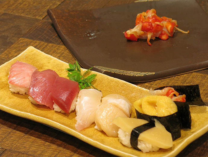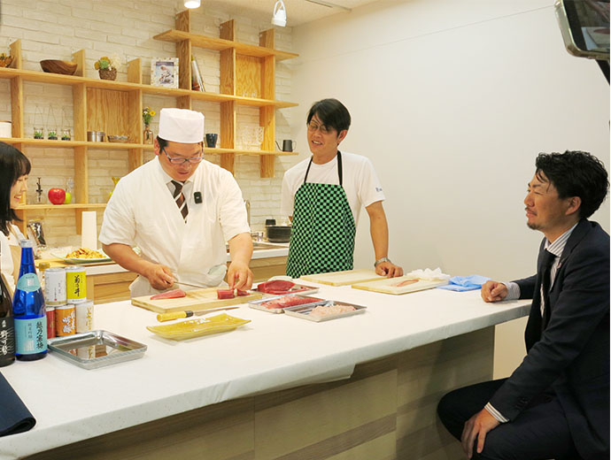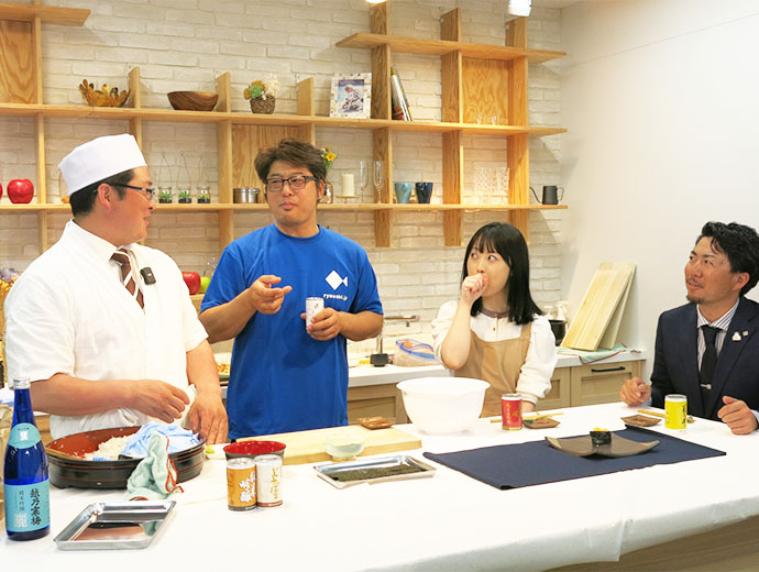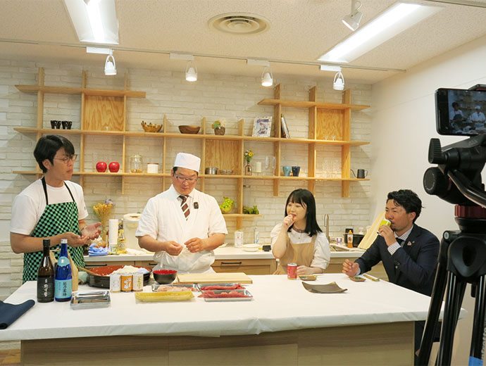 日本の漁師たち 漁業と農業の若手がコラボ!自慢の海産物と農作物をおいしく料理して動画でPR 2023.4.24 JF全漁連編集部 印刷する 漁業協同組合青年部の全国団体であるJF全国漁青連は4月14日、農業協同組合青年部の全国団体である全国農協青年組織協議会(JA全青協)とともに、国産品の魅力やおいしさをPRするコラボレーション企画を始動させました。 コロナ禍の中、「食に携わる一次産業の仲間として手を携えたい」というJA全青協執行部からの呼び掛けで2団体の交流がスタート。これまでWEBによる交流会を3回開催し、互いの活動について情報交換するなど、ともに一次産業をけん引する同志として親睦を深めてきました。 今回はその交流会の中で発案されていたコラボ企画の実現。「より多くの人にそれぞれの自慢の海産物・農作物の魅力を知ってもらおう」と、両団体が協力し動画制作に乗り出しました。 動画では、双方の役員がそれぞれの産品を持ち寄り、その魅力を紹介しながら調理し、実食する模様を紹介します。 北海道産の天然ホタテ貝を手渡す尾崎勇太JF全国漁青連副会長(右)と、前職板前の折笠明憲JA全青協理事(左)川畑友和JF全国漁青連会長(左)に北海道のブランド米「ゆきさやか」を手渡す稲村政崇JA全青協副会長(右)。「粘りすぎず粒が大きくお寿司にピッタリだと思って持ってきました」と、今回の企画ためにセレクトしたお米を紹介しました東京・大手町のアグベンチャーラボで行われた1回目の撮影では、JF全国漁青連は鹿児島のヨコワ(クロマグロの幼魚)とマダイ、北海道のホタテ、宮城県のホヤ、石川県のアカニシ貝を、JA全青協は北海道のブランド米「ゆきさやか」、京都の朝獲れタケノコを持参。 それぞれの食材の特徴や魅力を紹介し、前職板前で寿司も握っていたというJA全青協の折笠明憲理事が「握り寿司」で腕を振るう様子が収録されました。 竹内大生JF全国漁青連副会長(左から2番目)は石川県から持参したアカニシ貝を紹介。リアルでは初対面の面々ですが、一緒においしいものを食べ、すっかり打ち解けた様子で撮影は進みました阿部誠二JF全国漁青連副会長(左から2番目)が宮城県から持参したホヤは軍艦に。「ヘソ」といわれる部分は内臓に触れず、冷凍にすると甘みが増す部位と説明川畑JF全国漁青連会長が鹿児島県から持参した、クロマグロの幼魚「ヨコワ」に、「まさか東京でこの魚が味わえるとは!」という感嘆の声が出汁で煮たという朝獲れの京都産タケノコもお寿司に漁業と農業に従事する参加者それぞれが各地から持参した選りすぐりの新鮮食材で、ここでしか食べられない超贅沢な一皿が完成しました。 動画は今年の夏ごろ、JF全国漁青連とJA全青協のそれぞれのホームページなどで公開予定です。 配信開始後にはまた、サカナディアFacebookでもお知らせします。どうぞお楽しみに! JF全国漁青連とJA全青協のメンバーでコラボ始動のガッツポーズ!今後の活動に注目ですSakanadia関連記事:交流会過去開催のレポート ▶【漁業×農業】JF全国漁青連がJA全青協とWEB交流会 ▶【漁業×農業】JF全国漁青連がJA全青協とWEB交流会2022 協同組合漁師青年部JF全漁連編集部漁師の団体JF(漁業協同組合)の全国組織として、日本各地のかっこいい漁師、漁村で働く人々、美味しいお魚を皆様にご紹介します。 地域産業としての成功事例や、地域リーダーの言葉から、ビジネスにも役立つ話題も提供します。 SakanadiaFacebookこのライターの記事をもっと読む