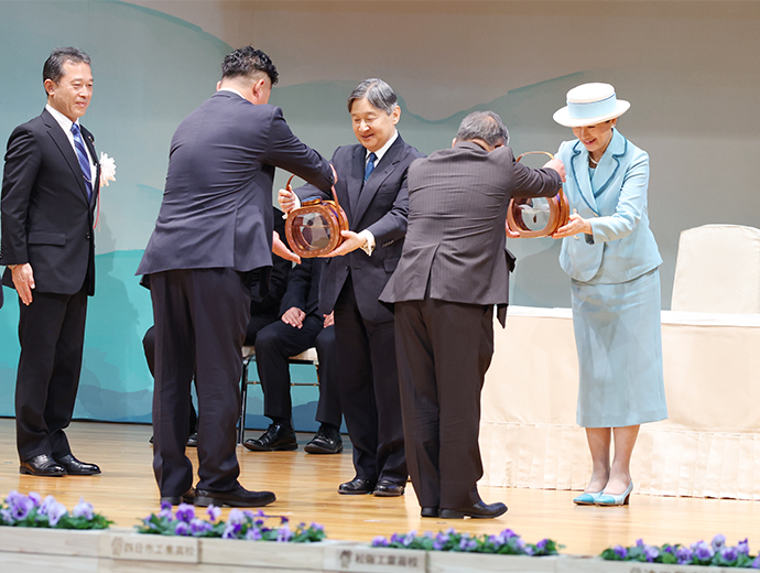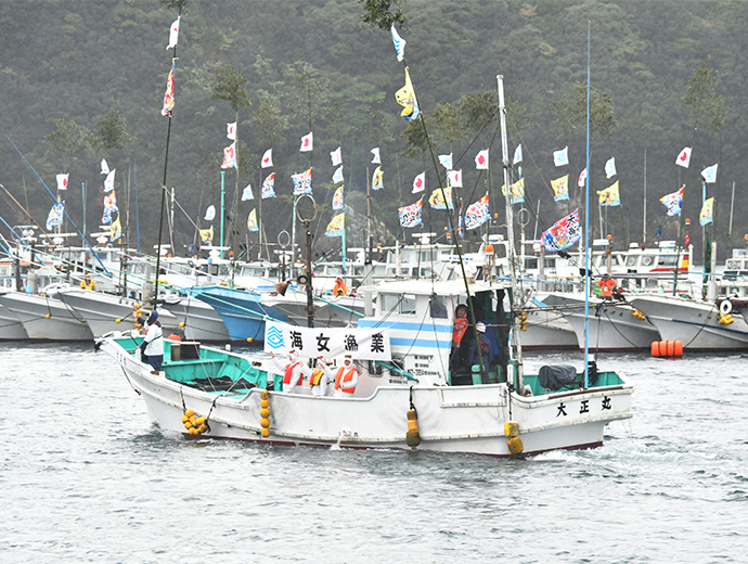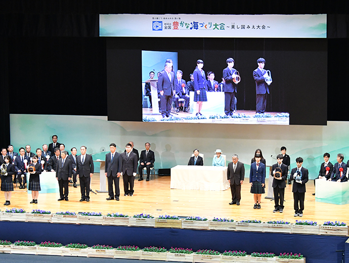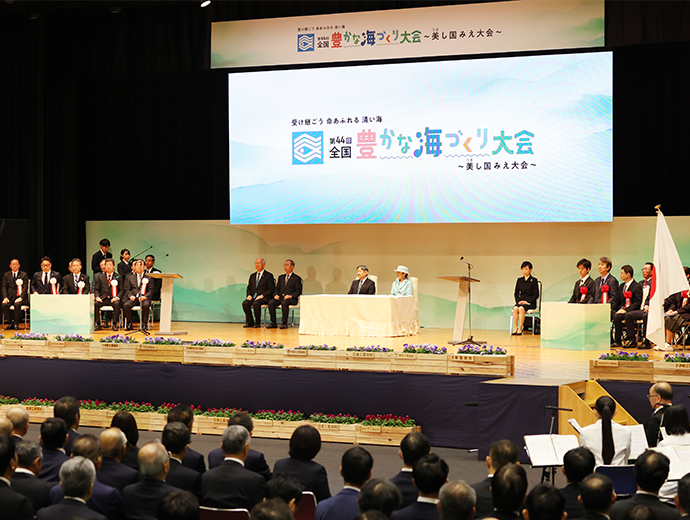 海と魚を守る 第44回全国豊かな海づくり大会、三重県で開催 2025.12.3 JF全漁連編集部 印刷する 大会テーマは「受け継ごう 命あふれる 清い海」第44回全国豊かな海づくり大会が11月9日、天皇・皇后両陛下ご臨席の下、三重県志摩市と南伊勢町で開催され、式典行事、海上歓迎・放流行事などが行われました。三重県での開催は、1984年に志摩郡浜島町(現:志摩市浜島町)で行われた第4回以来、41年ぶり2度目です。 今大会のテーマは「受け継ごう 命あふれる 清い海」。大会を通して、水産資源の保護・管理、海や河川などの水域環境保全、自然環境を守っていくことの重要性を三重県内外へ周知するとともに、豊かな海の再生に取り組む漁業者の姿と県産水産物の魅力などを全国に広くPRしました。 式典行事の模様天皇・皇后両陛下ご臨席の下、式典行事を開催式典行事は、志摩市阿児アリーナで開催され、濱口慶太JF三重漁連会長の開会の言葉で幕を開けました。 全国豊かな海づくり大会会長の額賀福志郎衆議院議長は「古くから『美うまし国』と呼ばれる三重県は、海の幸が豊富にあり、全国的に著名な水産物の宝庫となっている。海洋や河川と豊かな関係を育んできた三重県において、本大会を41年ぶりに開催することができ、嬉しく思う」、一見勝之三重県知事は「第4回大会の開催を契機に本県ではマダイやアワビなどの種苗放流、ハマグリやイセエビなどの資源管理、藻場・干潟造成などを推進し、漁業関係者が一丸となって豊かな海づくりに取り組んできた。そして、本大会の開催を契機に、豊かな海を恵みを守り、育て、未来へ繋げていく歩みを世代を超えて進めていく」と挨拶。その後、橋爪政吉志摩市長が歓迎の言葉を述べました。 式典行事の模様(代表撮影)その後、天皇陛下から「豊かな海の環境を保全するとともに、水産資源を適切に保護・管理し、次世代に引き継いでいくことは、私たちに課せられた大切な使命です。近年、気候変動の影響など、多くの課題に直面している漁業関係者の皆さんには御苦労も多いことと思いますが、本日表彰を受けられる方々を始め、全国各地において日頃から豊かな海づくりに取り組んでいる皆さんの活動が、今後とも多くの人々によって支えられ、更に発展していくことを希望します」とのおことばを賜わりました。 おことばを述べる天皇陛下(代表撮影)功績団体等表彰では、額賀大会会長、鈴木憲和農林水産大臣、石原宏高環境大臣、藤田仁司水産庁長官、一見三重県知事が、それぞれ各賞代表者に表彰状を手渡しました。続いて、作文コンクールで最優秀作文を受賞した川原瑠心さん(鳥羽市立答志中3年)による作文「海苔で伝える海の危機」の発表、大会開催を記念して放流されるマハタ、アコヤガイ、クロノリ・アオノリ、アマゴの「稚魚等のお手渡し」、若手漁業者らによる「海づくりメッセージ」が行われました。 稚魚等のお手渡し(代表撮影)その後、坂本雅信大会推進委員会会長(JF全漁連会長)が大会決議を朗読、満場の拍手をもって採択されました。 大会決議を朗読する坂本大会推進委員会会長最後に、一見三重県知事から次期開催地の吉村洋文大阪府知事へ大会旗の引き継ぎが行われました。 式典行事後にはイセエビとマダイをご放流稚魚などをご放流する天皇・皇后両陛下海上パレードの模様式典行事後の海上歓迎・放流行事は、宿田曽漁港(南伊勢町)の特設会場で行われました。両陛下は式典行事に引き続き、ご臨席され、三重県内の漁船や調査船などによる海上パレードをご観覧された後、額賀大会会長、坂本大会推進委員会会長らとイセエビとマダイの稚魚をご放流されました。 次回大会は、来年11月15日に大阪府の岸和田市と泉佐野市で開催する予定です。 JF全漁連漁協(JF)漁師資源管理近畿イベントJF全漁連編集部漁師の団体JF(漁業協同組合)の全国組織として、日本各地のかっこいい漁師、漁村で働く人々、美味しいお魚を皆様にご紹介します。 地域産業としての成功事例や、地域リーダーの言葉から、ビジネスにも役立つ話題も提供します。 SakanadiaFacebookこのライターの記事をもっと読む