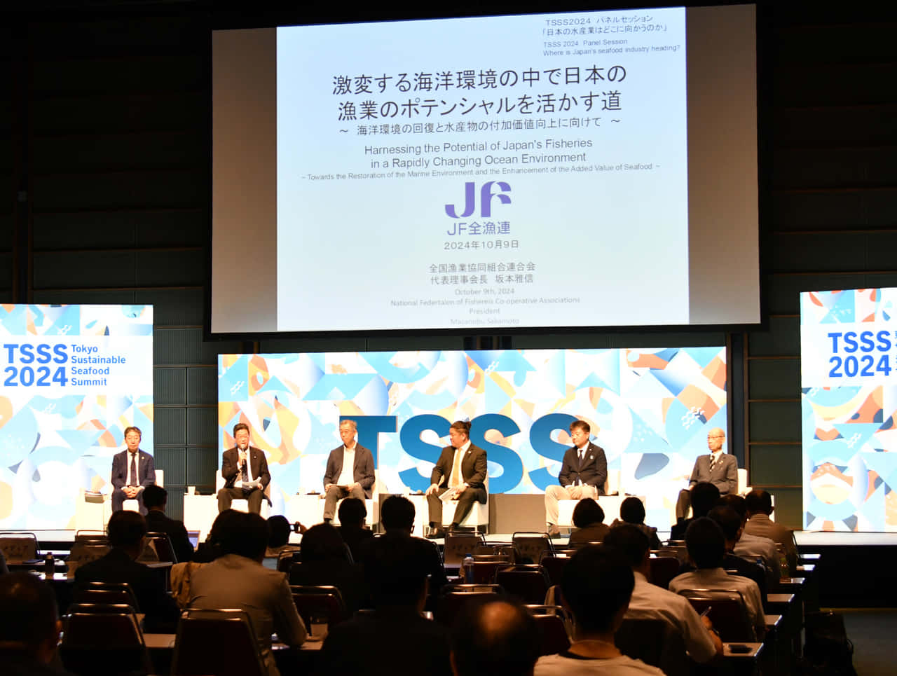 SDGsと漁業 「日本の水産業はどこに向かうのか」をテーマにしたパネルディスカッションに坂本会長が登壇 【TSSS 2024】 2024.10.25 JF全漁連編集部 印刷する 持続可能な水産業の実現を目指して、水産関係者が水産の未来について話し合う「東京サステナブルシーフード・サミット(TSSS)」(主催:シーフードレガシー、日経ESG)。 10回目となる今年は10月8~10日の3日間、東京国際フォーラム ホールB7で開催されました。 パネルディスカッションの模様10月9日には、「日本の水産業はどこに向かうのか」をテーマにしたパネルディスカッションが行われ、パネリストとしてJF全漁連の坂本雅信会長のほか、一般社団法人 大日本水産会の枝元真徹会長、東京大学大学院農学生命科学研究科の八木信行教授、株式会社臼福本店の臼井壯太朗社長、一般社団法人マリン・エコラベル・ジャパン協議会の垣添直也会長が登壇(モデレーター:株式会社シーフードレガシーの花岡和佳男社長)。 それぞれの立場から、海洋環境、資源管理、漁業・漁村の持続可能性、透明性の追求などをキーワードに、2030年への道筋について意見を交わしました。 意見を述べる坂本会長坂本会長は日本の漁業の進むべき道として、①海洋環境が激変する中で、資源と環境を同時回復させる「環境回復型の漁業・養殖業」の実践による「豊かな海」づくりを推進すること、②漁獲量が減少している中にあっても、消費者の皆さまの理解の下、日本の漁業が持っているポテンシャルを活かして、水産物の付加価値を高め、漁業産出額を向上させることを挙げました。 そして、「我々はこのような取り組みを行うことにより、国民の皆さまに安全・安心かつ多種多様な水産物を安定供給し、食料安全保障の責任を果たしていく。そして、漁業者の経営を子々孫々まで継続していくことが目標だ」と語りました。 JF全漁連編集部漁師の団体JF(漁業協同組合)の全国組織として、日本各地のかっこいい漁師、漁村で働く人々、美味しいお魚を皆様にご紹介します。 地域産業としての成功事例や、地域リーダーの言葉から、ビジネスにも役立つ話題も提供します。 SakanadiaFacebookこのライターの記事をもっと読む