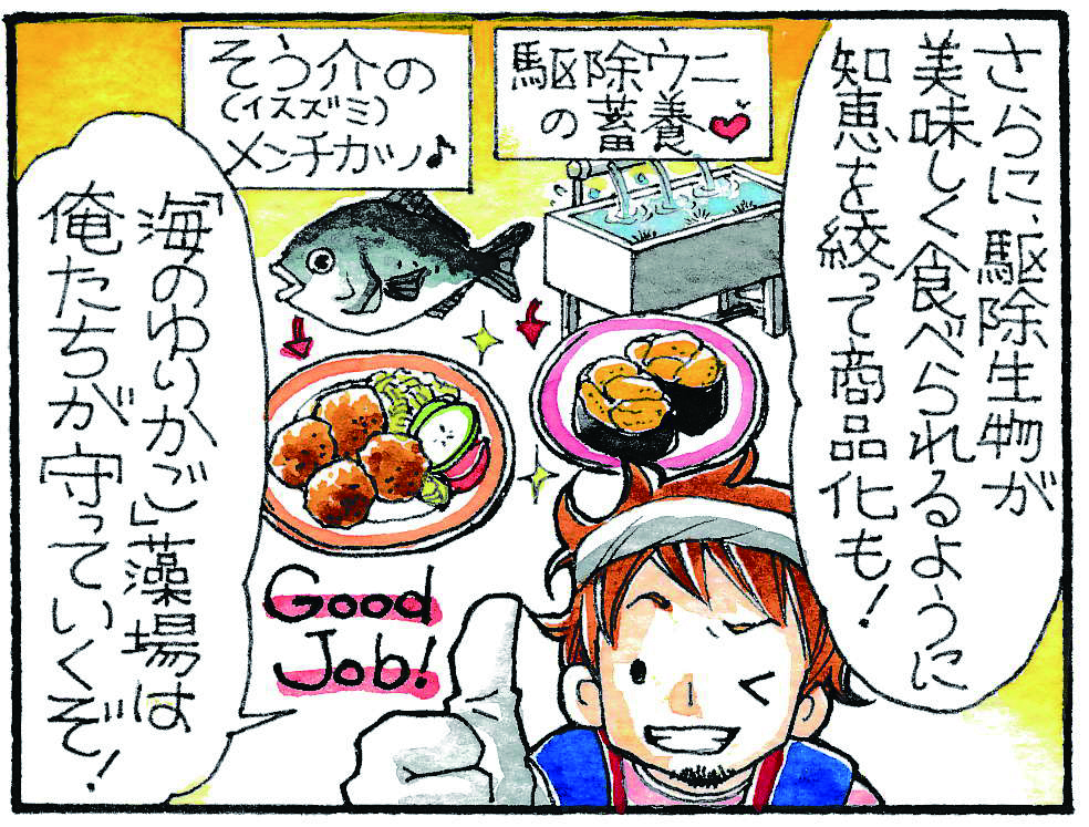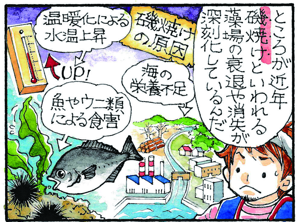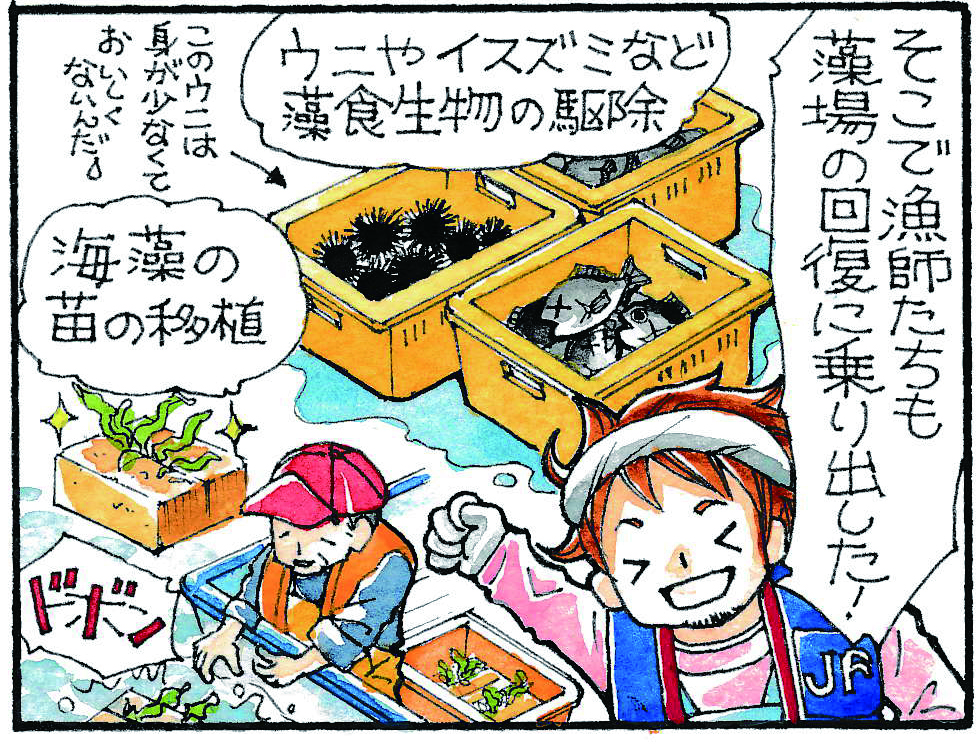 海と魚を守る 【漫画でわかる】日本の魚の資源管理 第3話「藻場の回復」 2019.12.11 古結 あかね(こげつ あかね) 印刷する 守りながら利用する今回は、魚が棲む場所を管理する漁師たちの取り組みをご紹介! 「海のゆりかご」と呼ばれる「藻場(もば)」(海藻やアマモが生い茂る場所)を守ることは、豊かな資源を守ることにつながる。 漁師たちは、研究者や専門家、地域の住民らと一緒に試行錯誤しながら、増えすぎたウニを間引いたり(ウニ駆除、ウニ移植)、海藻の苗を植えたりとさまざまな取り組みを行っている。 この取り組みの詳細はひとうみ.jpで。 文:JF全漁連編集部 ※旬や産地があるように、日本の漁業は地域によって多様です。ここで紹介する情報は必ずしも皆が同じようにやっていることではありません。実際は、とる魚、場所、方法に合わせていろいろな工夫を組み合せてやっています。 資源管理古結 あかね(こげつ あかね)漫画家。埼玉県在住。角川書店(現KADOKAWA)でデビュー。 ラブコメ、ホラー、ファンタジー、歴史ものなど様々なジャンルで執筆。 企業PRや地域観光、学習教材のイラスト等にも活動の幅を広げる。 Sakanadiaでは、難しい漁業のはなしを、楽しくわかりやすく4コマ漫画でお伝えします。このライターの記事をもっと読む 【漫画でわかる】日本の魚の資源管理プロローグ「漁業は自然とのおつきあい」2019.11.14 【漫画でわかる】日本の魚の資源管理 第1話「網目拡大」2019.11.14 【漫画でわかる】日本の魚の資源管理 第2話「再放流」「サイズ制限」2019.11.26