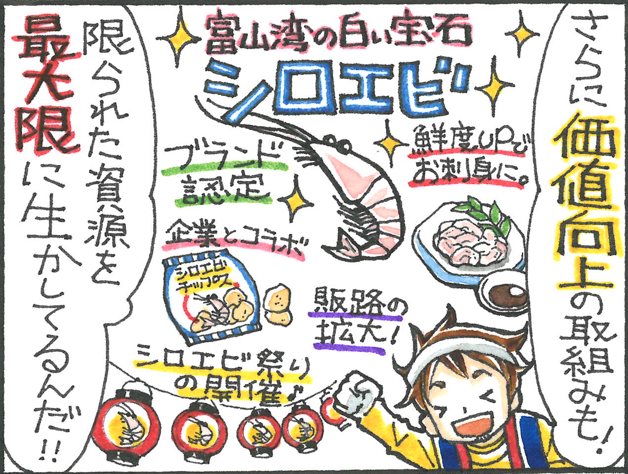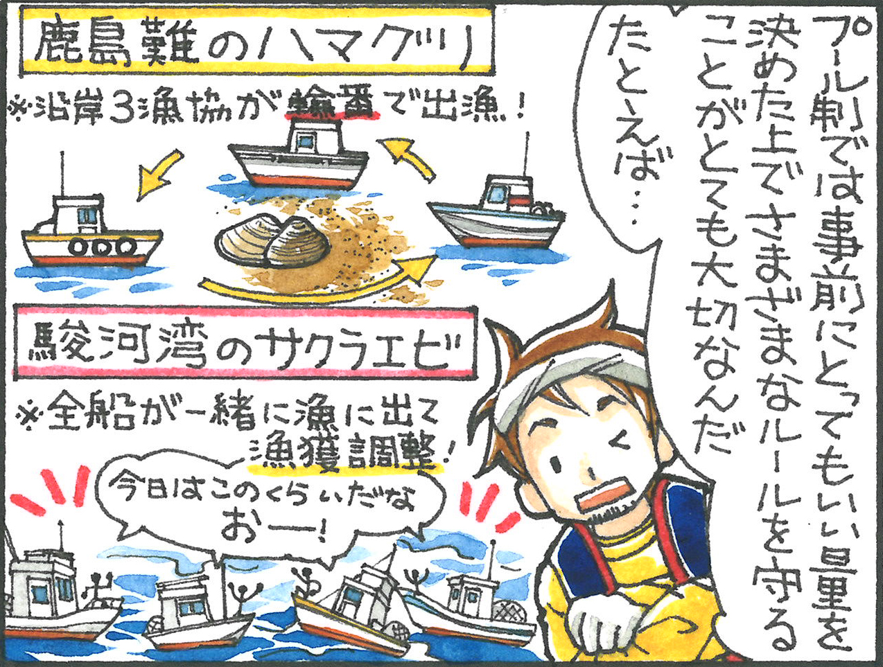 海と魚を守る 【漫画でわかる】日本の魚の資源管理 第8話「プール制」 2020.2.21 古結 あかね(こげつ あかね) 印刷する シェアして守る「プール制」水産資源を守るために魚を捕りすぎないようにするばかりでは、漁師の経営がピンチになってしまう。 水産資源を守りながら、より多くの仲間が経営を安定させられるように考えられた方法が「プール制」だ。 あらかじめ捕って良い量を決めて、ルールを統一することで、過剰な競争も抑えられる。 資源管理と経営を両立させるための、漁師たちの知恵だ。 文:JF全漁連編集部 ※旬や産地があるように、日本の漁業は地域によって多様です。ここで紹介する情報は必ずしも皆が同じようにやっていることではありません。実際は、とる魚、場所、方法に合わせていろいろな工夫を組み合せてやっています。 資源管理古結 あかね(こげつ あかね)漫画家。埼玉県在住。角川書店(現KADOKAWA)でデビュー。 ラブコメ、ホラー、ファンタジー、歴史ものなど様々なジャンルで執筆。 企業PRや地域観光、学習教材のイラスト等にも活動の幅を広げる。 Sakanadiaでは、難しい漁業のはなしを、楽しくわかりやすく4コマ漫画でお伝えします。このライターの記事をもっと読む 【漫画でわかる】日本の魚の資源管理プロローグ「漁業は自然とのおつきあい」2019.11.14 【漫画でわかる】日本の魚の資源管理 第1話「網目拡大」2019.11.14 【漫画でわかる】日本の魚の資源管理 第2話「再放流」「サイズ制限」2019.11.26 【漫画でわかる】日本の魚の資源管理 第3話「藻場の回復」2019.12.11 【漫画でわかる】日本の魚の資源管理 第4話「あえての非効率」2019.12.24 【漫画でわかる】日本の魚の資源管理 第5話「期間・時間制限」2020.1.17 【漫画でわかる】日本の魚の資源管理 第6話「一日数量制限」2020.1.28 【漫画でわかる】日本の魚の資源管理 第7話「森を守り、魚を守る」2020.2.5 【漫画でわかる】日本の魚の資源管理 第8話「プール制」2020.2.21