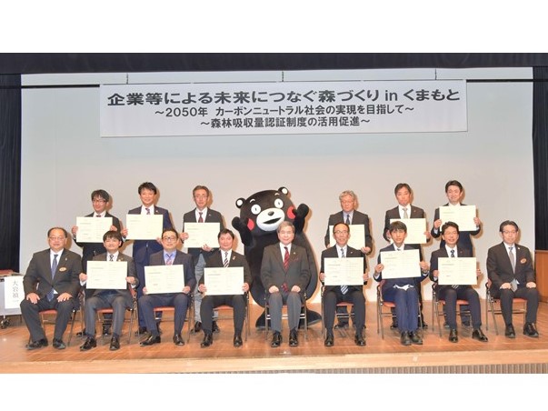 海と魚を守る JF全漁連、「熊本県森林吸収量認証書」を交付されました。くまモンも記念撮影に参加! 2022.3.3 JF全漁連編集部 印刷する 企業等による未来につなぐ森づくり in くまもと2022年1月12日(水)に熊本市民会館で「企業等による未来につなぐ森づくり in くまもと」が開催されました。 JF全漁連は、熊本県「漁民の森 南阿蘇」での植樹活動に対して令和2年度(2020年度)の年間8.75t-CO2/年が認証され、森林整備活動によって吸収された二酸化炭素量の認証書の「熊本県森林吸収量認証書※1」が熊本県の蒲島郁夫知事より交付されました。 また、交付式では、熊本県の営業部長兼しあわせ部長の「くまモン」が参加し、盛り上げてくれました。 撮影のためマスクをはずしています。 ©2010熊本県くまモン 撮影日:2022年1月12日 主催者コメント(抜粋) 「今年度は、ここに御出席の12の企業・法人の皆さまから申請をいただき、合計322二酸化炭素トンの認証ができました。私は、『2050年までに県内CO2の排出を実質ゼロにすること』を宣言し、県民や事業者の皆さまと連携し、地球温暖化防止の取組みを進めていくこととしています。『森づくり活動※2』は、SDGsや地球温暖化防止に貢献する社会の模範となる取組みです。県としても精一杯支援して参ります」 授賞式に出席したJF全漁連・総合管理部の守屋大部長のコメント 「今後も継続して、豊かな森、豊かな海を育む活動を推進し、SDGsに貢献していきます」 ※1、「熊本県森林吸収量認証制度」とは 「熊本県森林吸収量認証制度」は、企業等が「森づくり活動(森林整備・保全活動)」を通じて企業等のCSR(社会貢献活動)として「熊本県地球温暖化の防止に関する条例」に基づく補完的手段や、カーボン・オフセットの取組みとして活動できる認証制度です。 熊本県WEBサイト内「熊本県森林吸収量認証制度」 ※2、熊本県での「森づくり活動」とは 熊本県WEBサイト内「熊本県企業・法人等との協働の森づくり~企業の森づくりのサポート~」 2013年から続く、JF全漁連の熊本県「漁民の森 南阿蘇」での植樹活動漁民の森 南阿蘇漁業者による植樹活動は「豊かな海は、豊かな森で生まれた養分が川を通じて海に流れてくることから生まれる」ことから、全国各地で実施されています。 JF全漁連の、熊本県「漁民の森 南阿蘇」での植樹活動は、2013年のJF全漁連60周年を記念事業として実施しました。森と川と海が相互に果たしている役割を再確認し、豊かな森、豊かな海を育むことを目的としています。 2013年以降も、CSR活動の一環として継続しています。 2013年の植樹活動の様子JF全漁連漁協(JF)SDGs漁師九州JF全漁連編集部漁師の団体JF(漁業協同組合)の全国組織として、日本各地のかっこいい漁師、漁村で働く人々、美味しいお魚を皆様にご紹介します。 地域産業としての成功事例や、地域リーダーの言葉から、ビジネスにも役立つ話題も提供します。 SakanadiaFacebookこのライターの記事をもっと読む