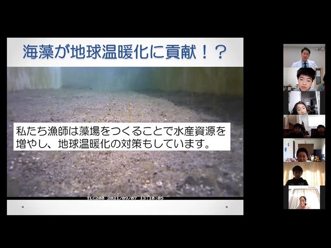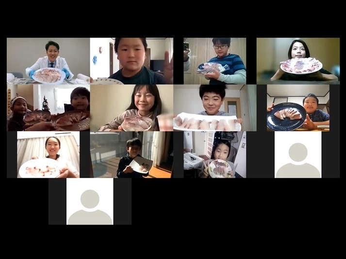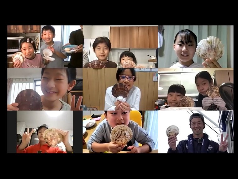 日本の漁師たち JF全国漁青連がオンライン子ども大学「こどハピ」で出前授業 2021.12.17 JF全漁連編集部 印刷する JF全国漁青連は10月31日、11月14日、27日の全3回、株式会社シンシアージュが運営するオンライン子ども大学「こどハピ」で、全国の小学生を対象にオンライン出前授業を実施しました。 講師をつとめたのは、JF全国漁青連役員の3人の若手漁業者。滋賀県の中村清作さん(JF全国漁青連会長)、鹿児島県から川畑友和さん(同副会長)、岩手県から平子(たいこ)昌彦さん(同理事)が、それぞれ現地から中継し授業を行いました。 全3回、定員を大幅に上回る応募があったため、抽選を行い、各回10組の小学生が参加しました。 授業はそれぞれテーマを設け、日本の漁業のことや漁師のこと、魚のことについて漁師目線で学ぶプログラムを用意しました。 * * * 【岩手編】東北の海で発見いっぱい! 漁師になりきる養殖体験ツアー10月31日に実施した岩手編では、平子さんがホタテ養殖の現場を中継。船で養殖場に向かうところからスタートしました。 「え!?すごい!本物?!」「船の中ってこうなってるんだ~!」と、始めて見る漁師の姿にテンションが上がる子どもたち。 岩手県の平子(たいこ)昌彦さん(JF全国漁青連理事)養殖場につくと、平子さんが海中の映像を見せながらホタテ養殖の方法を説明します。さらに、ホタテを海から引き上げ、殻についた付着生物などを取り外す作業も実演し、海で育てたホタテが食卓に届くまでを丁寧に説明しました。 参加者は自宅に事前の届いたホタテで、ホタテの殻向きにも挑戦。平子さんがホタテの殻向きを手ほどきすると、「まだ生きてる!」と新鮮なホタテを前に驚く参加者の声が飛び交います。 最後に、試食をすると、参加した子どもたちは「おいしい!」「あま~い」と笑顔いっぱいに感想を述べました。 * * * 【滋賀・琵琶湖編】琵琶湖から漁師がお届け! その魚がちょ~新鮮なのはなぜ?11月14日に実施した滋賀・琵琶湖編では、中村さんが琵琶湖をバックに登場しました。 「みんなは琵琶湖の魚を食べたことがありますか?」と問いかけると、今回初めて食べると答える参加者が多数。参加者に事前に届けた「ビワマス」が琵琶湖でしか獲れない貴重な魚であることを説明し、参加者を驚かせました。 滋賀県から中村清作さん(JF全国漁青連会長)続いて、中村さんが事前に録画した動画で、琵琶湖から望む美しい景色とともに琵琶湖での漁業の様子を紹介。定置網を設置するための作業など、普段見ることができない漁師の手仕事を披露しました。 滋賀・琵琶湖編の授業のテーマである、「魚の鮮度を保つ工夫」の説明では、漁協の生けすに泳ぐフナを使って「活締め」と「神経締め」を実演。ゆっくりと手間をかけて魚を処理する様子を子どもたちは食い入るように見ていました。 最後に、みんなでビワマスを捌いて試食。中村さんが丹精込めて鮮度保持の処理をしたビワマスを口にすると、「おいしい!」の言葉が止まりませんでした。 * * * 【鹿児島編】漁師目線で海の中を探検! おいしい魚が育つ豊かな海とは?11月27日に実施した鹿児島編では、川畑さんが冒頭、鹿児島魚市場から中継しました。漁港から見える桜島などの景色を紹介しましながら、昨年10月にオープンしたばかりの魚市場の中を案内しました。 鹿児島から川畑友和さん(JF全国漁青連副会長)場所を移すと、川畑さんは白衣に着替えて、漁師のイメージを一新するような姿で再登場しました。初めて漁師を見たという子どもたちに対し「おじさんみたいにイケメンの漁師さんもいるんですよ」とユーモアを交えて説明すると、和やかな雰囲気に。 川畑さんは、海の浅瀬に生えるアマモ(海草)を増やし、魚の産卵場所や棲み処を作る活動を長年行っています。その活動の成果やアマモの大切さを、動画やイラストを使って分かりやすく説明し、魚を獲るだけではなく、海の環境も守っている漁師の姿を見せました。 最後に、参加者に事前に届けた鹿児島県産養殖カンパチをみんなでそれぞれ捌き試食。「カンパチがこんなにおいしいなんてビックリ」と子どもたちは箸が止まりませんでした。 * * * 「漁師のイメージが変わった」参加者の意識変化参加した子どもたちに行ったアンケートによると、約9割の方が「漁師のイメージが変わった」と答えました。 「若い人でびっくりした」「ちゃんと休みがある仕事だと知った」「明るくて、いろいろなことに積極的」「SNSでも発信していて身近に感じた」などの感想が多く寄せられました。 また、「漁師の仕事に興味を持った」「漁業や魚にかかわる仕事がしたいと思った」と答えた方も多数いました。 授業を行った中村さん(JF全国漁青連会長)は、「子どもたちの反応が良く、自分自身も楽しめた」と今回の取り組みに手ごたえを感じたようです。 * * * ▶オンライン子ども大学「こどハピ」はこちら ▶JF全国漁青連の特別授業特設ページはこちら ▶JF全国漁青連はこちら ▶JF全国漁青連に