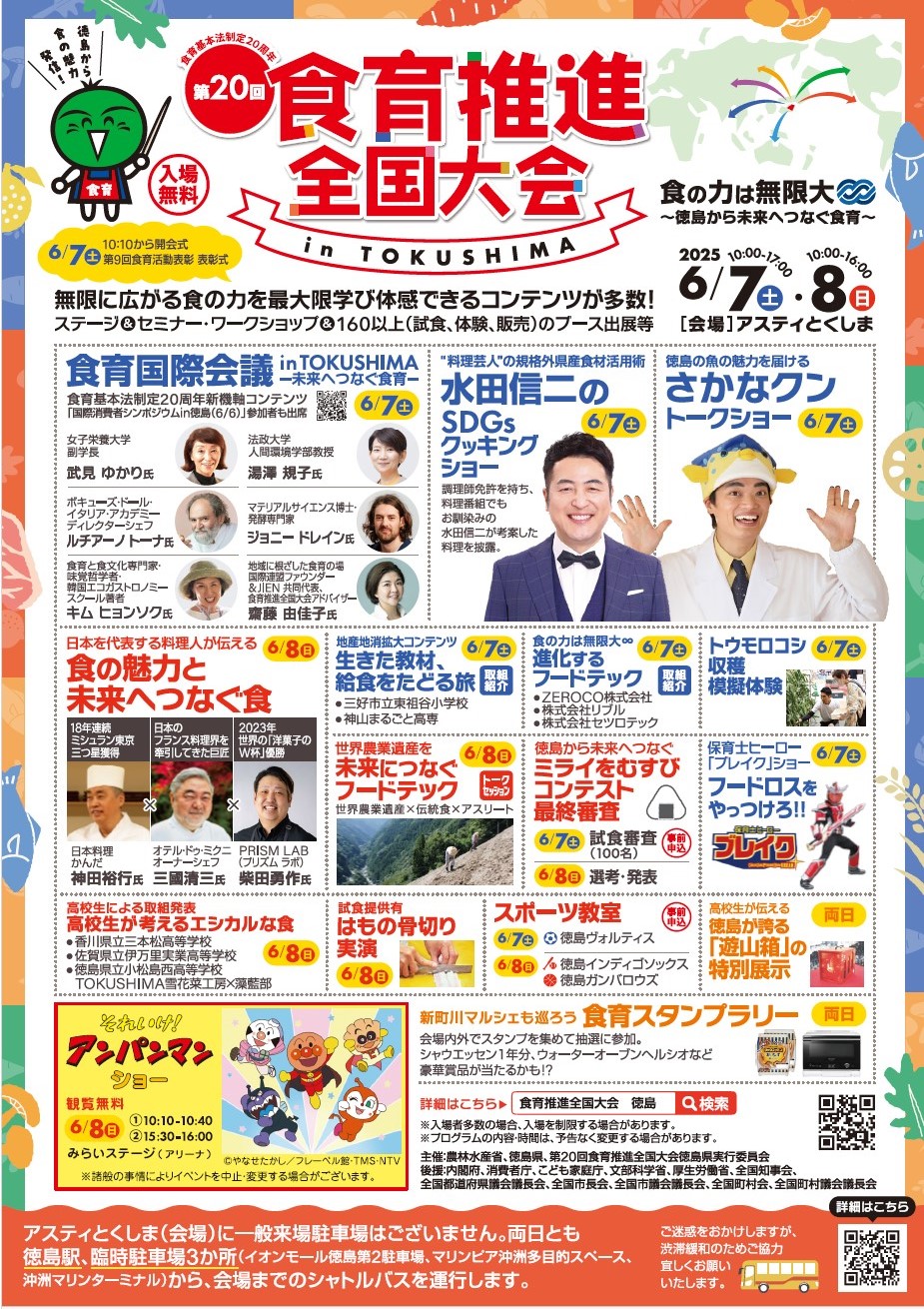 お知らせ 年に一度の食育の祭典、「第20回食育推進全国大会」in徳島のお知らせ 2025.6.4 JF全漁連編集部 印刷する 今年も食育推進全国大会の季節がやってきました。 この大会は,食育推進運動を重点的かつ効果的に実施する「食育月間」である6月に毎年開催されています。昨年は,現在開催中の大阪・関西万博のプレイベントとの位置づけもありましたが,今年は徳島での開催です。 徳島の魚の魅力をさかなクンがご紹介JF全漁連魚食普及推進委員でサカナディアの特別ライターでもあるさかなクンのトークショーも予定されています。天真爛漫なキャラクターで,老若男女を問わず多くの人から愛されるさかなクン。さかなクンの魚愛溢れるトークを聞いたらきっとみなさんも徳島の魚が好きになるはず! JF全漁連とのり推進協も出展JF全漁連のブースでは「おさかなを知って、おさかなを食べよう!全国のプライドフィッシュをご紹介」をテーマに,漁師さんが選んだ今一番食べてほしい魚「プライドフィッシュ」の紹介やクイズ展示を行います。全国のさかなファンが受検する「ととけん(日本さかな検定)」に毎年数多く出題されるプライドフィッシュ。受検を検討している方も必見です。 また,地元のJF徳島漁連と全国漁連のり事業推進協議会(のり推進協)も出展し,海苔の炙り体験や販売を行います。皆さんもご存知のように,海苔とお米の高騰で巷のおにぎりがどんどん値上がりし,コンビニエンスストアなどでは海苔を巻かないおにぎりまで登場してしまいました。海苔離れが懸念される今だからこそ,みなさんに本当に美味しい海苔を味わっていただきたいと思っています。この機会にぜひ香り高い海苔本来の味をご賞味ください。 その他,スタンプラリーや来場者全員へのノベルティ(オリジナルエコバッグ)のプレゼントなどもあります。160以上のブース出展のほか,ステージショー,セミナー,ワークショップなど,内容もりだくさんです。詳細は公式HPでご確認ください。みなさまのご来場をお待ちしております。 ▶第20回食育推進全国大会in TOKUSHIMA 開催日時:2025/6/7(土)10:00-17:00 6/8(日)10:00-16:00 会 場:アクティとくしま(徳島県徳島市山城町東浜傍示1番地1) 入 場:無料 公式HP:第20回食育推進全国大会 in TOKUSHIMA レシピ食育JF全漁連漁協(JF)SDGsプライドフィッシュ中国・四国祭りイベントJF全漁連編集部漁師の団体JF(漁業協同組合)の全国組織として、日本各地のかっこいい漁師、漁村で働く人々、美味しいお魚を皆様にご紹介します。 地域産業としての成功事例や、地域リーダーの言葉から、ビジネスにも役立つ話題も提供します。 SakanadiaFacebookこのライターの記事をもっと読む