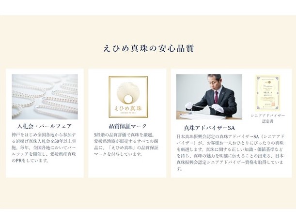 JFえひめ、真珠直販サイト「えひめ真珠」でオンライン接客サービスを実施 2021.10.6 全国の漁連・漁協 印刷する この情報は、愛媛県漁業協同組合(JFえひめ)からの提供です。 * * * <お知らせ> 今週末11/26~11/28に、JFえひめが\パールフェア2021/を愛媛県水産会館で開催します。 JFえひめ真珠公式直販サイト「えひめ真珠」でもフェアを同時開催します🐟 期間限定のお得なクーポンもございますのでWEBサイトをご覧ください。 ▶えひめ真珠WEBサイト コロナ禍で新たな販売活路として真珠の生産量日本一を誇る愛媛県。真珠養殖業者が多く所属するJFえひめは、例年、全国各地で真珠製品展示販売会を開催してきました。ところが新型コロナウイルス感染防止のため、展示販売会はすべて中止となり大きな影響を受けました。そこで、JFえひめはウィズコロナ・アフターコロナを見据えた新たな真珠製品の販路として公式直販サイト「えひめ真珠」を開設しました。 サイト内では約150点のネックレスやピアス、セミオーダー商品を販売しており、順次種類や点数も増やす予定です。 セミオーダーパールネックレスは、真珠アドバイザーSA(シニアアドバイザー)が責任を持って厳選した高品質の真珠を使用しています。 オンライン接客で対面と同じサービスを提供「えひめ真珠」は、ZOOMやLINEを使用したオンライン接客機能を備えており、日本真珠振興会認定の真珠アドバイザーSA(シニアアドバイザー)の資格を持った職員のサポートを受けながら真珠を選ぶことができます。これまでの現地での展示販売会と遜色ないサービスを実現していますので、真珠を初めて購入される方、通販での購入が不安という方も安心です。 ただいま、新規会員登録の方に30%offクーポンのプレゼントキャンペーンを実施中です。 高品質の真珠をお手持ちのスマホやPCで簡単に探せる公式直販サイト【えひめ真珠】をぜひ、ご利用ください。 通販漁協(JF)中国・四国全国の漁連・漁協全国の漁連・漁協のお知らせや活動について選り抜きの情報をお伝えします。このライターの記事をもっと読む
