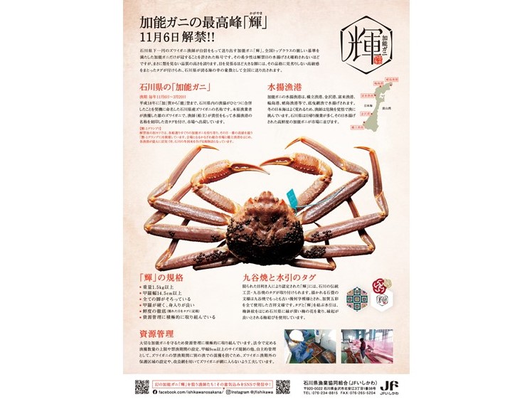 お知らせ JFいしかわ、加能ガニの最高峰ブランド「輝(かがやき)」を発表 2021.10.22 全国の漁連・漁協 印刷する この情報は、石川県漁業協同組合(JFいしかわ)からの提供です。 * * * 加能ガニの最高峰「輝」誕生!JFいしかわは、11月6日に解禁となるズワイガニ漁の今漁期から、石川県産「加能ガニ」※の最高級ブランド「輝(かがやき)」を立ち上げました。 「輝(かがやき)」は、全国トップクラスの厳しい基準を満たした加能ガニだけが冠することを許された称号です。 その希少性は解禁日の水揚げさえ確約されないほどですが、まさに類を見ない品質の高さを誇ります。 「輝」の規格 ・重量1.5kg以上 ・甲羅幅14.5cm以上 ・全ての脚がそろっている ・甲羅が硬く、身入りが良い ・鮮度の徹底 (獲れた日をタグに記載) ・資源管理に積極的に取り組んでいる ※加能ガニとは、平成18年に「加」賀から「能」登まで、石川県内の漁協がひとつに合併したことを契機に命名した石川県産ズワイガニの名称です。 九谷焼と水引のタグ「輝」の目を見張るほど大きな脚には、石川の伝統工芸・九谷焼のタグが取付けられています。加賀水引の梅の花がワンポイントです。 石川県が誇る海の幸の象徴として全国に送り出されます。 11月6日解禁!本当に会えるのか? 本当に獲れるのか? 本当に居るのか? 解禁日に「輝」はその姿を見せるのか。 11月6日に乞うご期待ください! 情報の続きはコチラ↓ http://www.ikgyoren.jf-net.ne.jp/kagayaki/index.html 漁協(JF)北陸全国の漁連・漁協全国の漁連・漁協のお知らせや活動について選り抜きの情報をお伝えします。このライターの記事をもっと読む