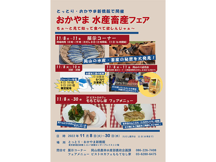 イベント 岡山県からの「もぉ~と見て知って食べて欲しいんじゃぁ~」の声を体現したフェア! 11/8から新橋で開催 2022.11.4 JF全漁連編集部 印刷する 岡山県が東京・新橋で「おかやま 水産畜産フェア」開催この情報は、岡山県水産課からの情報です。 * * * 2022年11月8日(火)~11月30日(水)の期間中、東京・新橋にある鳥取と岡山の共同アンテナショップ「とっとり・おかやま新橋館」(東京都港区新橋1-11-7 センタ―プレイス1-2階)で、岡山県産水産物(+乳製品)をPRするイベント「もぉ~と見て知って食べて欲しいんじゃぁ~ おかやま 水産畜産フェア」が開催されます。 会期中、アンテナショップ2階の「ビストロカフェ ももてなし家」では、「シタビラメのムニエル」や「岡山かきの海鮮アヒージョ」など、岡山県産水産物(シタビラメ、クロダイ、カキ)を使った特別メニューを提供。 また会期中の11月8日(火)~11日(金)には、1階にてJF岡山漁連協力による岡山県産ノリの展示直売会を開催するほか、2階では岡山県産水産物の紹介パネルを展示。岡山県産ノリ購入者には、備前焼等の岡山県の特産品が当たる「木製ガチャ」に挑戦できるイベントの企画も予定されています。 その他、10日(木)には水産加工品の試食アンケートも実施されます。 詳しくは下記概要、画像チラシの情報をご参照ください。 * * * 【開催概要】 もぉ~と見て知って食べて欲しいんじゃぁ~「おかやま 水産畜産フェア」 会 期:2022年11月8日(火)~11月30日(水) 展示開催 2022年11月8日(火)~11月11日(金) 会 場:とっとり・おかやま新橋館(東京都港区新橋1-11-7 センタ―プレイス1-2階) 内 容: ・岡山の農林水産物を、水産畜産品を中心にパネル、映像コンテンツで紹介 ・「岡山ノリの直売会」を開催。ノリを購入された方は岡山県産材を使って作られた木製ガチャに挑戦 ・牛乳の試飲(8日、9日)、水産加工品の試食(10日) ・ビストロカフェ ももてなし家での岡山県産水産物及び乳製品を使ったフェアメニューの提供 <参考>水産物を使ったフェアメニュー 5品 シタビラメのムニエル クロダイのフリット クロダイの黒酢あんかけ 岡山かきの海鮮アヒージョ 岡山かきを使った自家製佃煮 中国・四国イベントJF全漁連編集部漁師の団体JF(漁業協同組合)の全国組織として、日本各地のかっこいい漁師、漁村で働く人々、美味しいお魚を皆様にご紹介します。 地域産業としての成功事例や、地域リーダーの言葉から、ビジネスにも役立つ話題も提供します。 SakanadiaFacebookこのライターの記事をもっと読む