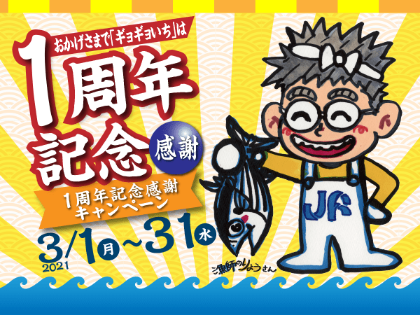 「JFおさかなマルシェ ギョギョいち」1周年記念感謝キャンペーン開催!新店長就任!?JF全漁連は3月1日~31日の1か月間、JFグループの産直サイト「JFおさかなマルシェ ギョギョいち」の開設1周年を記念して感謝キャンペーンを開催します! ▼「JFおさかなマルシェギョギョいち 」1周2021.3.2お知らせJF全漁連編集部