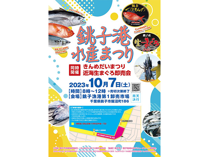 千葉「銚子港水産まつり」10/7(土)4年ぶりの開催!「きんめだいまつり」「近海生まぐろ即売会」も同時開催この情報は、千葉県・銚子市漁業協同組合(JF銚子市)からの提供です。 * * * 10月7日(土)、千葉県銚子市・銚子漁港第一卸売市場を会場に「銚子港水産まつり」を開催します。コロナ禍を経2023.9.21イベント全国の漁連・漁協