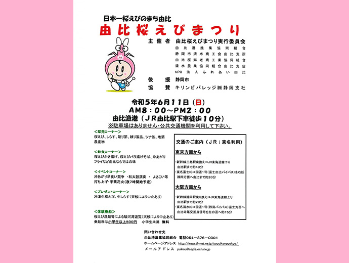例年全国各地から6万人以上が来場の「由比桜えびまつり」、6/11(日)に開催この情報は、静岡県漁業協同組合連合会(JF静岡漁連)からの提供です。 * * * 6月11日(日)、静岡県静岡市清水区の由比漁港で「由比桜えびまつり」が開催されます。 全国各地から6万人以2023.5.29イベント全国の漁連・漁協