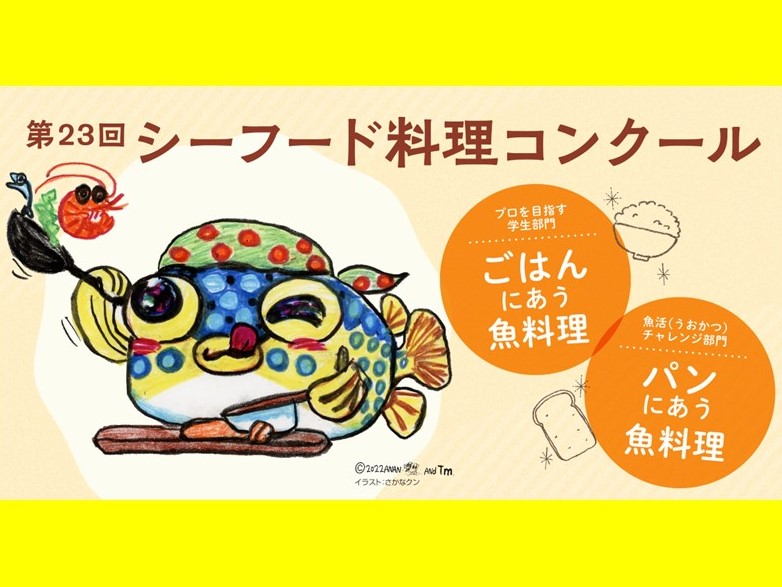 【ご応募ありがとうございました】「第23 回シーフード料理コンクール」開催! 「ごはん」または「パン」にあうおさかな料理 を募集!さかなクン書き下ろしイラストのイメージキャラクター新登場!沢山のご応募をありがとうございました! * * * JF全漁連は、私たちの食生活において、お魚料理をより身近に楽しんでいただくとともに、お魚料理の美味しさを再発見していただくことを目的に、2022.6.29募集JF全漁連編集部