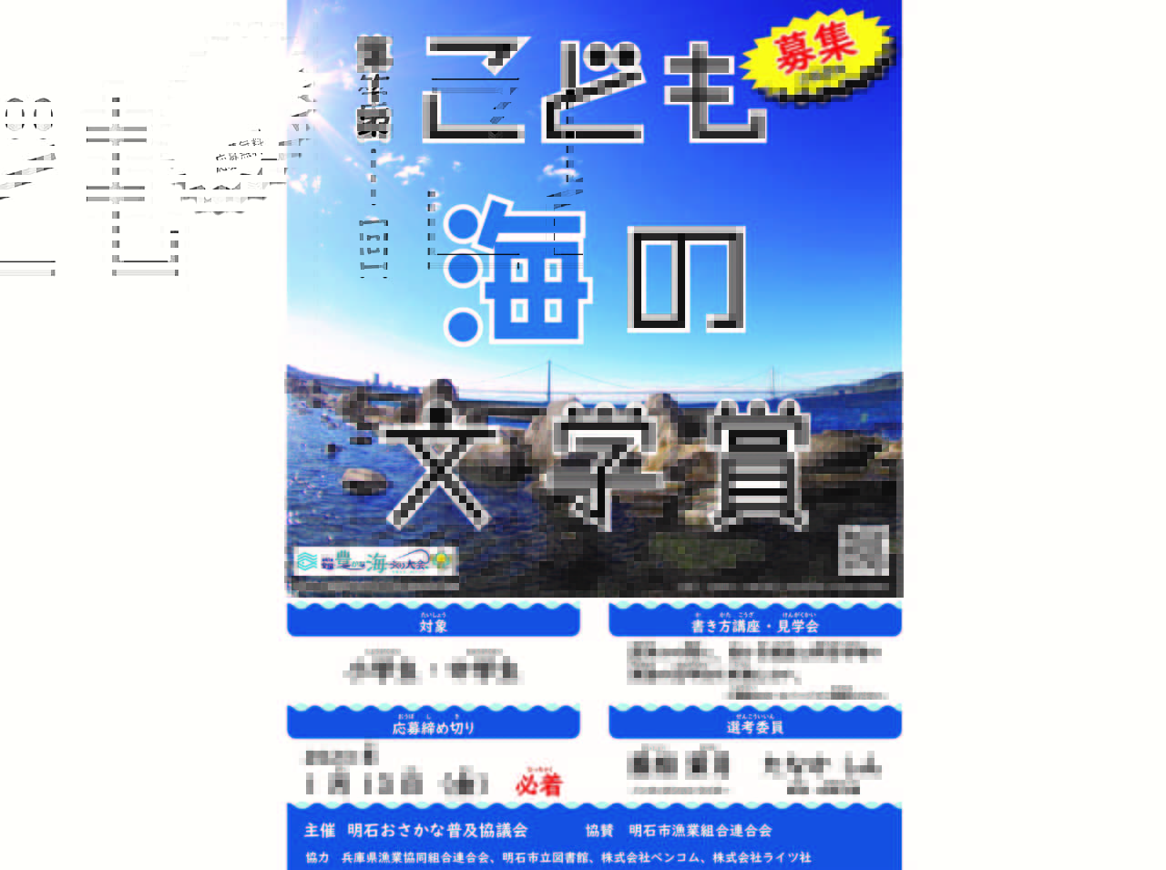 海がテーマ「こども海の文学賞」の募集を開始!第41回全国豊かな海づくり大会兵庫大会をきっかけに創設この情報は、明石市漁業組合連合会・兵庫県漁業協同組合連合会からの提供です。 * * * 明石おさかな普及協議会は、小学生・中学生を対象に海をテーマとした「こども海の文学賞」を募集しています2022.9.1募集全国の漁連・漁協
