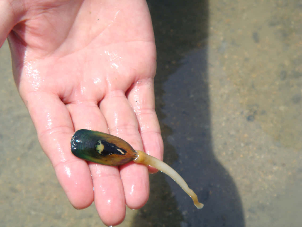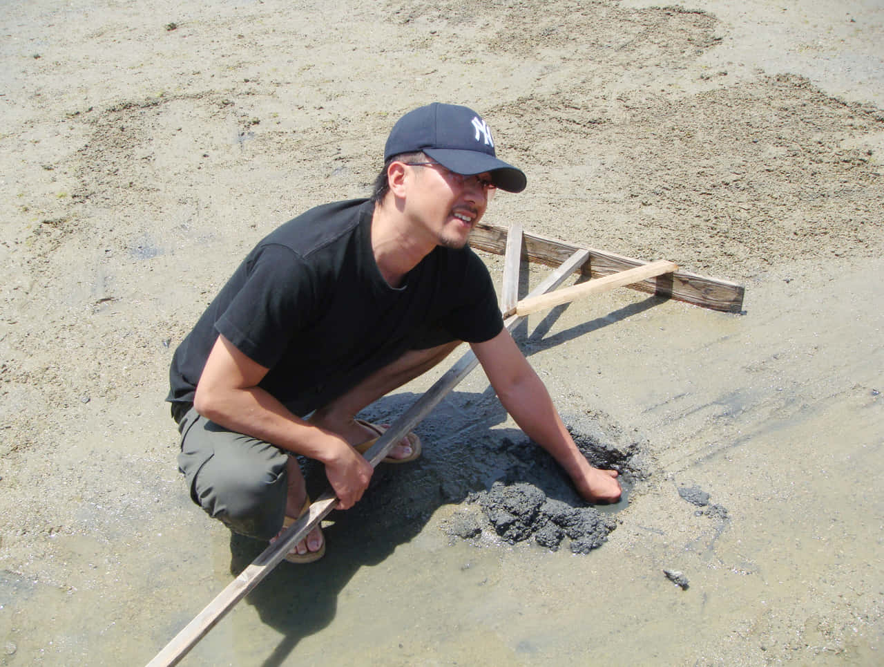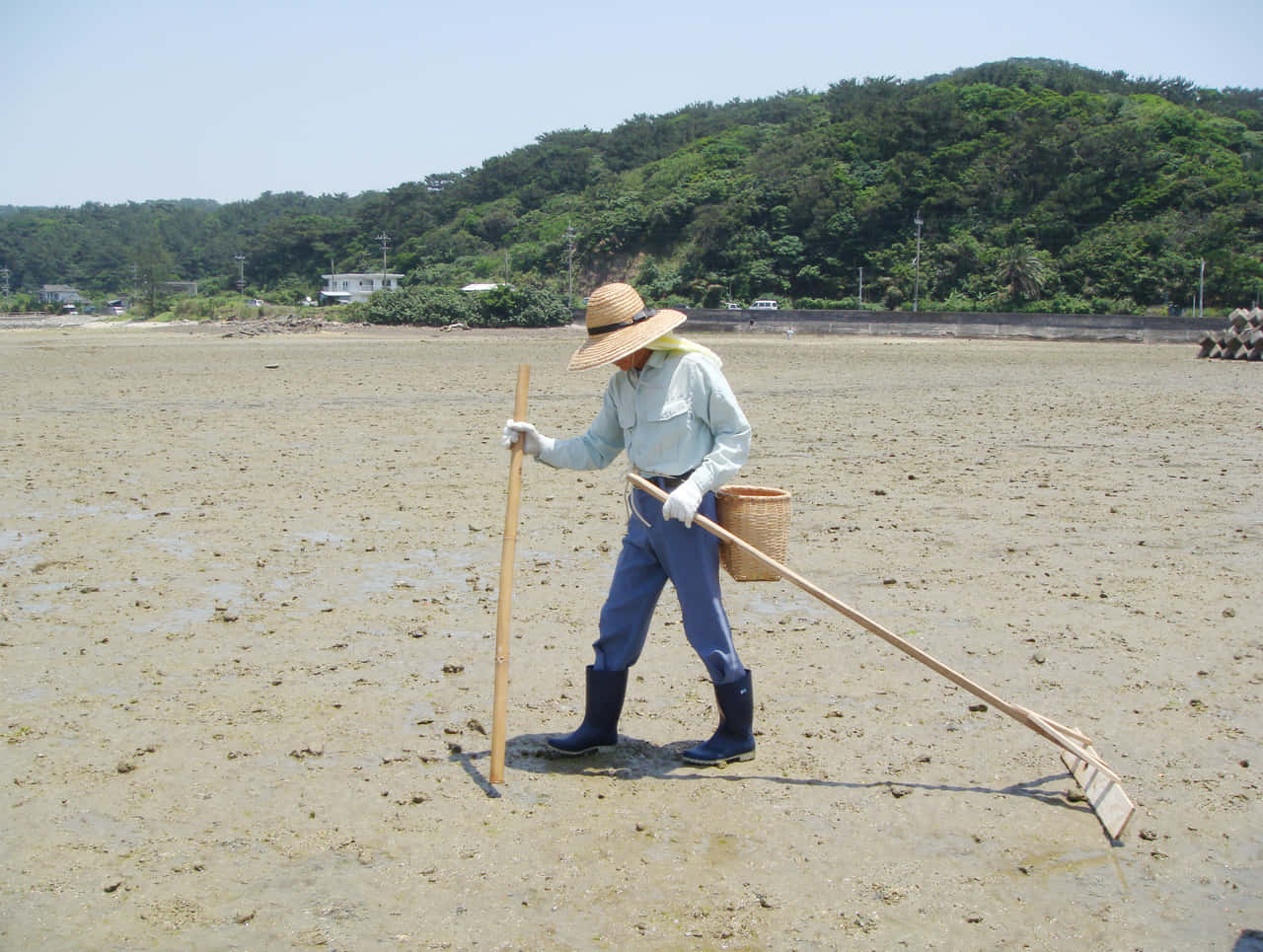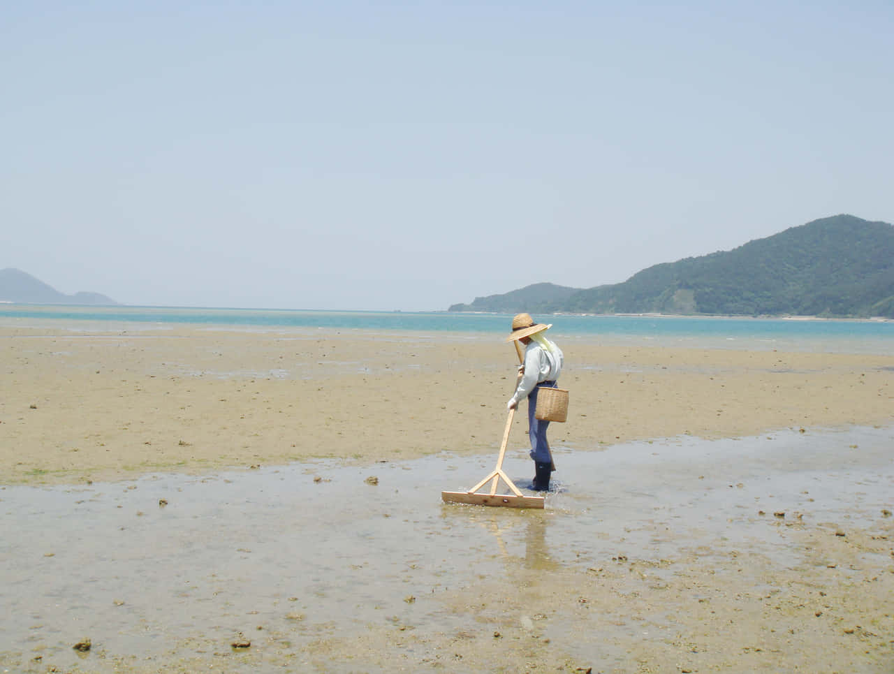 ニッポンさかな酒 奄美の貝に黒糖焼酎 文&写真:吉村喜彦 2024.10.31 吉村 喜彦(よしむら のぶひこ) 印刷する 奄美大島・北西部にある喜瀬(きせ)集落。 前浜には大きな干潟が広がっている。 春、大潮の干潮時に、その干潟を柊田謙夫(ふきだけんお)さんファミリーと潮干狩りをしたことがある。 雲一つない青空。 風が心地いい。 湿気の多い奄美には珍しく、からっとしている。 堤防を越えると、沖まで干上がった渚があった。 柊田さんは長靴を履き、作業用の服とズボン。タオルで顔を覆うようにして、右手には竹の杖。 左手にはトンボ——野球グラウンドを整備するときに使うTの字の棒。 腰には竹籠を下げている。 竹の杖で石ころの多いところをコンコン叩くと、貝が驚いて潮を吹くそうだ。 左手のトンボで干潟をならしていくと、じわっと水が染み出てくるポイントが見つかる。 そこも貝の居場所だという。 * * * 「いた、いた!」 声がする方を見ると、柊田さんが両手で干潟を掘り返している。 何やら太めのモヤシみたいなのが見える。 「ミドリシャミセンガイです」 20センチほど掘って、貝を取り出した。 少々グロテスクだ……。 「トンボで引いて、干潟に三つ穴が見えたら、この貝です。 こんな色と形ですけど、コリコリして美味しいんですよ」 と柊田さん。 ミドリシャミセンガイは貝類(軟体動物門)ではなく、腕足動物門という別のジャンルに入る。 カンブリア紀にあらわれて、古生代に栄え、「生きた化石」といわれる貴重な貝。 煮付けや塩ゆで、味噌汁などで食べられるそうだ。 * * * シャバシャバという音をたてて潮が満ちてきている。 そのスピードは驚くほど速い。 浅瀬に足を踏み入れると、小さなハゼの群れが四方八方に逃げていった。 トンボを引いていると、いきなりピュッと潮が噴き上がった。 掘り出すと、貝殻の噛み合わせの所がきれいにギザギザになっている。 「殻が瓦で葺いたようになっているから、カワラガイ。 干潟に二つ小さな穴が開いているんです。 刺さるようにして頭をちょこっと突き出しているのはタイラギ」 と柊田さんが教えてくれる。 干潟は生きものの宝庫だ。 「マガギガイ、タケノコガイ、マクラガイ、…ワタリガニもいるし、2月から3月のまだ寒い頃はアオサのみどりもきれいです。 アオサは天ぷらや鶏のスープが美味しくてね。テナガエビは潮が引いていくときが一番」 陽光に手をかざして、柊田さんが言う。 * * * 柊田さんのお宅で湯がいたカワラガイを食べさせていただく。 朱色に見えるのがメスだそうだ。 塩気があってコリコリ。 採ったばかりなので、砂を噛んでいるけれど、味は深みがあって甘い。 「奄美の喜瀬に来んと、このカワラガイは食べれんよー」 と柊田さん。 マガキガイもたくさん湯がいてくださった。 口に入れるとプリプリとした食感と濃厚な旨味が広がる。 ワタがまた滋味深い。止まらなくなるほど美味しい。 味噌に砂糖を入れて、マガキガイの身を合わせてもイケるそうだ。 「貝には、やっぱり、これだね」 柊田さんがドンとボトルを置いた。 奄美特産の黒糖焼酎だ。 南国の光と風から生まれた、甘くてほろ苦い酒。 「宴会になると、歌と踊りさ。三線と太鼓が欠かせないよ」 座敷の上座には黒糖焼酎の甕がどんと据えられている。 文&写真:吉村喜彦 吉村 喜彦(よしむら のぶひこ)1954年大阪生まれ。京都大学教育学部卒業。サントリー宣伝部勤務を経て作家に。 著書に、小説『バー堂島』『バー・リバーサイド』『二子玉川物語』『酒の神さま』(ハルキ文庫) 『ビア・ボーイ』『こぼん』(新潮社、PHP文芸文庫)『ウイスキー・ボーイ』(PHP文芸文庫) ノンフィクションでは、『漁師になろうよ』『リキュール&スピリッツ通の本』(ともに小学館) 『マスター。ウイスキーください〜日本列島バーの旅』(コモンズ)『オキナワ海人日和』(三省堂) 『食べる、飲む、聞く 〜沖縄・美味の島』(光文社新書)『ヤポネシアちゃんぷるー』(アスペクト)など多数。 NHK-FMの人気番組「音楽遊覧飛行〜食と音楽でめぐる地球の旅」の構成・選曲・DJを長年つとめた。 現在、月刊「地域人」で全国の漁師を取材する「港町ブルース」を連載中。このライターの記事をもっと読む