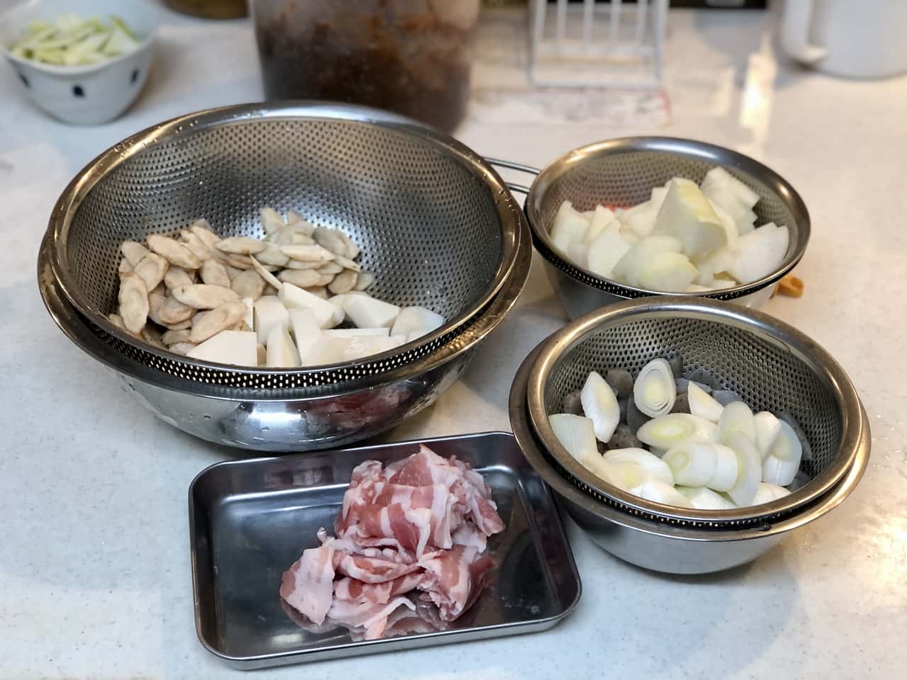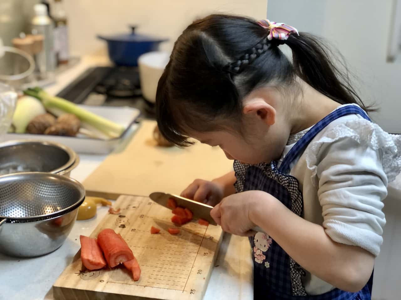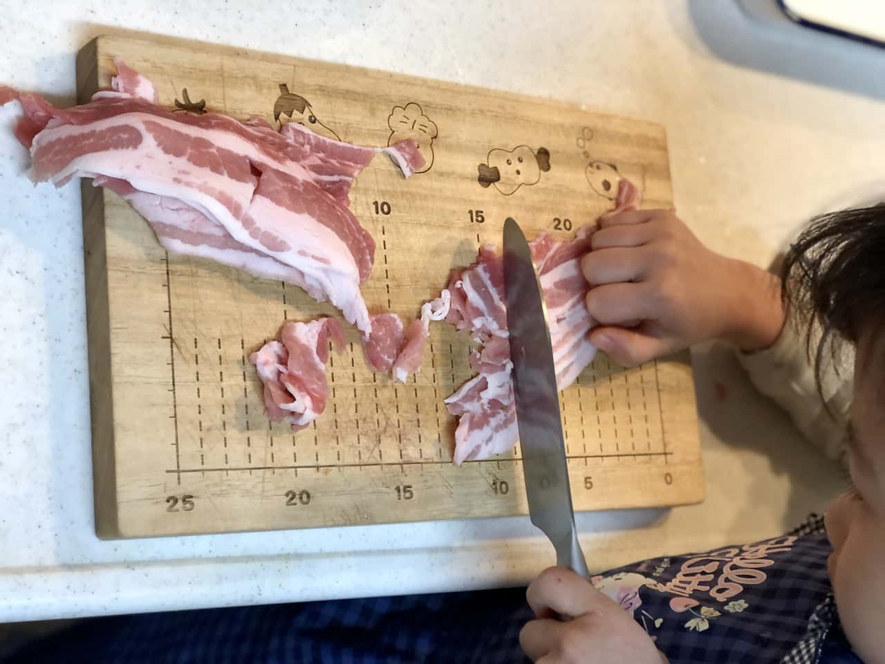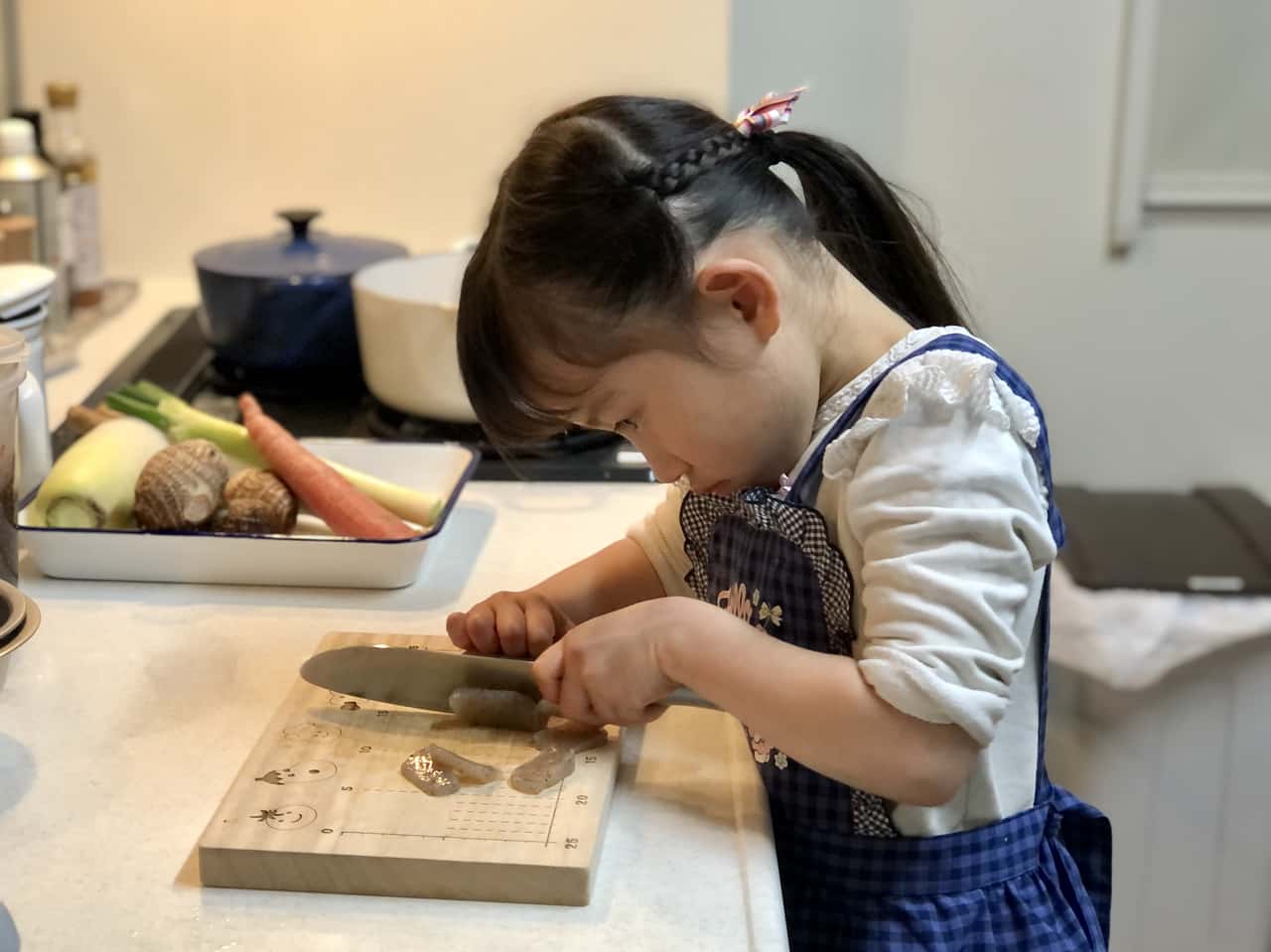 食育 【発酵子育てキッチン】みそ汁大好き! 自家製My味噌で、6歳娘と一緒に作る豚汁 2022.3.24 高木 佐知子(たかぎ さちこ) 印刷する 自家製味噌と豚汁今年の冬はとても寒かったですね~。 しかし、桜も花開き、本格的な春はすぐそこ!仕事帰りの空も明るくなってきて、気持ちも軽くなります。 わが家では、2月中に今期の自家製味噌の仕込みを終えました。私は味噌作りの講師もしているのですが、今年は地元で味噌作り講座を2回開催できてほっとしているところです。 新型コロナウイルス感染状況が心配な時期にもかかわらず、味噌作り講座は例年以上に人気でした。食で健康を整えたいという方が増え、年々発酵食品や日本の伝統食品への関心が高まっている気がします。 さて、昨年うちの姉妹が仕込んだ自家製My味噌※ができあがりましたよ~。 ※昨年仕込んだ自家製My味噌 ▶Sakanadia記事「【発酵子育てキッチン】親子で味噌づくりのススメ」 2021年3月に仕込んだ自家製My味噌わが家では、6歳の三女が大の味噌汁好き!毎食必ずおかわりするほどです。 「このお味噌でみそ汁をつくりたいな~!」「お野菜を切りたい!」と三女。 ならばと、みんな大好き! 根菜がたっぷり入った豚汁をつくることにしました。 * * * 自家製My味噌で豚汁を作ろう♪まず、材料を揃えます。 豚汁に入れる野菜は、冷蔵庫にあるもの何でもいいと思いますが、やはり大根・人参・ごぼう・芋類といった根菜は定番でおいしい。今回使った材料は7種類! 豚肉・大根・人参・ごぼう・里芋・長ネギ・こんにゃくです。 まずはこんにゃくを切って、アク抜き。 包丁を握る子どもの横顔。この真剣な眼差しがたまらなくいいのです。 ツルンと滑るけど大丈夫かな~。しっかりそばについて見守ります。 お鍋に水とこんにゃくを入れて火にかけて、アク抜きをする間にお次は人参。 ヘタを落とすと……。 「わあ~!きれいな模様! 穴がちょっと気持ち悪い……」だそうです(笑) 切り口を観察するだけで新鮮な驚きがあります。 「人参はかたいね、でも楽しい~」とトントン。 思い切りのいい三女はどんどんスピードアップ。ハラハラします(汗) でも、「早すぎてお母さんみたいになっちゃった~」なんておどける姿がかわいい♪ お肉にも挑戦! スッと刃を入れないと切れないよ~。食材によって包丁の動かし方が違うことも学びます。 その後もよだれをたらすほど(笑)夢中で大根などを切っていましたが……、「疲れちゃったよ……」と座り込んでしまいました。 うんうん、頑張ったね。お野菜たくさんあるものね! あとはママが切るよ。 下ごしらえ完了!「さあ、お野菜炒めるよ~!」と声をかけると、私が残りの野菜を切っている間に一休みした娘は「やるやる~!」と元気に復活。 しっかり押さないとガスだけが出て危ないよ。 慣れない点火も練習です。 お野菜たっぷりだから、混ぜるのも大変だね。でも「大丈夫!」と得意顔です。 お鍋が熱くなってきて、ジュウジュウと野菜の水分と油の混ざる音。香り立つお肉とごぼうの匂い。野菜に火が通ると透明感が出てくる。お料理は、「五感」をフル活用した経験なのです。 さて、お水を入れて、アクを取りながら煮込んだら、いよいよ自家製My味噌の投入です♪ 「どれどれ~?味見させて~」と2つ上のお姉ちゃん。 「ダメ~私のだよ!」ひとり占めしたくなるほど、愛着のあるMy味噌だね。 姉妹ゲンカはすぐおしまいで、味噌にもニコニコマーク。 こういうこと思いつくのは、子供らしくて最高! お味噌を溶いたらお楽しみの…… お味見タイム♪ 「おいしい!」でもちょっと薄いかな、もうちょっとお味噌を足そうか。 味見だって、味覚の練習です。大切なこと。 「全部私がやるよ!」と家族5人分の豚汁をお椀によそいます。 「できたよ~!」パチパチ。よく頑張ったね。さあ召し上がれ! 「おいし~い!!!」 慣れないお料理をして、疲れたね。 でも、楽しかったね!達成感いっぱいだね! 自分でやり遂げた時のキラキラした気持ちは、きっと子どもの力になると信じています。 家族みんな大好きな豚汁。お鍋にたっぷり作ったけど、あっという間に無くなりました。 お肉だけじゃなくて、サケを入れた石狩汁やブリ汁などお魚と野菜の味噌汁も好きです。 味噌はそのまま野菜やごはんにつけてもおいしいけど、味噌汁にした時の、出汁や具の旨味が溶け込んだ味わいが素晴らしいですよね! * * * 次世代へ繋ぎたい味噌文化サワラのあら汁約1300年前(奈良時代)には味噌の原型となる調味料があり、室町時代からは庶民のあいだでも味噌汁が飲まれるようになったそうです。 時代が変わっても、長年飽きることなく飲み継がれてきた味噌汁ってすごいですよね。 「医者に金を払うよりも味噌屋に払え」 「味噌汁は朝の毒消し」 「味噌汁一杯三里の力」 など、味噌の健康効果を謳ったことわざはたくさんあります。味噌は美味しいだけでなく、私たちの健康を整えてくれることを昔の人は知っていたのですね! ご飯と味噌汁は和食の基本で
