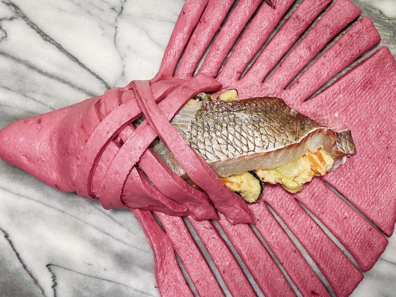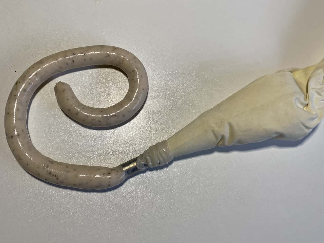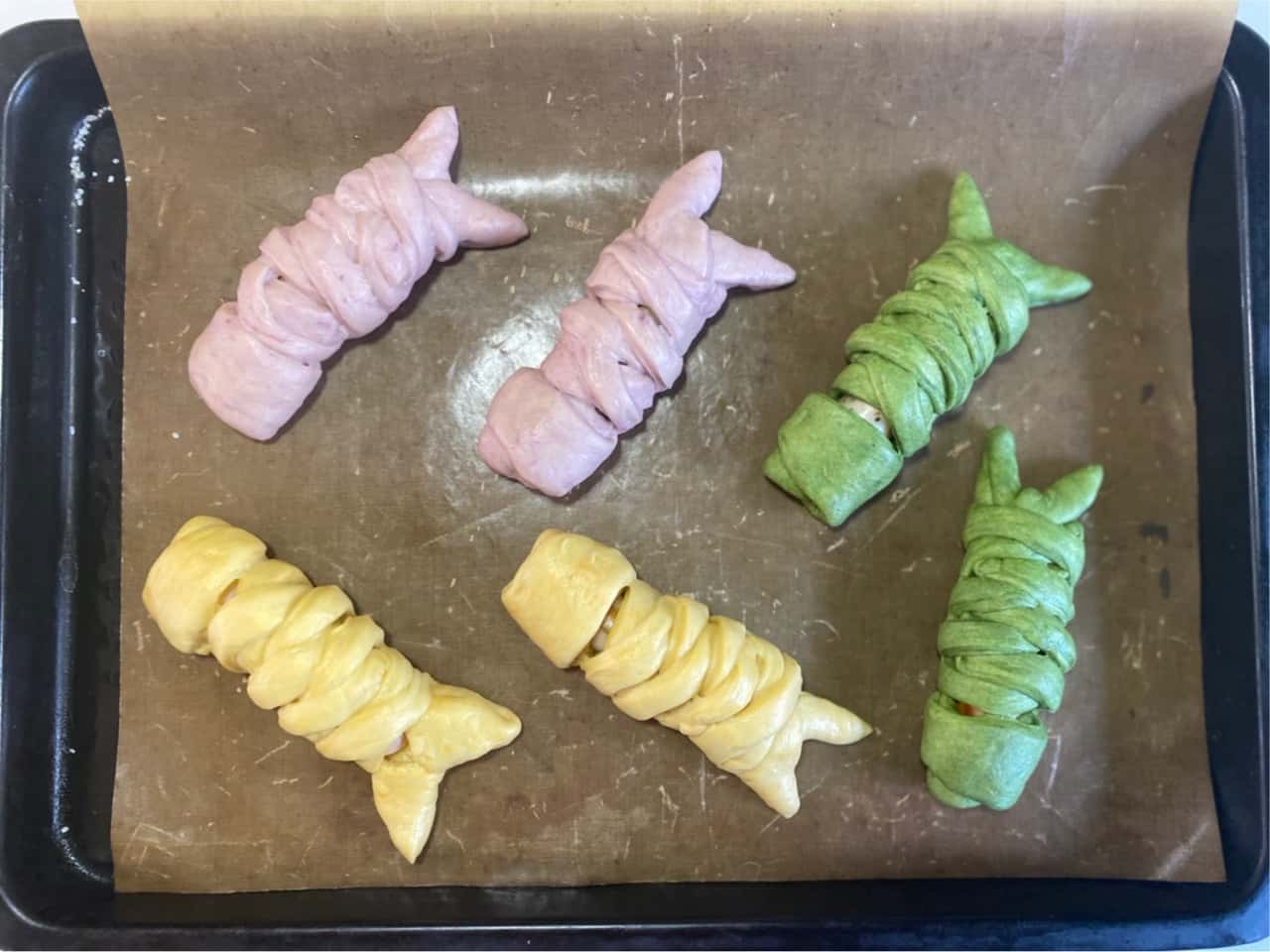 ハレの日お魚料理 GW・こどもの日は!手作り魚肉ソーセージdeこいのぼりパン♥ 2021.4.22 小澤紀子・Rino (こざわ のりこ・りの) 印刷する もうすぐゴールデンウイーク!そして、5月5日は「こどもの日」。青空に色とりどりの鯉のぼりが泳ぐ季節ですね♪ 今年は特に、「コロナに負けず元気に育ってほしい!」との気持ちをこめて「こいのぼりパン」(ソーセージパン)を作ろうと思います! 普段はお肉のソーセージやウインナーを包んだパンにするところなのですが…無添加でヘルシーな「こいのぼりパン」にするため、今回は「手作り魚肉ソーセージ」に初挑戦してみました! お肉を使ったソーセージづくりはやったことがあるのですが、お魚のソーセージは初!ということで、いろいろと研究してみました。 難しかったのは魚肉の部分。レシピはネットで探したかまぼこの作り方や魚肉ソーセージのパッケージを参考にしました。 画像はイメージ https://pixabay.com/ja/まずは試しに、白身魚(たら)・塩・砂糖・ハーブだけで作ってみると…色は真っ白で、食感はボソッとした感じ。魚臭さもあり、正直なところ「美味しい~」と思えるソーセージにはなりませんでした。 次に、市販の魚肉ソーセージのパッケージに書いてある卵白や片栗粉なども少し足してみましたが、ゆでている時に羊腸が破裂! 他にも、魚肉ソーセージのピンク色やジューシー感を出すために「サーモン」や「ブリ」を使ったり、プリっとした感じを出す為に「海老」を加えたり、ハーブの種類を変えてみたりと何度か試作を重ねてみました。 そして最終的にできあがったのが、今回ご紹介するレシピ! 市販の魚肉ソーセージとも、お肉で作るソーセージとも全く違う食べ物になった感じです!でもこれはこれで「美味しい♪」というのが1番の感想。 今回は、魚の新しい楽しみ方がご提案できるのではないかな、と思います♪ 色んなお魚、ハーブやスパイスを組み合わせて、袋に詰める作業もとっても楽しいソーセージ作り♪ ぜひご家族やお友達とワイワイ試してみてください!! 手作り魚肉ソーセージdeこいのぼりパン【材料】《魚肉ソーセージ》約10㎝のソーセージ12~16本分 たら(白身魚)… 100g サーモン… 70g 海老…30g 塩…6g 砂糖…10g スパイス…2~3g(ニンニクパウダー・タイム・バジル・ディルなど合わせて) 氷…30g 羊腸…1メートル位 《米粉パン生地》6個分 強力粉…180g 米粉…20g とかちの酵母(ドライイースト菌)…3g 水…50g 甜菜糖…15g 豆乳…70g ギーオイル(無塩バターやその他オイル)…20g 野菜パウダー(紫芋・ほうれん草・ニンジン)…各小さじ1/2 ≪飾り≫ スライスチーズ 海苔 マヨネーズ アーモンドスライス 【つくり方】●≪魚肉ソーセージをつくる≫ (1)羊腸は塩漬けになっているので15分ほど真水につけて「塩抜き」しておきます。 (2)白身魚、サーモン、海老などは、皮や骨、血合いなどがあれば切り取ります。 (3)フードプロセッサーに材料の魚、氷、スパイスを入れてミンチにします。 *10秒くらいであっという間にミンチ状になります。 (4)ソーセージ用の絞り袋と口金に塩抜きした羊腸の皮をセットします。 (5)絞り袋にミンチした具材を詰めて皮に押し出していきます。 (6)生地が少し出たら、指で皮の先端を引っ張り結びます。 (7)送り出しながら引き出していきます。 *腸の太さの8~9割くらい詰めるようにしていきます。 (8)詰め終わりも結びます。 (9)半分にねじる→好きな長さにねじる→片方を穴にくぐらせる。これを繰り返していきます(動画)。 (10)80℃のお湯にソーセージを入れて20~25分ゆでます。 *70~75℃をキープしたままゆでます。 (11)すぐに氷水に入れて急冷します。 *そのままでも食べられますがフライパンに油をしいて軽く焼いた方が美味しいです!●≪こいのぼりパンをつくる≫ ※パン作りの発酵までの工程は、めでたい!鯛のパン包み焼き~ビーツを使って鮮やか祝色💗~をご参考にしてください。 (12)36度くらいのぬるま湯に甜菜糖と酵母を溶かして15分ほど常温におき、酵母を目覚めさせます。ブクブクと泡立ってきます。 (13)強力粉と米粉と塩を大ボールに計量し、甜菜糖とひと肌に温めた豆乳を計量カップに合わせて大ボールの粉に加え、12のイーストも入れて混ぜ、粉っぽさがなくなったら台に取り出し、ギーオイル(バター)を加えて滑らかになるまで捏ねます。 (14)ある程度滑らかな生地ができたら3等分にして、それぞれ野菜パウダーを練りこみます。丸めて30分くらい1次発酵させます。 (15)2倍くらいの大きさになったらさらに2分割して丸め直し、濡れ布巾とラップをかけて15分くらいお休みします(ベンチタイム)。 (16)焼いたソーセージを入れてこいのぼりに成型します。 こんな感じで左右交互に折りたたんでいきます。 めでたい!鯛のパン包み焼き~ビーツを使って鮮やか祝色💗~ https://sakanadia.jp/sakana/harenohirecipe_01/ 参照。(17)包み終わったら、濡れ布巾とラップをかけて20分くらい二次発酵!ひと回り大きくなったらOK! (ここでオーブンの予熱を入れ