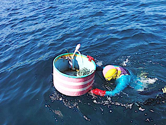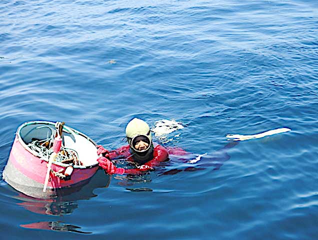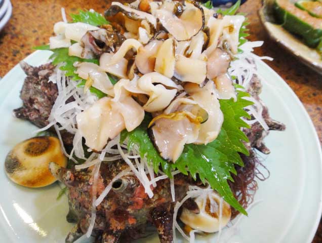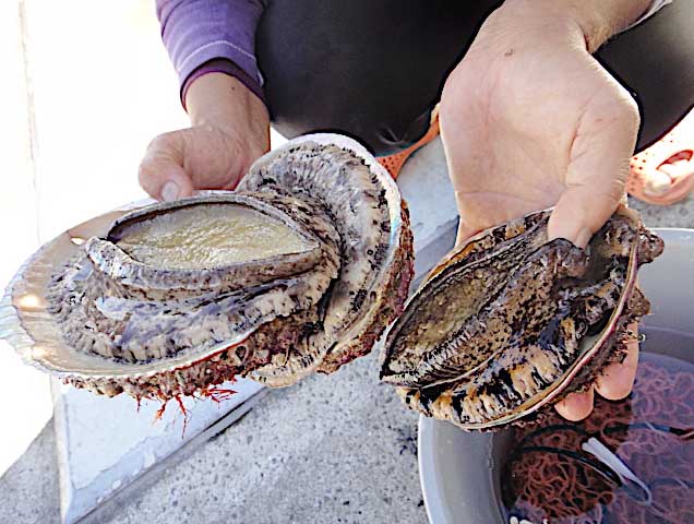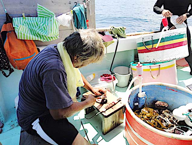 ニッポンさかな酒 壱岐の海の幸と麦焼酎 文&写真:吉村喜彦 2024.9.12 吉村 喜彦(よしむら のぶひこ) 印刷する 玄界灘に浮かぶ壱岐島(いきのしま)は博多から70キロ。 ジェットフォイルで約1時間の距離。 博多港を出た高速船は日本の歴史をさかのぼるかのように、 右手に志賀島、左手に玄界島を見ながら、北西に進路をとっていく。 この海に面した壱岐、そして松浦半島など九州北西部、五島列島には、 かつて、同じような生活スタイルをもった海人(あま)族という人たちが暮らしていた。 3世紀後半の中国の史書『魏志倭人伝(ぎしわじんでん)』にその暮らしぶりが記されている。 彼らは「好んで、漁鰒(ぎょふく)を捕らえ、水に深浅となく(深い浅いにかかわらず)、皆沈没して(もぐって)之を捕る……… 倭の水人は好んで沈没魚蛤(ぎょこう)を捕らえ、 文身(いれずみ)をし、またもって大魚、水禽(すいきん)を厭(はら)う」 これは、魏の使者が朝鮮をとおって、対馬、壱岐を経由し、 松浦半島にやって来る間に実際に見た光景だろう。 壱岐島の東部・八幡(やわた)地区では今も海女が、いにしえの海人族伝統の潜水漁を営んでいる。しかも、レオタードを着て潜るのだという。 * * * 15年前、実際にその海女の漁を取材させてもらった。 当時、壱岐東部漁協・海女組合会長だったのは片穂野八代子(かたほのやよこ)さん。小柄で若作り。とてもキュート。 高齢の方が多いと聞いていたが、良い意味で、まったく予想に反していた。 片穂野さんが身支度を調える。 一番下にシャツ。そして長袖ハイネックのヒートテック。そしてまたシャツ。その上から水着、レオタード。計5枚の重ね着だ。 「準備に30分。耳栓を入れて、ドリンク剤飲んで、目薬さしたりね」 水着とレオタードの間に、採ったアワビやサザエ、ウニを入れる。まるで海の幸を身ごもったような姿になっていくという。 いちいち海に浮かべた桶まで入れにいかなくてすむように、こうしているのだ。 「ここでは昔からウエットスーツは着てはいけないんです。採りすぎてしまいますから」 * * * 一回の潜水はおよそ1分。 これを何度も何度も繰り返し、一潮(ひとしお・1ラウンド)約3時間潜り続ける。 海女さんたちが海中から浮上する姿を見ていると、 あちこちで 「アアーッ」 「ワーッ」 という声が聞こえてきた。 「ボンベじゃないけん、疲れんめー。 ほいで、海から出てきたら『ハーッ』て声が出る。 すると、ちょっと気持ちが楽になるとたい。自然に出るとたい」 海女さんのひとりが、そう教えてくれた。 「息が長い人でも1分。深さ15メートルまで潜って、また帰ってこんといけんけんね。 海女の仕事で死んだ人、何人もおるとよ。 石の下にアワビおるとき、そこに道具持っていって手のはさまって、出てこられんようになって……。今はおらんばってん」 * * * ムラサキウニ、その後は赤ウニ、バフンウニ、サザエ、アワビを採る。 八幡では毎日二潮(ふたしお・2ラウンド)、6時間近く潜る。 海では何が起こるかわからない。海女さんたちはなるべく離れないようにしている。 片穂野さんは言う。 「海から上がってくるときのアアーッて声は磯笛というんですが、 仲間がどこにいるか確認できるという安全確認にもなっているんですよ。 海では何が起こるかわかりませんから」 平安時代の清少納言が、『枕草紙』に、この磯笛のことを書いている。 「舟の端をおさへて放ちたる息などこそ、 まことにただ見る人だに、しほたるる」 (海女が舟端をおさえて放つ苦しそうな息など、ただ見ている人でさえ、涙をもよおす) * * * 陸にあがって、海女さんたちが獲ってくれたアワビやサザエをいただいた。 磯の香りとみずみずしい味わいに、あの磯笛の音を思いだす。 合わせたのは、壱岐の麦焼酎。 ひとくち飲む。 すっきりと軽やかな味わいがいい。 麦の甘さと爽やかなのど越し。クセがなく、 たいへん飲みやすい。 アワビやサザエの強い磯の香りをおだやかな波風に変えるようだ。 ちなみに、銘柄名「ちんぐ」というのは、長崎の言葉で「親友」という意味。 たしか韓国語も同じ意味だった。このタイトルの、釜山を舞台にした名作映画があった。 そうか。 この酒は、海女さんたちが友を勇気づける、あの磯笛のような酒なのだ。 そう思って飲むと、より味わいが深くなった。 文&写真:吉村喜彦 漁協(JF)酒九州女性部吉村 喜彦(よしむら のぶひこ)1954年大阪生まれ。京都大学教育学部卒業。サントリー宣伝部勤務を経て作家に。 著書に、小説『バー堂島』『バー・リバーサイド』『二子玉川物語』『酒の神さま』(ハルキ文庫) 『ビア・ボーイ』『こぼん』(新潮社、PHP文芸文庫)『ウイスキー・ボーイ』(PHP文芸文庫) ノンフィクションでは、『漁師になろうよ』『リキュール&スピリッツ通の本』(ともに小学館) 『マスター。ウイスキーください〜日本列島バーの旅』(コモンズ)『オキナワ海人日和』(三省堂) 『食べる、飲む、聞く 〜沖縄・美味の島』(光文社新書)『