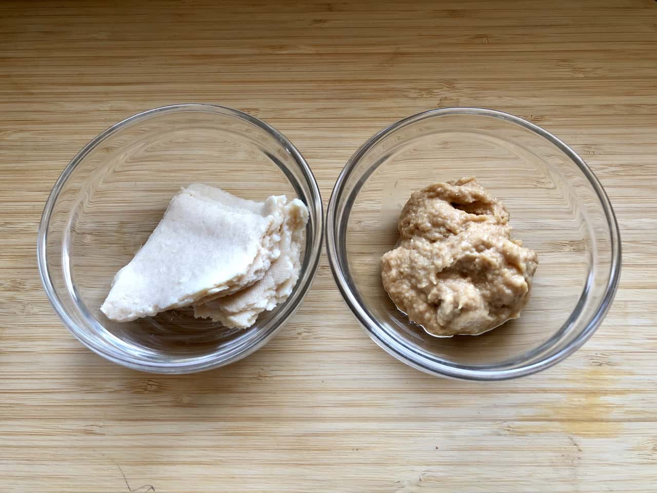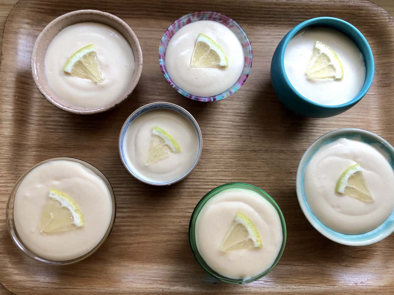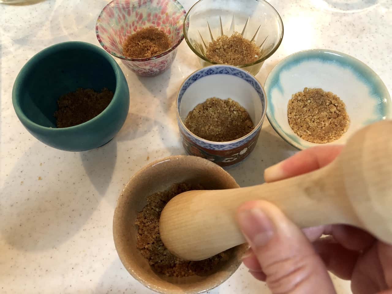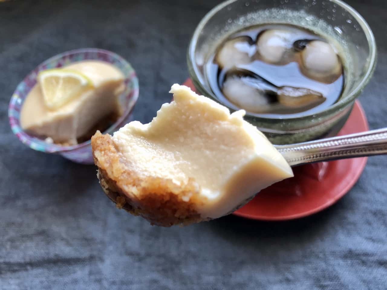 簡単おさかな料理 寒天と酒粕のチーズケーキ♪~罪悪感ゼロの腸活スイーツ~ 2020.8.11 高木 佐知子(たかぎ さちこ) 印刷する クリームチーズ・酒粕・ヨーグルトのトリプル発酵デザート今回はちょこっと気分を変えて、糀のスイーツなんていかがでしょう♪ テングサやオゴノリといった海藻から作られた「寒天」は海からの恵みのひとつですね! そして、Sakanadiaの簡単おさかな料理に初登場!の糀もの「酒粕」です。 お魚料理にお役立ちの酒粕ですが、今回は、真夏はもちろん、年中楽しめる冷たいデザートに使ってみました。 寒天と酒粕を使ったひんやりデザートの一押しは…「レアチーズケーキ」です。 ※今回ご紹介するチーズケーキは、アルコール分が含まれるので、お酒に弱い方、運転予定の方、お子さまは控えてください。 酒飲みの私は、甘いものよりつまみが好きな辛党(笑)。 そんな私がときどき食べたくなるのはオーソドックスなレアチーズケーキです。 特に、底にしかれたグラハムクラッカーのザクザクとした食感、全粒粉の香ばしい風味。 子どもの頃、はじめて食べたときにその素朴で豊かな風味に感動したものです。 だから、今でも食べたくなるのはそんな素朴なチーズケーキなのです。 左:板粕、右:練り粕。熟成された練り粕は色が濃い酒粕はチーズに似た風味を持つ発酵食品なので、チーズや動物性食品を使わずに、“ヴィーガン”のチーズケーキ材料としても使われます。 でも、クリームチーズとの相性も抜群。 今日はクリームチーズと酒粕とヨーグルトを合わせた“トリプル発酵”のレアチーズケーキにしたいと思います。 おいしく美しく!酒粕の豊富な美容健康効果 「酒粕」には実は栄養がいっぱい。 ビタミンB群や食物繊維などが豊富で、腸を整え、カラダの調子を良くしてくれます。 習慣的に食べることで、美肌・美白効果が期待できますよ。 また、近年注目されているのが「レジスタントプロテイン」というたんぱく質。 腸で脂質を吸着して体外に排出するので、コレステロール低下作用があるとか。 ほかにも“酒粕の健康効果”はここでは書ききれないほどたくさん。 興味ある方は調べてみてくださいね。 カラダにいいだけでなく、酒粕に含まれるアミノ酸や酵素の力で料理がおいしくなる。 酒粕は“かす”と呼ぶにはもったいない素晴らしい発酵食品なのです。 寒天も食物繊維が豊富な健康食材。そんな酒粕と寒天を使うことで、罪悪感の少ないスイーツに仕上げます(笑)。 実際にお通じが良くなるかも? おちょこでお手軽。ちょこっと食べたい色とりどりのおちょこ。筆者はちょこちょこ集めるのが好き。さて、ケーキはケーキでも・・・・・・、なんと「おちょこ」を使います。 私、スイーツは“ちょこ”っとだけ食べたい派。 ケーキ型を使わないので気軽に作れるし、小人数分でも好きな量だけ作れるのが魅力なのです。 それに、酒粕が入っているのでやっぱりおちょこが似合う気がしません? まあ、いかにも酒飲みが考えそうなデザートですねえ(苦笑)。 【つくり方】今回も合言葉は「かんたん・おいしく」♪では、レシピをご紹介します。加熱は電子レンジでかんたんですよ~。 まずは材料から。 ※今回ご紹介するチーズケーキは、アルコール分が含まれるので、お酒に弱い方、運転予定の方、お子さまは控えてください。 作りたい量、食べたい量に合わせて半分にしたり、倍にしたり。クリームチーズも小分けタイプを使えば、よりお手軽。 それではつくり方の手順を見ていきましょう。 ①ビスケットを小さく割りながらビニール袋に入れ、すりこ木か麺棒などでたたいて粉状にする。 ②バターを耐熱容器に入れ、電子レンジ(600W)で約30秒加熱して溶かし、①とよく混ぜる。 ③ ②をおちょこの底にしっかりと押さえるように敷き、冷蔵庫で冷やしておく。 ④耐熱ボウルにクリームチーズを入れ、電子レンジ(600W)で約30秒加熱する。 ※練りやすいようやわらかくする程度。温めすぎないように。 ⑤泡立て器でなめらかになるまで混ぜてから、砂糖を加えさらにすり混ぜる。 ⑥練り粕(ペースト状の酒粕)、ヨーグルト、レモン汁の順に加え、都度よく混ぜる。 ※固形の酒粕の場合は、水でふやかして軽くレンチンして混ぜてペースト状にして使う。 ⑦ ⑥を電子レンジ(600W)で約1分加熱する。 ※軽く温めることで次に加える寒天がムラなく混ざりやすいようにする。また、酒粕のアルコールも軽く飛ばすため ⑧耐熱容器に粉寒天と水(大さじ3)を入れ、よく混ぜてから電子レンジ(600W)で約30秒、一旦混ぜてからさらに約30秒加熱し、よく溶かしてから⑦に加え、手早く混ぜる。 ※加熱が足りないと、寒天が溶けず固まらない。ただし、加熱しすぎて吹きこぼれないように注意。 ⑨冷蔵庫で冷やした③のおちょこに⑧を入れ、上に薄切りのレモンを飾り、冷蔵庫で1時間以上冷やせばできあがり~♪ 季節のフルーツを飾ってもいいですね! 召し上がれ~♪お好きな飲み物と一緒にどうぞ。