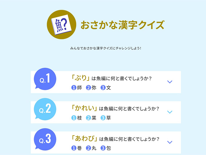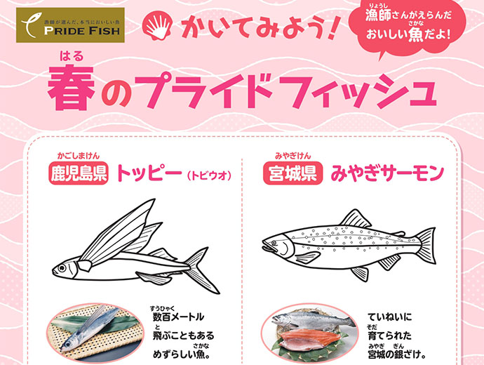 食育 プライドフィッシュWEBサイトに、みんなで楽しく学べる「魚食育ページ」がオープン 2023.6.26 JF全漁連編集部 印刷する JF全漁連はこのほど、プライドフィッシュWEBサイト内に「魚食育ページ」をオープンしました。 新しいページに出現する「豊かな海に囲まれた、漁業が盛んなとある島」に、子どもたちにも大人気の「さかなクン」や「おさかな天国」、「おさかなぬりえ」、「折り紙」、「クイズ」などのさまざまなコンテンツを配置しています。 おさかな漢字クイズでは、 ― 「ぶり」は魚編に何と書くでしょうか? などの問題を出題。ページ内をクリックすると答えが開いて確認できる仕様になっていますので、ご家庭でお子さんと一緒に挑戦して、いろいろなお魚や、プライドフィッシュについて学び、楽しんでいただけます。 「ぬりえ」では、お魚のことを学びながら、ダウンロードできる画像で塗り絵を楽しむことができます。 コンテンツは今後も随時追加していく予定。 また、コンテンツが増えるに従って島は発展していきます。島が大きくなっていく様子も併せて、ぜひみなさんでお楽しみください。 ▶プライドフィッシュ公式WEBサイト ▶魚食育ページ 食育JF全漁連プライドフィッシュさかなクンJF全漁連編集部漁師の団体JF(漁業協同組合)の全国組織として、日本各地のかっこいい漁師、漁村で働く人々、美味しいお魚を皆様にご紹介します。 地域産業としての成功事例や、地域リーダーの言葉から、ビジネスにも役立つ話題も提供します。 SakanadiaFacebookこのライターの記事をもっと読む