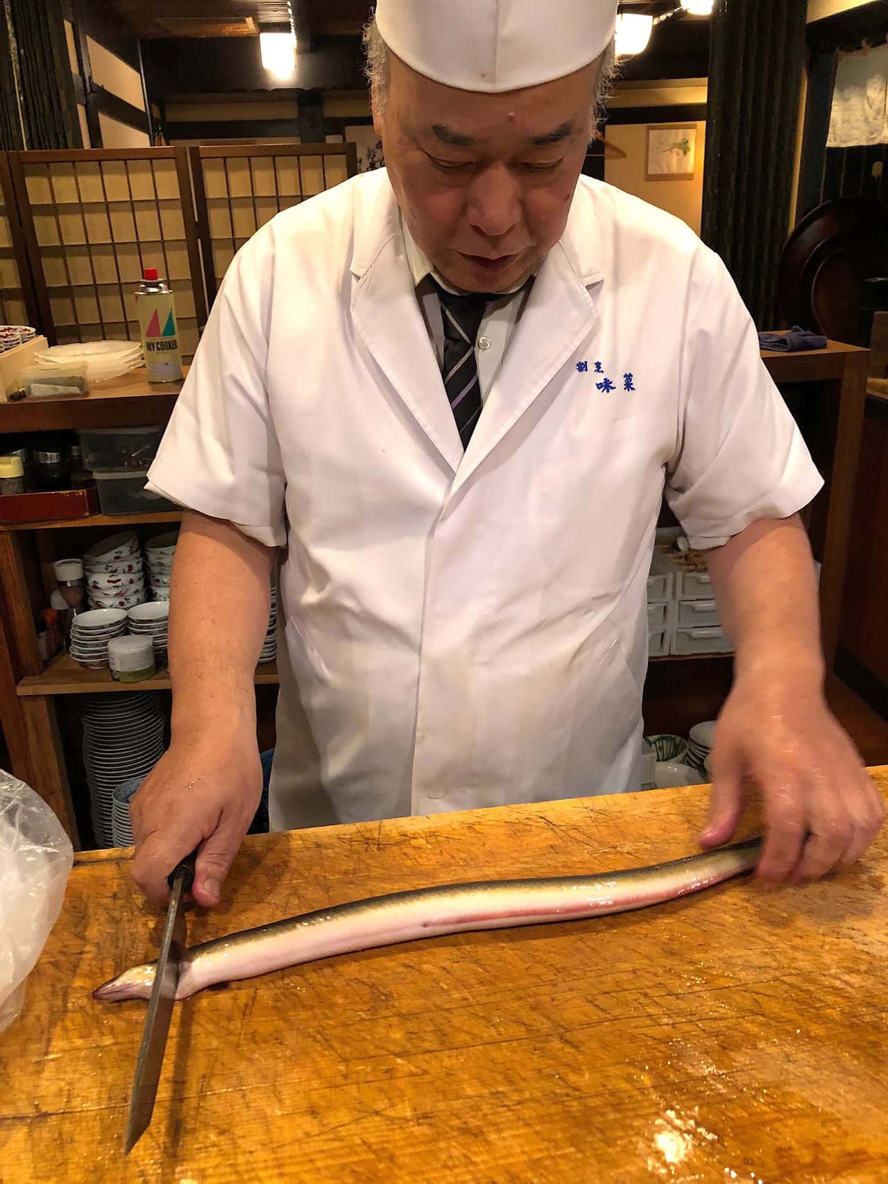 ニッポンさかな酒 淀川天然うなぎに赤ワイン 2020.8.21 吉村 喜彦(よしむら のぶひこ) 印刷する 『バー堂島』『ビアボーイ』などの著者、吉村喜彦氏の連載! 今回は大阪「淀川産天然うなぎ」。 淀川で天然うなぎ?! 暑い日にはウマい魚にお酒をあわせて。ニッポンの酒×魚のお話です。(Sakanadia編集部) 淀川天然うなぎに赤ワイン 文&写真:吉村喜彦淀川で天然うなぎが獲れる、と聞いて驚いた。 教えてくれたのは大阪市漁協の北村英一郎組合長。 「淀川産天然うなぎ」というブランドを仕掛けた人である。 現場を見てみたいと思って、さっそく取材に向かった。 松浦萬治さんこの道65年の漁師、松浦萬治さん(85歳)は、「淀川では、昔から、うなぎ獲れてたよ」と言う。 まったく知らなかった。長柄の堰のあたりに稚魚はうようよいたそうだ。 かつては規制もなく漁業者以外のひともたくさん獲って、小遣い稼ぎをしていたらしい。 松浦さんは言う。 「浜名湖から稚魚を買いに来てたよ。浜名湖のうなぎになって売ってたらしいわ。そやから、味は折り紙付きやってん」 なるほど。そういう考え方もあるのか。 さすが大阪人だと、大阪生まれのぼくは思う。 * * * うなぎは、タンポという竹筒を二、三本束ねた仕掛けで獲る。 夜に「寝床」=タンポに入ってきたうなぎを、朝、引き上げるのである。 淀川の船だまり船だまりは淀川河口から4キロ。 阪神本線の鉄橋すぐ近くの、淀川右岸にある。 電車がごうごうと音たてて橋を渡っていく。その横には高速道路のコンクリート橋が並走している。 このあたり、海の水と川の水が混じりあう汽水区域で、潮の干満の影響を受けるエリアである。 漁は4月から10月まで。資源管理の観点からも仕掛けの数と漁獲期間は決められているそうだ。 タンポは300本、川底に沈められている。エビやカニが入り込み、それを狙って、夜の間にうなぎが来るという。 「淀川のうなぎは餌に不自由せえへんねん。ええもん食うてるよ。そやから美味しいねん」 * * * 松浦さんは獲ったうなぎを活け間に入れて、食べたものを出させ、大阪市漁協ではそのうなぎを1週間ほど畜養する。淀川産天然うなぎはいまや人気が高く、なかなか店で食べられないという。 そんななか、ありがたいことに、漁協に紹介してもらった北新地の日本料理「味菜」でうなぎコースを食べさせてもらった。 まずは、白焼き。 「味菜(あじさい)」の大将・坂本晋(さかもとすすむ)さんが愛を込めて丁寧に焼いてくれる。 「味菜」の大将・坂本晋さん──淀川うなぎの特徴って何ですか? 「焼き上がりがいいんですよ。皮がパリッとしてて、中身がふわっとしてるんですわ」 ──たこ焼きの法則ですね。 「ほんま、ほんま。川を降りてきたやつは、底の潮水のところに3カ月くらいいてるらしいです。それから産卵に向かうんで、そのときにぬめりを貯える。そうすると、焼き上がりがさっぱりします」 ──海に産卵にいく寸前のやつがいいんですか? 「そうです。秋口になったら、たいがい卵もってますわ」 ──大きさはどのくらいのがいいんですか? 「ぼくは1キロ近くのが好きです。1mくらいあります。宇治川とか加茂川から降りてきたやつ。今日のは300グラム。白いところが脂です。秋になると、もっと白くなる。包丁が脂で止まるんですよ」 白焼きをおろし醤油と山葵(わさび)でいただく。すっきりとした脂は、あっという間に舌の上で溶けて消える。灘の名酒、菊正宗のぬる燗を、きゅっ。辛口の日本酒と白焼きは抜群の相性だ。 続いて、蒲焼き。 こんがりと焼かれた、たれのにおいがたまらない。何を合わせようか。 と、ボルドーのリーズナブルな赤がある。 これは、どうだろう? 蒲焼きをひとくち食べ、バロン・ド・レスタックをクイッ。 おっ。イケる。 蒲焼きの香ばしさと甘味のある醤油ベースのたれに、果実味豊かな赤ワインが合っている。 赤の中でもさっぱりとした風味。清涼感があり、背筋がのびている。 シンプルでソリッド。少々スパイシーな感じが、うなぎに良いのではないか。 これは、想定外のマリアージュだ。 大将がカウンターの向こうから、でしょ、とにっこり微笑んでくれる。 ちなみに、この赤ワインの品種は、メルロとカベルネ・ソーヴィニヨンである。 その後、「う巻」「うざく」をいただき、最後に「鰻茶」——。 う巻きうざく鰻茶あっと言う間の至福のひととき。 見るからに脂の乗っていたうなぎだが、食べ終わると、さらっと美味しかった記憶しか残っていない。 まるで、『不思議の国のアリス』のチェシャ猫の笑いのよう。 美味しいもの、一流のものは、すべて押しつけがましくない。 そのことをあらためて、淀川うなぎを食べて思った。 文&写真:吉村喜彦 酒近畿吉村 喜彦(よしむら のぶひこ)1954年大阪生まれ。京都大学教育学部卒業。サントリー宣伝部勤務を経て作家に。 著書に、小説『バー堂島』『バー・リバーサイド』『二子玉川物語』『酒の神さま』(ハルキ文庫) 『ビア・