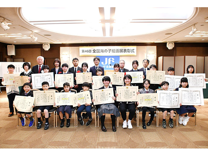 第46回全国海の子絵画展、5年振りに表彰式を実地開催JF全漁連は3月26日、「第46回全国海の子絵画展表彰式」を都内のホテルグランドアーク半蔵門で開催しました。 5年振りの実地開催となった表彰式では、文部科学大臣賞や農林水産大臣賞などの各賞が受賞者に授2024.4.12JFレポートJF全漁連編集部