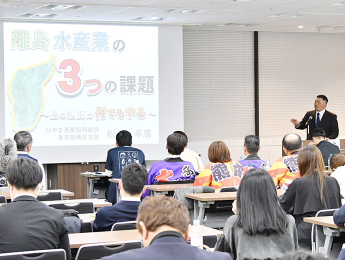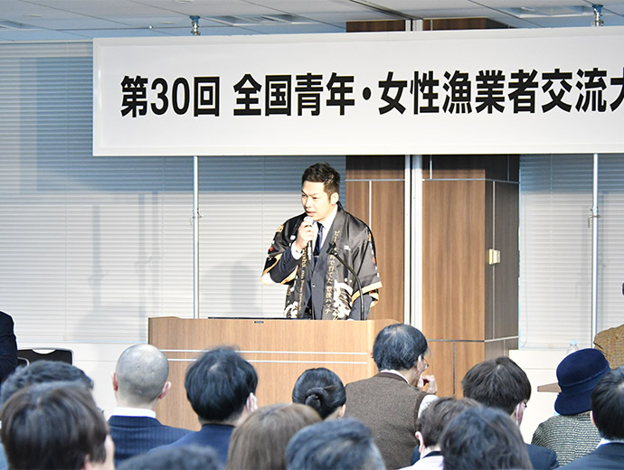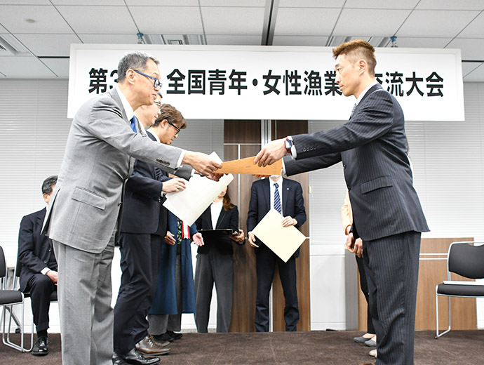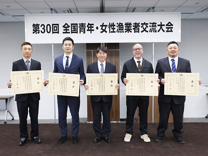 JFレポート 第30回全国青年・女性漁業者交流大会を開催 農林水産大臣賞ほか各賞を決定 2025.3.28 JF全漁連編集部 印刷する JF全漁連は3月4日、5日の2日間、都内のAP日本橋で「第30回全国青年・女性漁業者交流大会」(協賛:JF全国女性連・JF全国漁青連、後援:農林水産省ほか)を開催し、農林水産大臣賞、水産庁長官賞などの各賞を決定しました。 漁業関係者で会場は満席に全国青年・女性漁業者交流大会とは年に一度開催する交流大会は、全国の青年・女性漁業者が日ごろの研究・実践活動の成果を発表する場であるとともに、参加者間の交流により知識や情報を共有・進化させることで、水産業・漁村の発展と活性化に資することを目的としています。 また、水産業・漁村の発展・活性化のための技術・知識などを研鑽する場でもあるため、業界では「漁師の甲子園」とも呼ばれています。 本大会は農林水産祭参加表彰行事でもあり、農林水産大臣賞受賞者は、次年度の農林水産祭天皇杯などの候補になります。 参加者は日ごろの研究・実践活動の成果を発表1日目は5部門に分かれて発表2日間のうち初日は、全国各地からエントリーした漁業者たちが、①資源管理・資源増殖部門、②漁業経営改善部門、③流通・消費拡大部門、④地域活性化部門、⑤多面的機能・環境保全部門の5つの部門に分かれて発表を行い、各部門で3人の専門家が審査委員として審査を行いました。 各部門の会場では、審査委員をはじめ、発表に来場者が真剣に耳を傾ける姿があり、具体的な質問や応答も飛び交いました。 各分科会での発表模様2日目は各部門の講評と農林水産大臣賞受賞作品の発表・表彰2日目は各部門の審査委員から農林水産大臣賞が発表され、併せて講評が述べられました。 続いて、農林水産大臣賞の5部門の受賞者が登壇し、受賞した取り組みについて改めて発表しました。 農林水産大臣賞受賞作品の研究・実践活動を発表する受賞者農林水産大臣賞に選ばれたのは以下の皆さんです(敬称略)。 【第1分科会 資源管理・資源増殖部門】 「未来に向けてイセエビの資源管理を振り返る -綿糸網に紡いできた太海の思い-」 鴨川市漁業協同組合 太海エビ網組合 【第2分科会 漁業経営改善部門】 「ブランドをつくる! -若武者の挑戦- 」 浪井丸天水産 代表 浪井大喜 【第3分科会 流通・消費拡大部門】 「漁師の会社 (同)大兵食品 -漁師による6次産業化の取組-」 合同会社 大兵食品 【第4分科会 地域活性化部門】 「『シロエビが育む地域の未来』 -サステナブルな漁業による地域活性化-」 新湊漁協青年部 野口和宏(富山湾しろえび倶楽部) 【第5分科会 多面的機能・環境保全部門】 「離島水産業の3つの課題 -島の漁師は何でもやる-」 ひやま漁業協同組合 青年部 奥尻支部 各部門の農林水産大臣賞受賞者審査委員長をつとめた東京海洋大学の馬場治名誉教授は「海洋環境の変化が著しい中、発表者からは改善を図ろうとする意欲が伺えた。全国では多様性のある漁業が営まれており、この多様性こそが日本の食を支えている。その日本食を楽しむために多くの外国人が来日しているが、沿岸漁業が衰退すれば、インバウンドの需要に応えられなくなる。小さな成果と思わずに今後もさまざまな取り組みを継続していただきたい」と大会を総括しました。 講評を述べる馬場審査委員長全国水産・海洋高等学校生徒研究発表大会最優秀賞作品の発表全国水産・海洋高等学校生徒研究発表大会で最優秀賞を受賞した新潟県立海洋高等学校 水産資源科資源育成コースの生徒さんが受賞作品の「『越後Wineヒラメ』の開発プロジェクト2023-2024~飼料づくりから始まる、海洋高校産養殖ヒラメのブランド化を目指して~」を発表しました。 新潟県立海洋高等学校水産資源科資源育成コースの生徒による受賞内容の発表各賞発表&表彰式最後に農林水産大臣賞のほか、水産庁長官賞、農林中央金庫理事長賞など各賞が発表され、各賞受賞者の代表者に表彰状が贈呈され、2日間にわたる交流大会は幕を下ろしました。 各賞受賞の代表者に表彰状を贈呈* * * ▶全国青年・女性漁業者交流大会の特設ページはこちら 女性JF全漁連漁協(JF)女性活躍資源管理水産改革青年部イベント女性部JF全漁連編集部漁師の団体JF(漁業協同組合)の全国組織として、日本各地のかっこいい漁師、漁村で働く人々、美味しいお魚を皆様にご紹介します。 地域産業としての成功事例や、地域リーダーの言葉から、ビジネスにも役立つ話題も提供します。 SakanadiaFacebookこのライターの記事をもっと読む