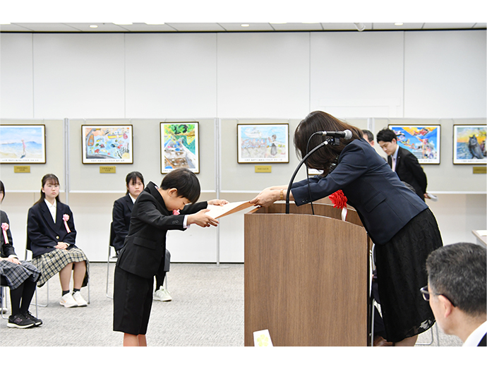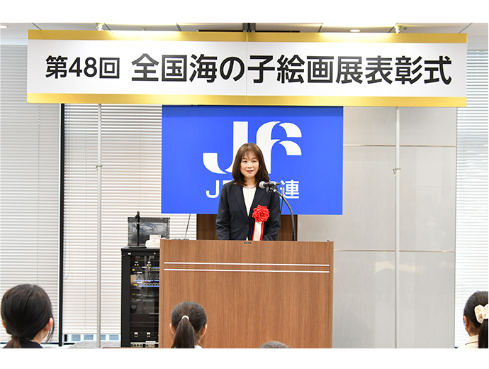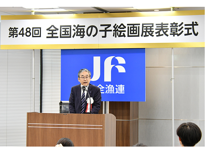 JFレポート 第48回全国海の子絵画展を開催 表彰式で大臣賞などを受賞者に授与 2026.4.23 JF全漁連編集部 印刷する JF全漁連は3月27日、「第48回全国海の子絵画展表彰式」を都内のAP日本橋で開催し、文部科学大臣賞や農林水産大臣賞などの各賞を受賞者に授与しました。 全国から6,506作品が出品、28作品が特別賞を受賞「全国海の子絵画展」は、小・中学生の皆さんが絵を描くことを通して、海に対する興味や、漁業に対する理解、夢をもって成長して欲しいという願いを込めて、1978年から毎年開催しているものです。 文部科学大臣賞(小学校の部)を受賞した山下結熙さんの「カラフルな海」文部科学大臣賞(中学校の部)を受賞した杉本奈々さんの「朝の海」応募対象は、全国の漁業協同組合連合会、信用漁業協同組合連合会、県漁業協同組合および関係団体が主催・共催または後援する道府県の海の子作品展(2025年1月から同年12月までに実施)などにおいて、優秀な成績をおさめた作品。 農林水産大臣賞(小学校の部)を受賞した永田姫蓮さんの「ちょうしのキンメダイ」農林水産大臣賞(中学校の部)を受賞した前田泰志さんの「出航の合図~願いの帆~」48回目となる今回は、全国から533校(小学校412校、中学校121校)が参加し、6,506作品(うち小学校の部5,594作品、中学校の部912作品)が応募されました。このうち各道府県の厳しい審査を通過した111作品(小学校73作品、中学校38作品)が全国展に出品され、その中から28作品(小学校18作品、中学校10作品)が文部科学大臣賞や農林水産大臣賞などの特別賞を受賞しました。 特別賞入賞者の一覧は、JF全漁連公式WEBサイトに掲載しています。 表彰式では特別賞受賞者に表彰状を授与このほど開催された表彰式では、JF全漁連の木村直人常務による主催者挨拶の後、特別賞受賞者への賞状授与が行われました。 主催者挨拶する木村JF全漁連常務特別賞受賞者への賞状授与が行われました審査講評として、文部科学省初等中等教育局教育課程課の小林恭代教科調査官は、「今年度も海や漁業について、感じたことや考えたこと、そこから想像した世界など、皆さんの思いの込められた素晴らしい作品と出会うことができて、とても元気をいただきました。これからの海がこんなふうになってほしいという思いを、今後も絵に表現していってほしい」と講評を述べました。 講評を述べる小林教科調査官来年も開催する予定ですので、想像力あふれる楽しい作品をお待ちしております。 子ども海の子絵画展JF全漁連イベントJF全漁連編集部漁師の団体JF(漁業協同組合)の全国組織として、日本各地のかっこいい漁師、漁村で働く人々、美味しいお魚を皆様にご紹介します。 地域産業としての成功事例や、地域リーダーの言葉から、ビジネスにも役立つ話題も提供します。 SakanadiaFacebookこのライターの記事をもっと読む