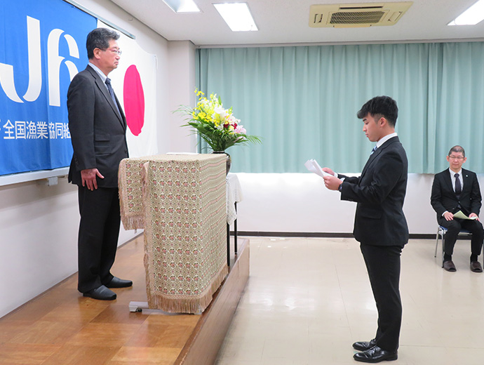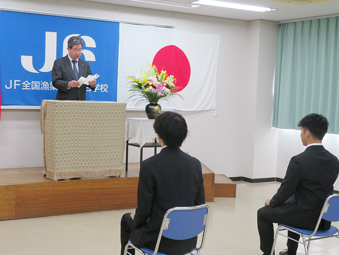 JFレポート 組合学校に第86期生2人が入学 2025.4.16 JF全漁連編集部 印刷する 「協同組合精神を持った漁協職員を養成すること」を目的としたJFグループ唯一の教育機関であ る全国漁業協同組合学校(以下、組合学校)は4月4日、第86期生の入学式を行いました。 第86期生との記念撮影本年度は、北海道から櫻庭明南さんと小野陽大さんの2人(新卒者)が入学しました。 入学式で坂本雅信校長(JF全漁連会長)は、新入生に歓迎の意を示すとともに学校生活の心構えを紹介した上で、「皆さんが、お互いに助け合って1年間の学習と寮生活を全うし、知識を習得し、絆を深め、たくましく成長することを心から願います」と述べました。 訓辞を述べる坂本校長このほか、農林中央金庫の佐藤重史JFマリンバンク部長、日本漁船保険組合の吹上圭一専務、全国漁業協同組合学校同窓会の髙橋忠志会長が、それぞれ祝辞を述べました。 入学生を代表して小野さんが、「私たち86期生は、これから始まる1年間の学校生活で、漁協職員に必要な基礎知識を習得し、資格取得にも励む所存です。また『自主・協同・友愛』の寮訓のもと、仲間との絆を大切にしていきます。そして、数々の貴重な体験を通して視野を広げていき、教養を身に着けられるよう、日々精進していきます」と宣誓しました。 入学生を代表して宣誓する小野さん組合学校の履修科目には、簿記やパソコンなど基本的なビジネススキルのほか、漁業に関する法制度や水産物マーケティングなどの専門的なものもあります。また、座学だけでなく、JFグループのネットワークを活かした漁協での実地研修や中央団体との懇談の場、同じ協同組合の仲間である生協などの視察・訪問も設けられています。 学生たちはこれから1年間、寮で共同生活をしながら、漁協職員としての資質とスキルを磨いていきます。 * * * Sakanadia関連記事 ▶組合学校で第85期卒業式開催 3人が学び舎巣立つ 協同組合JF全漁連若手イベントJF全漁連編集部漁師の団体JF(漁業協同組合)の全国組織として、日本各地のかっこいい漁師、漁村で働く人々、美味しいお魚を皆様にご紹介します。 地域産業としての成功事例や、地域リーダーの言葉から、ビジネスにも役立つ話題も提供します。 SakanadiaFacebookこのライターの記事をもっと読む