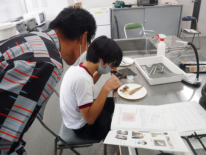 JFレポート 愛知県の中学生が漁業を体験! 「海とお魚漁業体験教室」レポート 2022.12.5 全国の漁連・漁協 印刷する この情報は、愛知県漁業協同組合連合会(JF愛知漁連)の広報誌「あいちの水産」No.383からの転載です。 * * * 愛知県水産試験場では、JF愛知漁連や愛知県水産業振興基金などの協賛を得て、毎年県内漁業地区等の中学生を対象に漁業体験を通して水産業と海に関する知識や技術の学習を行うことにより、水産業に対する関心を深めてもらい、漁業の担い手を育てることを目的として「海とお魚漁業体験教室(少年少女水産教室)」を開催しています。 本年度は昨年度に引き続き感染拡大防止対策を徹底(人数制限、マスクの着用、検温、手指の消毒等)したうえで、7月26日(火)に蒲郡市三谷町にある水産試験場本場において開催しました。 「ノリすき体験」、「ロープ結び体験」、「耳石とり体験」、「VR(ヴァーチャルリアリティ)ゴーグルによる漁業体験」、「愛知県の水産業についての講義」を盛り込んだ密度の濃いものとしました。 以下に、当日の様子を簡単に紹介します。 ノリすき体験愛知県水産試験場で冷凍保存しておいた黒ノリを用いて「ノリすき」を体験してもらいました。 生徒はミンチ~すき~天日干しまでを昔ながらの手作業で行いました。最初は、穴が開いたり、厚みにムラがあったりするのりになってしまいましたが、何枚か挑戦するうちに上手にすくことができるようになりました。 ロープ結び体験日常生活でも役に立つ、巻き結び、一重つぎ、もやい結びの3種類に挑戦しました。 どの結び方も初めて体験する生徒ばかりで、悪戦苦闘する様子がみられましたが、漁業士や試験場職員の指導の下、最終的には全員が3種類の結び方をマスターすることができました。 耳石とり体験ニギスとマイワシの干物を使って「耳石とり」を体験しました。 比較的大きな耳石を持つニギスからは容易に耳石を取り出すことができましたが、マイワシの耳石はとても小さいためなかなか見つけることができない生徒が多い中、手先がとても器用で、手際よく耳石を取り出すことができる生徒もいました。 VR(ヴァーチャルリアリティ)ゴーグルによる漁業体験昨年度導入した機器を使用して伊勢湾における底びき網漁業を体験してもらいました。 ゴーグルを装着すると、水産試験場から船の上へひとっとび! 上を見上げれば青い空、横を見渡せば水平線、下を見れば漁獲された真鯛が足元に広がりました。 愛知県の水産業についての講義唯一の座学でしたが、皆熱心に聞いていました。 県内では唯一蒲郡市内だけにある沖合底びき網漁業の説明を中心に行いました。 そして最後には水産試験副場長から修了証書を受け取り、自らが作った黒板ノリと体験教室の成果を携えて帰路につきました。 生徒の感想を紹介受講した生徒の感想文の一部を紹介します。 * * * ★蒲郡市立三谷中学校 3年男子★ VRゴーグルの中で見たことを、本物の海で体験したいと思いました。ノリすき体験は楽しかった。 ★蒲郡市立三谷中学校 3年男子★ 講義を受けて、船に乗って漁業を見学したり、体験してみたくなった。愛知県の水産業の深い話をもっと聞きたかった。 ★蒲郡市立中部中学校 3年男子★ 耳石とり体験は初めてだったが、魚の頭の中にこんな器官があるなんて知らなかったので勉強になった。 ★西尾市立一色中学校 2年男子★ ロープ結び体験は日常生活でも役に立つと思った。 * * * この日生徒が体験したことや学んだ知識は、本県水産業・水産物への理解と関心を深める一助となったと思われます。 新型コロナウイルス感染拡大防止への配慮から、昨年度は漁業士を講師として招くことができませんでしたが、本年度は感染防止対策の対応を十分に行った上で実際にお招きすることができました。現場の生の声を聞きながら学ぶ機会を提供できたことは、生徒にとって貴重な体験となったことでしょう。 * * * Sakanadia関連情報 ▶JF愛知漁連、第1回伊勢・三河湾における「きれいで豊かな海」に係る勉強会 JF愛知漁連、第1回伊勢・三河湾における「きれいで豊かな海」に係る勉強会 東海漁協(JF)漁師若手全国の漁連・漁協全国の漁連・漁協のお知らせや活動について選り抜きの情報をお伝えします。このライターの記事をもっと読む