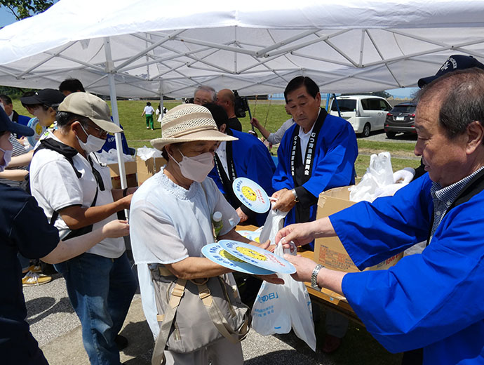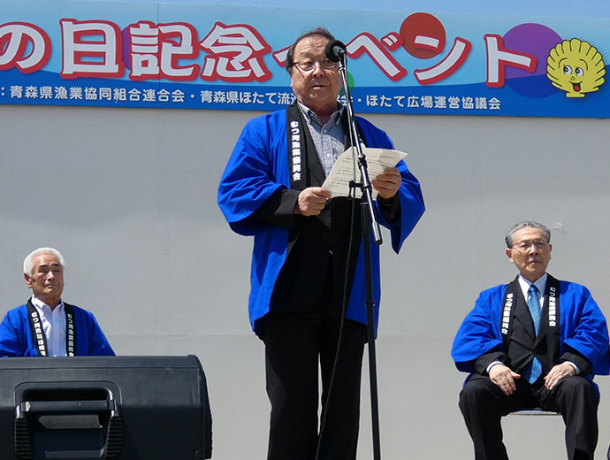 JFレポート 青森県で「ホタテの日」記念イベントや「ほたて供養祭」が開催 2023.9.15 全国の漁連・漁協 印刷する 「ホタテ貝焼無料提供」に並ぶ来場者の列。会場の外まで列が伸びるほどの大盛況でしたこの情報は、青森県漁業協同組合連合会(JF青森漁連)の広報紙「あおもり漁連」No176の転載です。 * * * 青森ホタテのPRと消費拡大のため、JF青森漁連とむつ湾漁業振興会では1998年に「6月18日」を「ホタテの日」と制定し、翌年から記念イベントを開催しています。 ▶「ホタテの日」について紹介したSakanadia記事はこちら 本年は、コロナ禍以降実施していなかった「ホタテ貝焼無料提供」が4年振りに復活し、従来通りの開催となりました。 主催者挨拶をするむつ湾漁業振興会の立石政男会長開会式では、むつ湾漁業振興会の立石政男会長が、「令和2年と3年は、コロナの影響によりイベント中止を余儀なくされましたが、昨年から感染対策を講ずることで開催することができました。陸奥湾のホタテ漁業は、平成22年の高水温による大量へい死は過去最大の被害となりましたが、官民一体となった対策を講じたことで、平成27年には見事100億円産業として復活できました。また、平成28年には254億円という過去最高を記録するとともに、令和に入ってからも安定的な水揚を維持しており、陸奥湾のホタテ産業が本県の基幹産業として発展しております。本日は、日頃から陸奥湾ホタテをご愛用頂いている皆様に感謝の気持ちを込めて、『陸奥湾のおいしいホタテ』を提供させて頂きますので、今後とも宜しくお願い申し上げます」と挨拶を述べました。 続いて、青森県平内町の船橋茂久町長、青森県水産局の山中崇裕局長(種市正之水産振興課長代読)の祝辞を頂きました。 ボイルホタテとうちわを配る、むつ湾漁業振興会立石会長その後、イベントとしてステージ横のテントにおいて、来場者先着500人に対して「ボイルホタテ」と「ホタテの日記念ウチワ」の無料配布が行われました。 また、先述通り「ホタテ貝焼無料提供」の実施、「活ホタテ3㎏」が30人に当たる抽選会に加えて、ステージイベントとして、秋田県湯沢市の「小町娘」による和歌披露、青森県内を拠点に活躍している3人組ユニット「ライスボール」のミニライブが行われました。 当日は早朝から大勢の来場者が駆け付け、大盛況で無事にイベントが終了しました。 ライスボールのミニライブが会場を盛り上げました6/30には「ほたて供養祭」を開催また6月30日(金)には、平内町のほたて広場で「ほたて供養祭」が執り行われました。 開式の儀の後、玉串奉奠を行い、敷地内の「ほたて供養塔」前において、立石政男むつ湾漁業振興会会長、二木春美JF青森漁連会長をはじめ、ホタテ関係者ならびに来賓約30人で「ほたて貝」に感謝の祈りを捧げました。 当日は天候に恵まれ、無事に神事を執り行うことができました。 祈りを捧げる関係者* * * Sakanadia関連記事 ▶第49回「青森の海と川をきれいにする運動」 ▶JF青森漁連、陸奥湾産のホタテを贅沢に使った「ほたてクリームコロッケ」をオンラインで発売中 漁協(JF)漁師東北祭りイベント全国の漁連・漁協全国の漁連・漁協のお知らせや活動について選り抜きの情報をお伝えします。このライターの記事をもっと読む