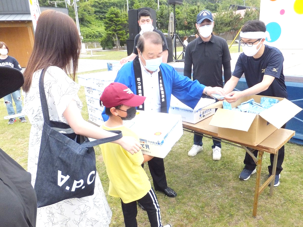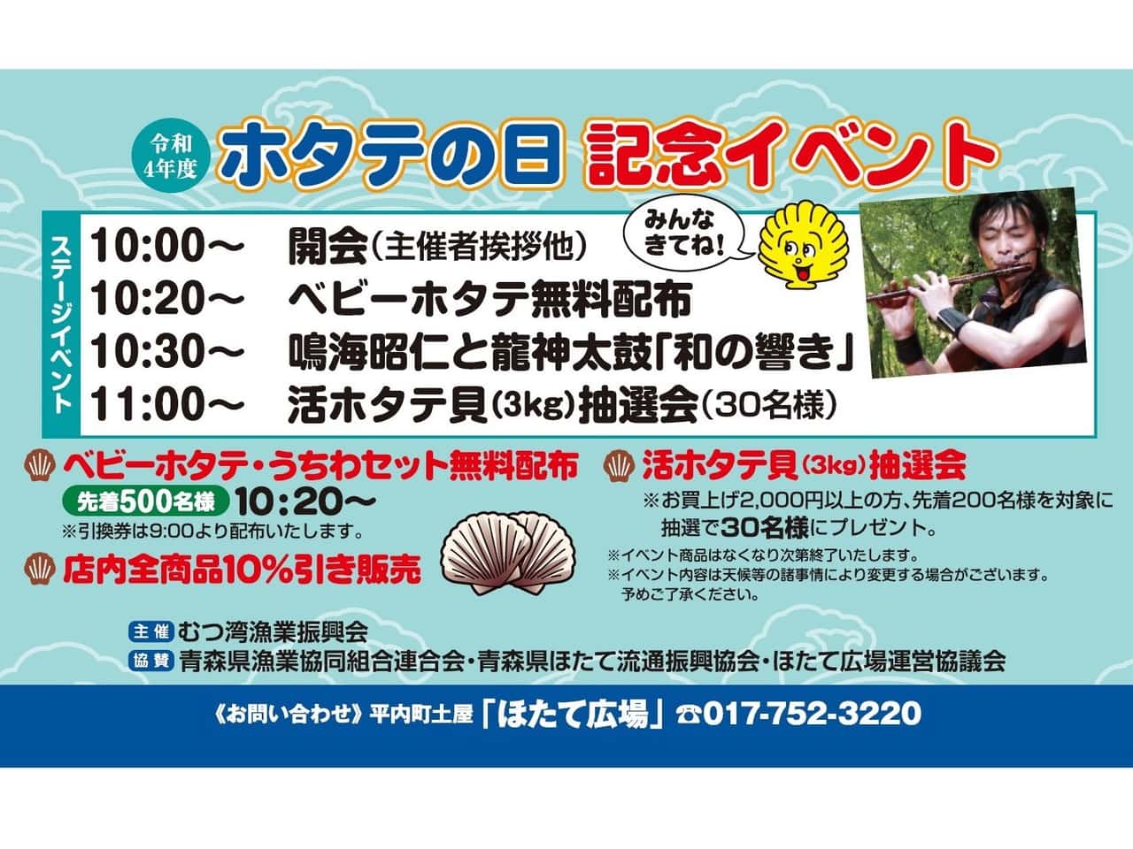 JFレポート JF青森漁連、3年ぶりに「ホタテの日」記念イベントを開催しました 2022.9.20 全国の漁連・漁協 印刷する この情報は、青森県漁業協同組合連合会(JF青森漁連)の広報紙「あおもり漁連」No174の転載です。 * * * ホタテの日陸奥湾ほたて(出典:プライドフィッシュWEBサイト)青森ホタテのPRと消費拡大のため、JF青森漁連とむつ湾漁業振興会では、1998年に「6月18日」を「ホタテの日※」と制定し、翌年から記念イベントを開催しています。 ※「ホタテの日」 6月18日をメインの「ホタテの日」とし、PRと消費拡大を図るためのイベントなどを展開する。合わせて毎月18日も「ホタテの日」とする。 ▶「ホタテの日」青森県ホタテ流通振興協会WEBサイト 令和4年度ホタテの日記念イベント過去2ヶ年は、「新型コロナウイルス」の影響により、代替イベントの開催を余儀なくされましたが、今年は3年振りに青森県東津軽郡平内町の「ほたて広場」で「ホタテの日記念イベント」を開催することができました。 引換券の配布に集まる来場者開会式では、むつ湾漁業振興会の立石政男会長が「今年は感染防止対策を講ずることで、3年振りに開催することができました。陸奥湾のホタテ漁業は、平成22年の高水温による大量へい死は過去最大の被害となりましたが、官民一体となった対策を講じたことで、平成27年には見事100億円産業として復活できました。また、平成28年には254億円という過去最高を記録するとともに、令和に入ってからも安定的な水揚げを維持しており、陸奥湾のホタテ産業が本県の基幹産業として発展しております。本日は、日頃から陸奥湾ホタテをご愛用いただいている皆さまに感謝の気持ちを込めて、『陸奥湾のおいしいホタテ』を提供させていただきますので、今後とも宜しくお願い申し上げます」と挨拶を述べました。 むつ湾漁業振興会の立石会長続いて、平内町の船橋茂久町長、並びに、青森県水産局の山中崇裕局長(白取尚実水産振興課長代読)が祝辞を送りました。 その後、ステージ横のテントにおいて、来場者先着500名様に対して「ベビーホタテ」と「ホタテの日記念うちわ」をセットにして無料配布が行われました。 ベビーホタテとホタテの日記念うちわの無料配布抽選会の様子また、「活ホタテ貝(3㎏)」が30名様に当たる抽選会に加えて、「鳴海昭仁※と竜神太鼓」による「和の響き」が行われ、イベントは大盛況となりました。 ※鳴海昭仁 津軽三味線・横笛・和太鼓奏者で日本郷土芸能研究保存会の総合師範 * * * Sakanadia関連記事 ▶第49回「青森の海と川をきれいにする運動」 ▶JF青森漁連、陸奥湾産のホタテを贅沢に使った「ほたてクリームコロッケ」をオンラインで発売中 食育漁協(JF)漁師東北祭りイベント全国の漁連・漁協全国の漁連・漁協のお知らせや活動について選り抜きの情報をお伝えします。このライターの記事をもっと読む