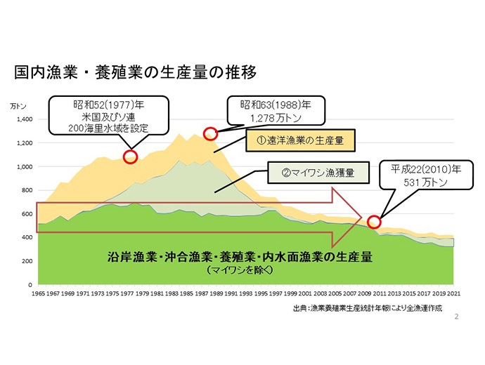 JFレポート特集 【特集 特別座談会】「SDGsから未来の海を考える」前編1/2 2022.12.15 全国の漁連・漁協 印刷する この情報は、北海道漁業協同組合連合会(JF北海道ぎょれん)からの提供です。 前後編を、それぞれ2回にわたって公開します。 以下、前編1/2回目をお届けします。 ※前編2/2回目はこちら * * * <出席者> さかなクン / JF全漁連 魚食普及推進委員 渋澤温之氏(以下、渋澤専務) / パルシステム生活協同組合連合会 代表理事専務 三浦秀樹氏(以下、三浦常務) / 全国漁業協同組合連合会 常務理事 安田昌樹氏(以下、安田専務) / 北海道漁業協同組合連合会 代表理事専務(進行) * * * -安田専務 早速ですが、まずは日本の漁業の現状と世論や国の考え方などを全漁連の三浦常務からお願いします。 - 三浦常務 まず、日本の漁業生産についてお話しすると、総漁獲量は1984年にピークを迎えるとその後はずっと減少し続け、2020年時では423万トンとピーク時の3分の1にまで減少しています。ですがその実態を詳細に見ると、減少は遠洋漁業とマイワシが主な原因で、それ以外の沿岸漁業、沖合漁業、海面養殖業、内水面漁業の生産量はほとんど変動していません。 その原因の一つ、遠洋漁業の生産量は、1970年代の後半から各国が相次いで200海里水域を設定したことで日本の漁船がそれまでの漁場から締め出された結果、大きく減少しました。他方、マイワシの漁獲量についてはレジームシフト(数十年間隔で起こる水温を始めとする気候変動)の影響を強く受けて、ピークの449万トンから大きく減少したことが原因で、これらの影響を除けば日本の漁業・養殖業の生産量には極端な変動が見られていないのが現実です。 JF全漁連の三浦秀樹常務また、マイワシを除いた沿岸漁業は1988年以降、2010年までの20年以上、おおよそなだらかに減少しながらも140万トン前後でずっと推移していました。それが2010年以降、海洋環境の激変により急激に減少し、2020年では74万トンと10年間で約50万トンも減少します。 10年前までの長期的ななだらかな減少の原因の一つに挙げられるのは、高度経済成長以降に行われた沿岸域の開発です。埋め立てなどにより沿岸域にあった藻場・干潟が4割も無くなり、加えて護岸工事等によって森からの栄養塩が海に届かなくなるなど、様々な要因や影響によってアサリを始めとする底生生物、それから魚の稚魚のゆりかごとなっている藻場が減少したことがボディブローのように効いてきて、生物多様性が失われてしまった。こうしたことを要因として徐々に徐々に日本の漁業生産量は減少してきたということです。 こうしたなか、最近は漁業者から海の状況が変わったという声がかなり聞こえます。若手漁業者を中心にアンケートを行ったところ、「漁期が変化してきた」、「南方系の魚が獲れるようになった」など、毎日のように海に出ている漁師のうち、何と96.4%が海洋環境の変化を感じていると答えました。国はこういう事実をしっかりと受け止めながら、現場の声を聞く必要があると我々は考えています。 国内漁業・養殖業の生産量の推移これら海洋環境の変化による漁獲量の大幅な減少というのは、水産食糧の安定供給という観点からも、漁師や沿岸地域の住民だけの問題ではなく、国民全体の脅威となっている、というのが私たちの今の認識です。そして今年の3月、これからの10年間を見据えた水産基本計画が作成されました。そこでようやく国も私たちJFグループがずっと主張し続けてきた海洋環境の激変が資源減少の原因の一つであるとし、計画の前書きにしっかりと記述されると共に、海洋環境の変化を前提とした資源管理を推進していくということになりました。他にも来遊漁をフル活用する魚種転換や養殖業の導入など、沿岸漁業の存続をかけた対応や取組が盛り込まれ、国はこの1~2年の間で「海洋環境の激変を前提とした様々な取組が重要である」という考え方に転嫁してきた、というのが現状だと思っています。 -安田専務 ありがとうございました。今、三浦常務からお話のあったことを踏まえて、今日は「SDGsから未来の海を考える」というテーマで対談を進めたいと思っています。 まずはパルシステムさんから。パルシステムさんは、2017年の12月に政府が新設した「ジャパンSDGsアワード」において、内閣官房長官賞を受賞しました。40年以上の歴史を持つ独自の産直が目指してきたのは、「産地も地域も環境も守っていける持続的な取組」であると伺っていますが、そうした取組について渋澤専務お願いします。 -渋澤専務 今、三浦常務のお話を聞いて、海洋環境が大変な状況だということを改めて感じました。そのうえでSDGsの話をするには、出発点をどこに置くかによって全然捉え方が違ってきます。私たちが1990年代から行ってきた産直の取組について、何を目標に掲げ、何を進めてきたのか。そして、2017年時に今後の計画を含めて検討したなかで、私たちの到達点そのものがSDGsで掲げている2030年の