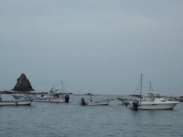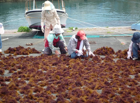 水産業の新戦略 西伊豆町仁科のテングサ~生産から入札まで、高品質の秘訣~ 2021.11.5 田口 さつき(たぐち さつき) 印刷する 古代から伝わる「テングサ」心太(ところてん) 写真提供:JF伊豆煮て溶かした後、凝固する海藻であることから、飛鳥時代に凝海藻(こるもは)と呼ばれていた海産物はなんでしょうか? この海産物は健康や美容にもいいと言われています。答えは、テングサです。テングサは、心太(ところてん)や寒天の原料になります。詳しくいいますと、紅藻類テングサ科に属する海藻のなかで、産業用に利用されているもの(主要なものは5種)をテングサといいます。 静岡県の伊豆半島はテングサの代表的な産地です。伊豆半島では、明治時代にテングサが着生しやすいように石を海に入れる、テングサとなる海藻以外の海藻を刈るといった取り組みが行われました。また、多くの女性が海に潜って、テングサを刈ってきました。なお、ちぎれて流れたテングサを干したものは寄り草(よりくさ)と言われ、浜や磯に打ち上げられたものを集める、あるいは寄り草が溜まった場所を船で桁網状の漁具を曳いて採るといった寄草採りというさまざまな漁法も生まれました。 以下では、伊豆漁業協同組合(JF伊豆)の仁科支所のテングサ漁業について見ていきましょう。現在、仁科支所は、テングサ入札の事務局を担っているため、静岡県産のテングサの情報が集まる場所となっています。 イセエビ漁との共生—テングサ漁(採藻類漁業)解禁日の決め方—テングサの群落(写真提供:静岡県水産・海洋技術研究所伊豆分場)テングサのなかでも品質がよく、生産量が多いのがマクサです。伊豆半島ではマクサは、最も潮が引いたときの陸との境である干潮線から水深15mくらいまでが生育がいいそうです。浅い場所に生えるマクサは、速い汐に耐える強さを持ち、よく光合成していて赤く品質が良く、乾燥させるとオカマグサと呼ばれるところてんなどの原料(原藻)になります。 まず、採藻漁業(テングサを刈る漁業)についてみていきましょう。仁科支所は良質なマクサが豊富に茂る漁場に恵まれています。これらの漁場ではイセエビも採れるので、操業中の事故を防ぐために、採藻漁業ができる期間(5月末~9月初旬)とイセエビの刺し網を設置できる期間(9月中旬~翌年5月中旬)を分けています。そのため、テングサを刈る人々に漁場を解禁する日を定めることは、仁科支所の支所運営委員会の重要な仕事の1つです。 テングサ漁の様子毎年4月に静岡県水産・海洋技術研究所伊豆分場(伊豆分場)の職員と各浜の漁業者が連携して、テングサの作柄予測調査を行います。仁科支所では、支所運営委員会の役員が漁船を出し、伊豆分場の研究員と一緒に定点観測地点までいきます。すると、研究員は海に潜り、テングサの群落の広がりや単位面積あたりの着生量などを観測します。そして研究員は、テングサの生え具合など例年と比較し、各支所に報告書を渡します。 この報告書の内容や海の水温、天候などに基づいて、支所運営委員会が協議して、解禁日を決定します。そして、いよいよ漁が始まります。解禁日初日と2日目の午前6時半に西伊豆町役場が解禁日であることを放送で伝えます。また、仁科支所の建物に旗が掲げられます。この合図を受けて、漁業者は海へ向かうのです。 潜水で刈り取る「採藻漁業」—採りすぎないためのルール—潜水しテングサを刈る様子 静岡縣賀茂郡白浜村役場(1954)「テングサの沿革」陸から泳いで浅い場所で潜水をする人、1つの漁船に3~4人が乗って移動し沖側の海に潜る人など、漁業者は自分のやり方に合わせてテングサを刈ります。全ての漁業者の1日の操業時間は8時から15時までと決まっています。このように時間を合わせることで、漁業者は抜け駆けをすることもなく、秩序を保って仕事ができます。また、漁業者が長時間潜ることで採り過ぎにならないよう、原則空気ボンベを使うことは禁止されています。とはいえ、海のなかで長時間作業をするのはつらいので、操業時間前に作業を終える人も多いのです。 漁業者は刈ったテングサをスカリと呼ばれる網袋に入れます。このスカリがいっぱいになると15~20㎏になります。刈ったテングサはすぐに乾燥させないと、品質が下がります。そのため、漁業者が海に潜るのは晴れた日だけです。 テングサを引き上げる漁業者品質のためにテングサはすぐに乾かすことが必要手早く乾燥作業に移らないといけないので、1回潜っては刈ったテングサを持ち帰る人、満杯のスカリを陸で待つ人に渡し、潜水作業を続ける人など、人それぞれです。自分が陸に戻るときに他の人のスカリも持ち帰るといった助け合いも行われています。 漁業者はテングサを1日で乾燥させた後、自分の倉庫のなかに保管します。そして、天気が悪く漁に行けない時期に選別(伊豆では「改良」といいます)を行います。 一方、寄り草は、波打ち際や海の特定の場所に溜まるテングサを集めるため漁期は