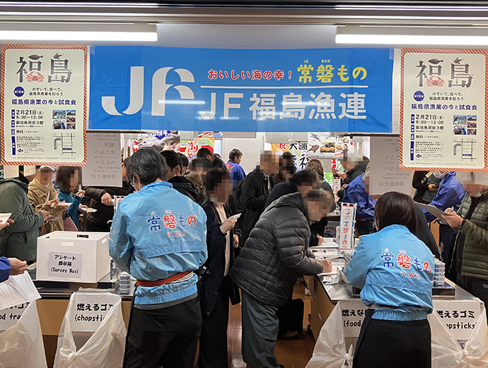 JFレポート JF福島漁連が「福島県漁業の今と試食会」開催 旬のヒラメ、アンコウ、メヒカリをPR 2026.4.6 JF全漁連編集部 印刷する JF福島漁連は2月21日(土)、都内の「築地魚河岸」イベントスペースで、「のぞいて、食べて、福島県漁業を知ろう 福島県漁業の今と試食会」を開催しました。 19回目となる今回は、福島県産の魚の安全性を紹介するパネル展示のほか、福島の前浜で獲れたヒラメやアンコウ、メヒカリを使った料理が無料で振る舞い、来場者に福島県産水産物の美味しさや品質の良さをPRしました。 ヒラメ、アンコウ、メヒカリを使った料理が無料でふるまわれました試食会の冒頭、野﨑哲JF福島漁連会長は、「今回、19回目となる試食会は『常磐もの』復興の歩みの歴史といえる。我々が自信をもって届けている魚を是非たべていただきたい」と挨拶しました。 挨拶する野﨑JF福島漁連会長今回試食会で振るまわれた料理は、「ヒラメの刺身」、「アンコウのから揚げ」、「メヒカリの丸干し」の3品で、それぞれ約1,000食分が用意されました。市場関係者をはじめ、海外からの観光客や子ども連れなど、多くの来場者が福島県産の魚の美味しさに舌鼓を打ちました。 試食で振る舞われたヒラメの刺身」、「アンコウのから揚げ」、「メヒカリの丸干し」の3品試食後、アンケートに答えた来場者には、お礼品としてJF福島漁連が5年ぶりに販売を始めた缶詰「魚屋が選んだ さんま蒲焼」がプレゼントされました。 アンケートに答えた来場者にプレゼントされた「魚屋が選んだ さんま蒲焼」漁協(JF)東北イベントJF全漁連編集部漁師の団体JF(漁業協同組合)の全国組織として、日本各地のかっこいい漁師、漁村で働く人々、美味しいお魚を皆様にご紹介します。 地域産業としての成功事例や、地域リーダーの言葉から、ビジネスにも役立つ話題も提供します。 SakanadiaFacebookこのライターの記事をもっと読む
