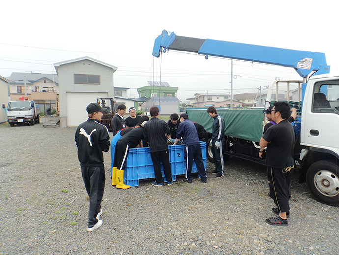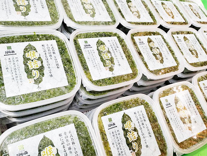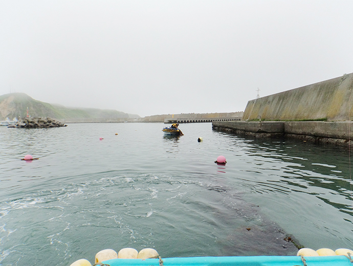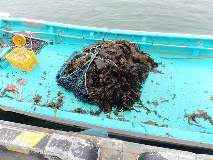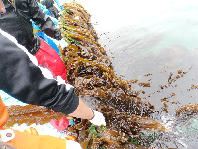 水産業の新戦略 仲間と一緒にトロロコンブを継承~JF昆布森青年部~ 2026.1.22 田口 さつき(たぐち さつき) 印刷する 将来のため、トロロコンブ養殖に挑戦北海道釧路郡釧路町の豊かなコンブが育つ海に恵まれた昆布森漁業協同組合(以下、JF昆布森)は、サケ定置網漁業、コンブ漁、ウニ漁、カキ養殖が盛んで、ほとんどの組合員がコンブ漁を営んでいます。しかし、高水温などの影響のためか、コンブ類の漁獲量は年々減少し、繁茂するコンブ類の種類も変化してきています。 なかでも、トロロコンブは地元で親しまれていたコンブで、年々、漁獲量が減っていたことからJF昆布森青年部(部員30人)が2012年から養殖に挑戦しました。変わりゆく海に対し、「漁業に就業してから漁模様が悪いことが続いている」というように漁業者の不安も募っています。そのような不安を乗り越えるため、部員は養殖技術を確立し、将来の漁業の芽を育てようとしています。以下では、JF昆布森青年部によるトロロコンブ養殖についての研究をみていきましょう。 地元で親しまれるトロロコンブ(写真提供:JF昆布森)種付けと収穫は全員参加JF昆布森青年部の主な活動は、1)トロロコンブ養殖の研究、2)地元の魚介類の販売促進、3)地元の浜の清掃の3つです。 トロロコンブ養殖の研究は、このままでは天然のトロロコンブが絶滅してしまうのではないかという危機感から始まりました。現在、青年部のなかにトロロコンブ班があり、2人の担当者がいます。また、青年部の研究なのでトロロコンブの種付けと収穫のときは、全員が参加しています。 それでは、種付けから収穫まで2年かかる、トロロコンブ生産の流れをみていきましょう。毎年、11月初旬にトロロコンブの胞子を海水に入れ、そのなかにロープをつけます。この過程はどぶ漬けといわれています。なお、このロープは長さ100m、直径24mmのしっかりしたものを使います。直径が大きいことで、トロロコンブの付着部がしっかり固定されます。このような資材の用意などは青年部事務局がしています。 胞子がロープについたのを確認した後、水深50cmほどの浅い場所に、ロープに浮きと錘をつけ、水面に対し、平行にロープを張ります。トロロコンブ自体が静穏域でないと育たない繊細な海藻なので、青年部は漁港内の岸壁にロープを張っています。 胞子がついたロープの設置方法を説明するJF昆布森青年部長の成田大佐(なりただいすけ)さん漁港内のトロロコンブ養殖施設 (写真提供:JF昆布森)仕事の合間を縫ってトロロコンブ養殖作業その後、冬の間から翌年の5月まで、トロロコンブの成長や海の状況に合わせてロープを水深50cmの状況を保つために浮きを増やす調整をします。そして5月頃にトロロコンブの成育状況を確認します。 トロロコンブが長く伸びるころ、光を十分に当てるため、ロープについているオニコンブやスジメコンブといった海藻の間引きを年に数回行います。このとき、トロロコンブの一部も間引きします。この作業は7~8月の暑いときに、青年部の部員が汗をかきながら船上で行っています。 この時期は、部員たちにとってコンブ漁と原藻の乾燥作業を行う繁忙期でもあります。コンブ漁は午前5時から開始となり、長くても3時間ほど漁を行い、その後、乾燥作業に入ります。そのため、部員は一連の作業を終えた16時から、トロロコンブの間引き作業に参加します。また、成長を調べるため定期的にロープごとトロロコンブの重さも測って記録しています。 9~10月は、トロロコンブの経過観察の時期となり、重量を測る成長調査は継続します。そして、翌年の6~8月にいよいよトロロコンブが収穫されます。 定期的にトロロコンブの成長状況を観測(JF昆布森)収穫されたトロロコンブ(写真提供:JF昆布森)トロロコンブの収穫と種苗の準備全員参加でトロロコンブを収穫したのち、加工が行われます。まず、収穫したトロロコンブを湯のなかにいれて湯がきます。このとき、トロロコンブが緑色に変化します。それを冷水で冷やして刻み、1パックあたり、120g詰めて冷凍保存します。このパックを地元の道の駅や飲食店に出荷します。また、一部は乾燥させて乾燥とろろとして販売します。 ところで収穫時には次世代のトロロコンブの準備というもう1つの重要な作業があります。トロロコンブの種苗は、当初は沿岸の株の胞子から得ていましたが、現在は養殖した株の胞子を使っています。11月から4か月の間に母藻を100株用意します。そして、胞子をとりやすいように陰干しします。この過程を庵蒸(あんじょう)といいます。その後、一晩寝かして海水に母藻をつけ、胞子を出させ、どぶ漬けが行われます。 トロロコンブ養殖技術は、釧路地区水産指導所の支援や助言を受けています。毎年、胞子の数を同指導所に調べてもらい、事務局が記録しています。 パック詰めになったトロロコンブ(写真提供:JF昆布森)乾燥とろろを製造するため干場にトロロコンブを移動(写真提供:JF昆布森)皆で育てた