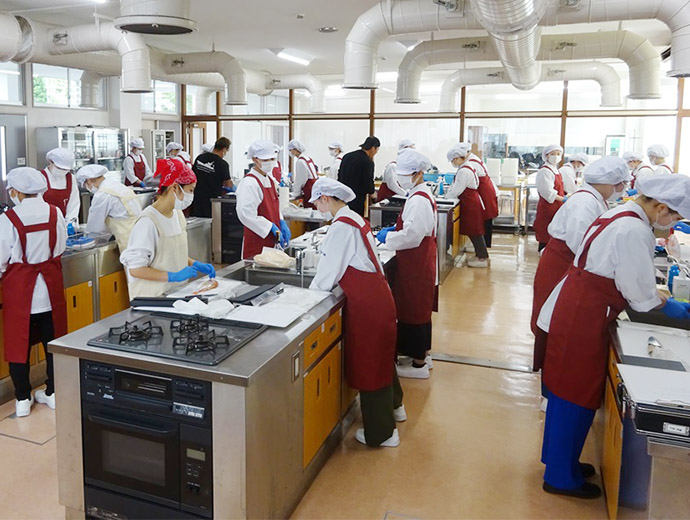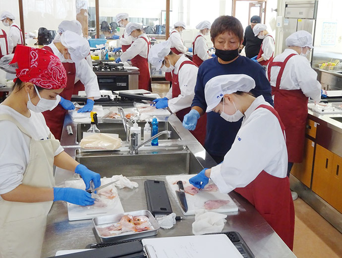 JFレポート 長崎県漁青連が魚食普及を目的に長崎女子短期大学と水産教室開催 2024.12.24 全国の漁連・漁協 印刷する この情報は、長崎県漁業協同組合連合会(JF長崎漁連)からの提供です。 * * * 長崎県漁協青壮年部連合会(以下、長崎県漁青連)は10月28日、長崎女子短期大学の栄養士コースを受講している学生を対象とした「水産教室」を開催しました(11月28日には2年生を対象に開催)。 長崎女子短期大学の栄養士コースの学生は卒業後、栄養士の資格が与えられ、病院や保育園、高齢福祉施設等で栄養管理のプロフェッショナルとしての活躍が期待されています。 長崎県漁青連では、この水産教室をきっかけに長崎県の魚に親しんでもらい、将来、食のプロとして活躍する際に魚を使った料理を積極的に作ってもらうことを目的に「水産教室」を開催しています。 今回、「水産教室」に参加した生徒は1年生28人。長崎県漁青連の役員が漁獲したレンコダイを3枚おろしにした後、片身を刺し身、もう片身をソテー(ムニエル)にして、アラを使って出汁を取った汁物をつくり、試食しました。 * * * Sakanadia関連記事 ▶JF長崎漁連が「第27回全国青年漁業者交流会長崎県大会」を開催 ▶毎年大好評の長崎県漁青連の「煮干しの水族館」も実施!! 第41回長崎さかな祭り 食育漁協(JF)漁師九州青年部イベント全国の漁連・漁協全国の漁連・漁協のお知らせや活動について選り抜きの情報をお伝えします。このライターの記事をもっと読む