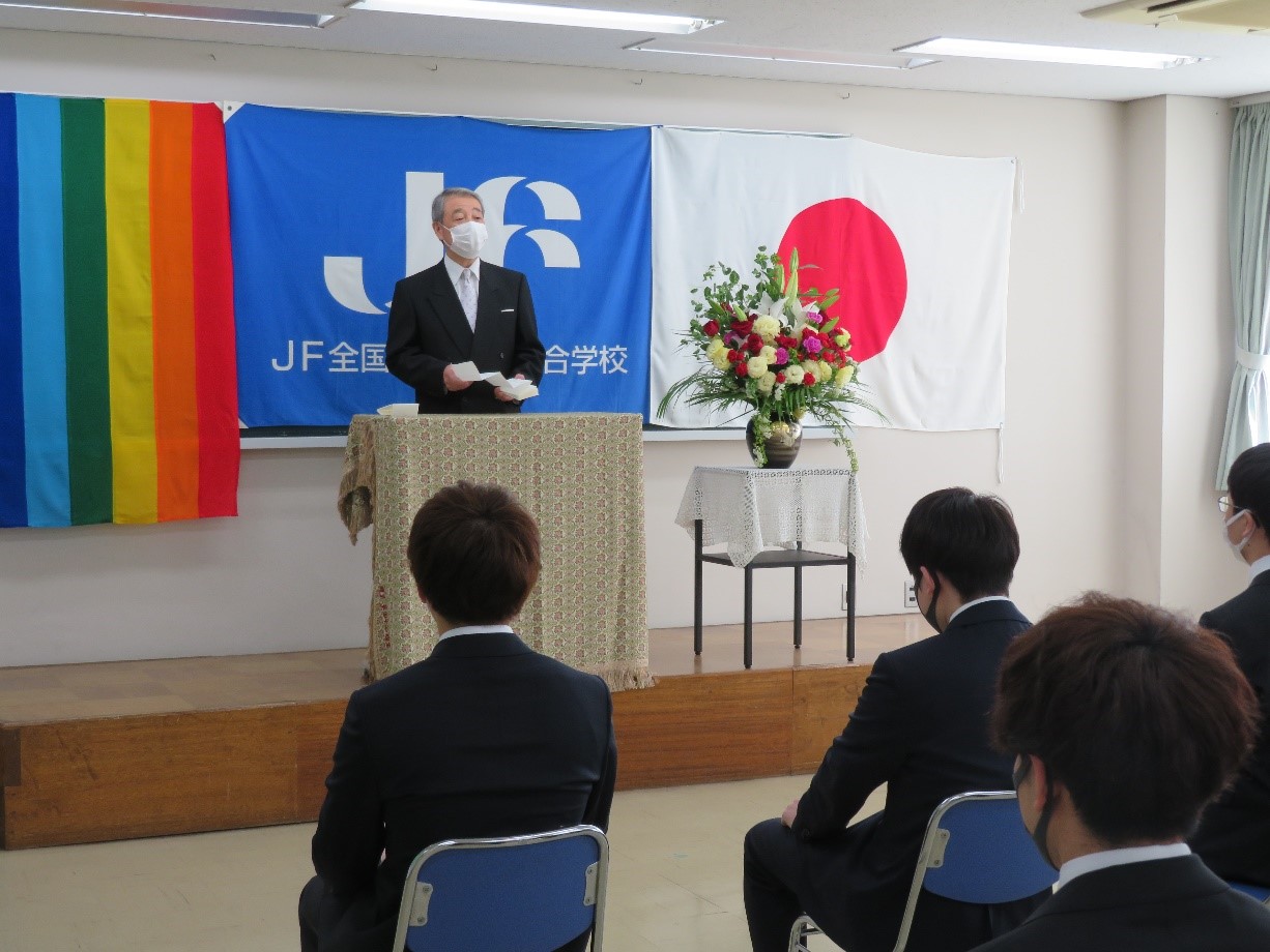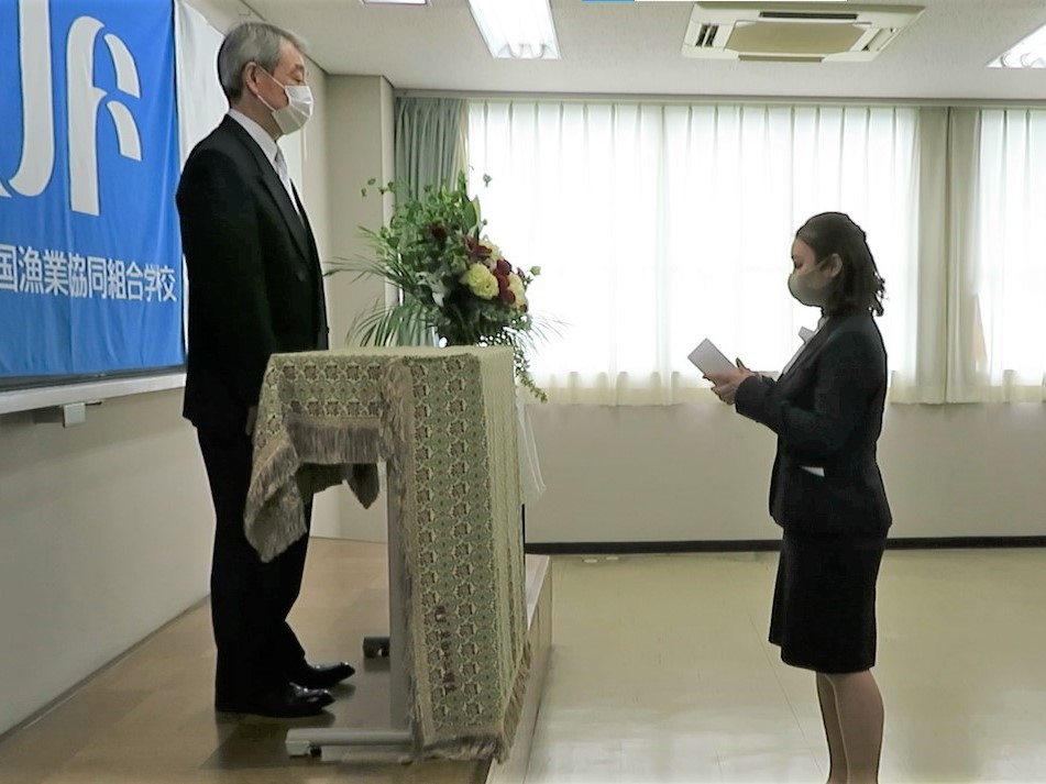 JFレポート 14人が入学、全国漁業協同組合学校2021年度第82期入学式 2021.4.20 JF全漁連編集部 印刷する 漁協(JF)職員を養成する全国漁業協同組合学校(千葉県・柏市)は4月6日(火)、第82期生の入学式を行いました。 今年度は14人(北海道6人、千葉県4人、京都府1人、和歌山県1人、広島県1人、愛媛県1人)が入学。 吉田博身校長は、一年後の成長した姿を思い描き「一年後の今頃には、JFの若き担い手として、どのようなチャレンジをしてくれるかを思うと、今から期待が膨らみます」と訓示を述べました。 このほか、JF全漁連の中平和典専務、農林中央金庫JFマリンバンクの木村直人部長、JF共水連の山下恭助常務、全国漁業協同組合学校同窓会の髙橋忠志会長が、それぞれ祝辞を述べました。 入学生を代表してあいさつをしたのは、坂本葉月さん(千葉県)。「この一年間の寮生活で、“自主・協同・友愛”の精神を基に、お世話になる先生方や関係団体の皆様、そして故郷から期待を込めて送り出してくれた家族や友人の皆様に、大きく成長した姿を見て頂けるよう、仲間と共に互いに高め合いながらそれぞれの目標を成し遂げていきたいと思っています」と強い意志を伝えました。 学生たちは、寮で共同生活をしながら、漁協職員としての資質とスキルを磨いていきます。 履修科目には、簿記やパソコンなど基本的なビジネススキルのほか、漁業に関する法制度や水産物マーケティングなどの専門的なものもあります。また、座学だけでなく、JFグループのネットワークを活かした漁協での実地研修や中央団体との懇談の場も設けられています。 昨年度、全国漁業協同組合学校はコロナ禍にも関わらず就職率100%でした。凝縮した学びと経験を積み重ねた多くの卒業生たちが、水産業界で活躍しています。 組合学校漁協(JF)JF全漁連編集部漁師の団体JF(漁業協同組合)の全国組織として、日本各地のかっこいい漁師、漁村で働く人々、美味しいお魚を皆様にご紹介します。 地域産業としての成功事例や、地域リーダーの言葉から、ビジネスにも役立つ話題も提供します。 SakanadiaFacebookこのライターの記事をもっと読む