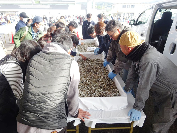 JFレポート 毎年好評の長崎県漁青連「煮干しの水族館」を開催!第42回長崎さかな祭り 2025.12.24 全国の漁連・漁協 印刷する この情報は、長崎県漁業協同組合連合会(JF長崎漁連)からの提供です。 * * * 第42回長崎さかな祭り(主催:長崎さかな祭り運営協議会/一般社団法人 長崎魚市場協会)が11月2日に長崎魚市場内で開催されました。 長崎県漁協青壮年部連合会(以下、長崎県漁青連)では、毎年好評の「煮干の水族館」を実施しました。 「煮干しの水族館」は、いろいろな魚の煮干しがぎっしり詰まった中から、台紙に描かれている11種類を見つけ出すというものです。 長崎県は、煮干の生産量全国1位ということもあり、気軽に煮干しに触れあってほしいとの思いで、「煮干しの水族館」を開催しています。 毎年、幅広い年齢層の方で大変賑わうイベントですが、特に子供たちからの人気は高く、魚を必死に探し出す姿はとても印象的でした。 * * * Sakanadia関連記事 ▶JF長崎漁連が「第28回全国青年漁業者交流会長崎県大会」が開催 ▶長崎県漁青連、長崎女子短期大学との水産教室を開催 漁師九州魚市場祭り青年部全国の漁連・漁協全国の漁連・漁協のお知らせや活動について選り抜きの情報をお伝えします。このライターの記事をもっと読む