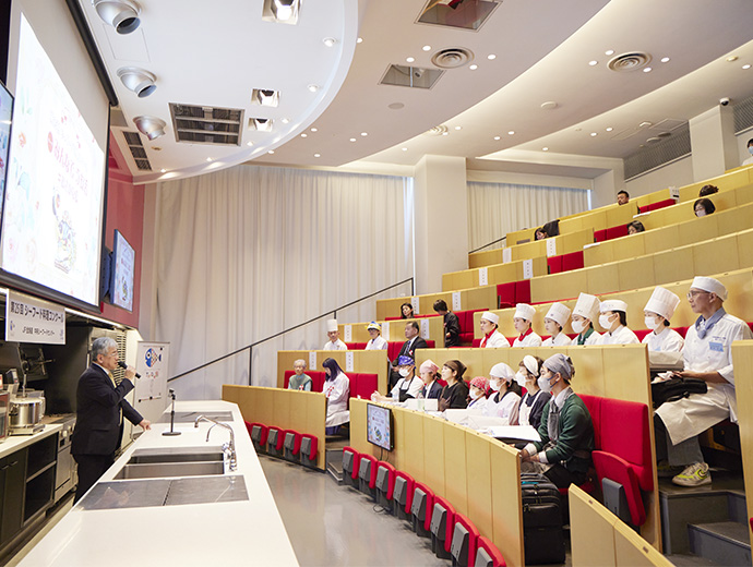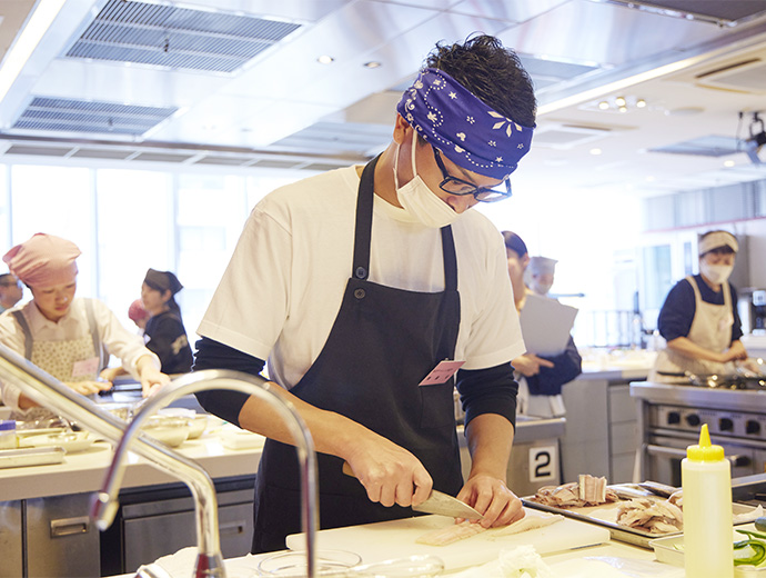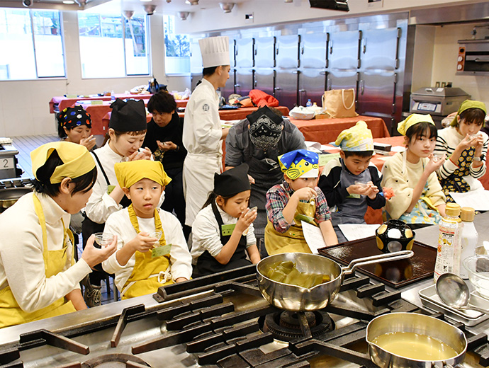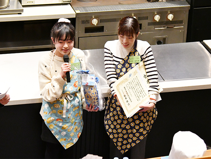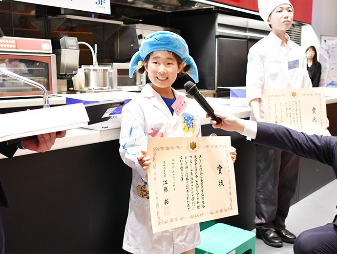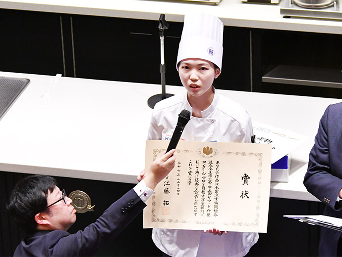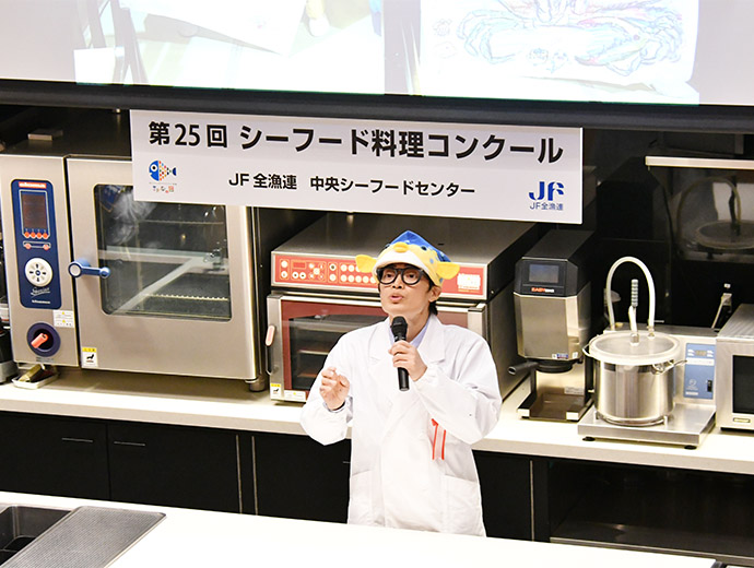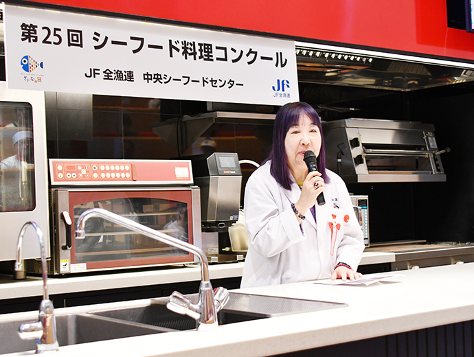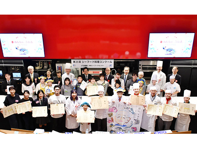 JFレポート 第25回シーフード料理コンクール開催! 25周年記念で「親子で魚活チャレンジ部門」も実施 2024.12.26 JF全漁連編集部 印刷する JF全漁連は12月14日(土)、東京・服部栄養専門学校で第25回シーフード料理コンクールの実技審査・表彰式を開催しました。 各賞決定後の記念撮影本年のテーマは、「みんなでうお活 #おさかな愛」。今回は、従来からある「プロを目指す学生部門」、「魚活チャレンジ部門」のほか、25 周年記念特別部門の「親子で魚活チャレンジ部門」(小学生親子対象)の計 3 部門で、7月1日~9月20日の約3か月間、オリジナルレシピを募集しました。 その結果、2,113作品(プロを目指す学生部門1,270作品、魚活チャレンジ部門768作品、親子で魚活チャレンジ部門75作品)の応募があり、厳正な書類審査の結果、このうち19作品(親子部門5作品、その他は各7作品)が最終審査に残りました。 参加者はそれぞれ、使用する魚や地元への想いを込めたレシピで腕を振るい、服部津貴子審査委員長をはじめとした審査委員の実技・試食審査により各賞が決定しました。 調理を行う参加者たち開会式では、主催者を代表して、JF全漁連の三浦秀樹常務があいさつしました。 初回から審査委員長を務めていた故服部幸應さんを追悼しながら、「この料理コンクールは多くの人たちにおいしい水産物をたくさん食べてもらうことを目的に開催している。いちばん大切なのは楽しむこと。きょう一日、大いに楽しんでほしい」と参加者にエールを送りました。 主催者を代表してあいさつする三浦JF全漁連常務実技審査開会式の後、実技審査が始まりました。 「魚活チャレンジ部門」は「大好きなおさかな料理をワンパンで」、「プロを目指す学生部門」は「おさかな愛を伝えたい!自慢のおさかな料理♡」をサブテーマに、参加者14人がそれぞれ考案した国産魚介藻類を使用したオリジナル料理をつくりました。 「魚活チャレンジ部門」の実技審査の模様「プロを目指す学生部門」の実技審査の模様25周年特別部門の「親子で魚活チャレンジ部門」では、「おさかなおにぎりを作ろう」をサブテーマに、具材に国産魚介藻類を使ったアイデアおにぎりを参加した5組の親子が仲良く分担して作りました。 参加者たちは審査委員が見つめる中、緊張しながら調理を進め、おにぎりをつくることができました。 「親子で魚活チャレンジ部門」の実技審査の模様おにぎりの調理・試食審査の前には、プライドフィッシュプロジェクト10周年を記念し、プライドフィッシュの「いしかわのサワラ」、「沖縄県産車海老」を使った特製お汁のデモンストレーションも行われました。 服部栄養専門学校の先生がコンブなどからのだしの取り方やサワラなどの魚の捌き方を紹介しました。先生がコンブからひいただしを味見した子供たちはそのおいしさに驚いていました。 コンブなどからのだしの取り方をレクチャーコンブからひいただしを味見する参加者たちさかなクンによる25周年記念講演審査結果を待つ間、JF全漁連魚食普及推進委員のさかなクンがシーフード料理コンクール25周年を記念した講演「さかなクン~お魚の感動をギョ一緒にレッツ・ギョー!~」を行いました。 さかなクンは、日本全体では食用としてあまり知られていない、流通していない低利用魚・未利用魚の魅力や活用方法などについて紹介。「日本産水産物は低利用魚・未利用魚も含めた美味しいので、料理などに活用してほしい」とPRしました。 講演をするさかなクン審査発表・表彰式最後に審査発表・表彰式が行われました。 各賞の受賞者が発表され、それぞれの賞の表彰状と記念品がプレゼンターから授与されました。 最優秀賞の農林水産大臣賞は、魚活チャレンジ部門が「ボラのカレーたまごチーズサンド」(中山真穂さん・津市立新町小学校2年)、プロを目指す学生部門が「ホタテとイチゴのカルパッチョ風ドルチェ スパークリングワイン仕立て」(田畑采八果さん・服部栄養専門学校 調理師科昼間部1年)がそれぞれ受賞。親子で魚活チャレンジ部門では、「まるごとホタテのカレーおにぎり」(中村亜希恵さん、柚月さん親子)が最優秀賞の全国漁業協同組合連合会会長賞を受賞しました。 魚活チャレンジ部門で農林水産大臣賞を受賞した「ボラのカレーたまごチーズサンド」プロを目指す学生部門で農林水産大臣賞を受賞した「ホタテとイチゴのカルパッチョ風ドルチェ スパークリングワイン仕立て」親子で魚活チャレンジ部門でJF全漁連会長賞を受賞した「まるごとホタテのカレーおにぎり」受賞者のコメント■魚活チャレンジ部門 「ボラのカレーたまごチーズサンド」 中山真穂さん 今日はとても楽しめました。これまでの練習では魚を生っぽく焼いてしまっていたが、今日はしっかり焼くことができたので、おいしく食べていただけたと思います。 今後は、ボラの違うレシピも考えてつくってみたいです。将来はお魚博士になりたいです。 「ボラのカレーたまごチーズサンド