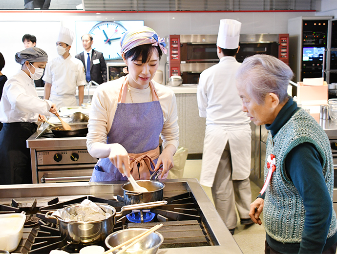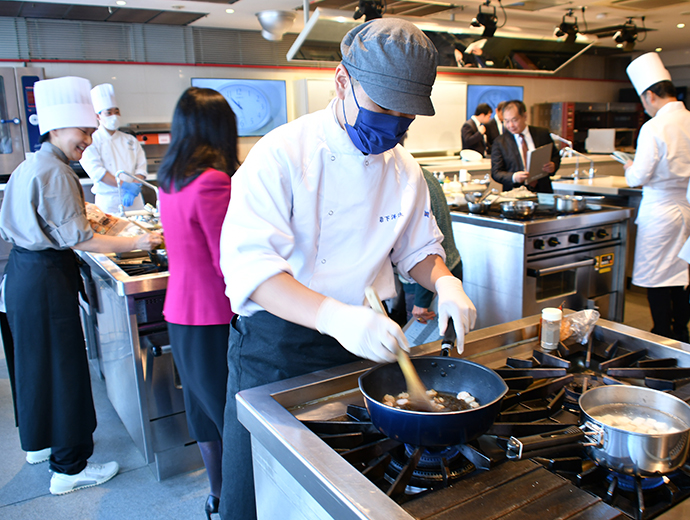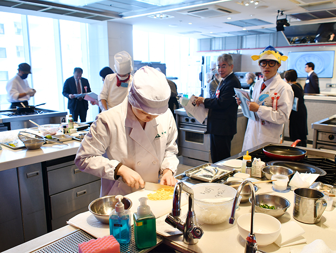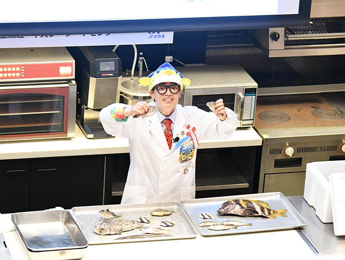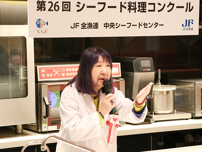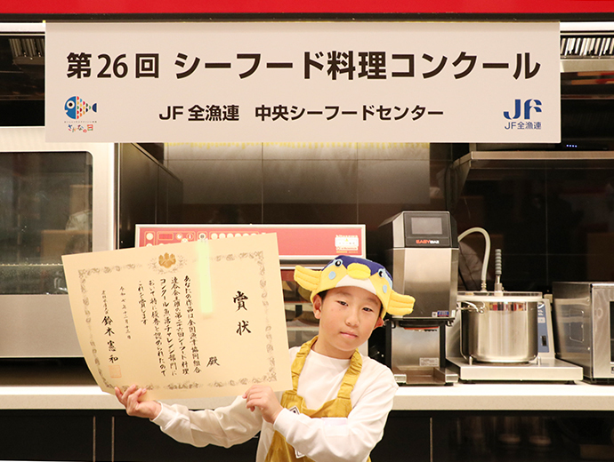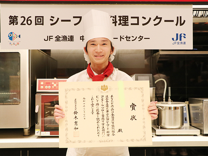 JFレポート 第26回シーフード料理コンクール開催! 2部門で農林水産大臣賞を決定 2025.12.25 JF全漁連編集部 印刷する JF全漁連は12月13日(土)、東京・服部栄養専門学校で第26回シーフード料理コンクールの実技審査・表彰式を開催しました。 本年のテーマは、「ず―――――っとうお活ッ!No Fish, No Life.」。「プロを目指す学生部門」と「魚活(うおかつ)チャレンジ部門」の2部門で、7月1日~9月24日の約3か月間、レシピを募集し、1,720作品(プロを目指す学生部門1,188作品、魚活チャレンジ部門532作品)のご応募がありました。 厳正な書類審査の結果、このうち16作品(各8作品)が最終審査に残りました。 参加者はそれぞれ、使用する魚や地元への想いを込めたレシピで腕を振るい、服部津貴子審査委員長をはじめとした審査委員の実技・試食審査により各賞が決定しました。 調理を行う参加者たち開会式では、主催者を代表して、JF全漁連の三浦秀樹常務があいさつし、「この料理コンクールは多くの人たちにおいしい水産物をたくさん食べてもらうことを目的に開催している。いちばん大切なのは楽しむこと。きょう一日、大いに楽しんでほしい」と参加者にエールを送りました。 主催者を代表してあいさつする三浦JF全漁連常務実技審査開会式の後、実技審査が始まりました。 「プロを目指す学生部門」は「20分でおいしい おさかな料理」、「魚活チャレンジ部門」は「おさかなの1汁1おにぎり」をサブテーマに、参加者14人がそれぞれ考案した国産魚介藻類を使用したオリジナル料理をつくりました。 審査項目は、おいしさのほか、アイデア、普及性、もりつけ、調理の仕方、プレゼンテーションなどで、審査委員が厳しく採点していきます。 「プロを目指す学生部門」の実技審査の模様「プロを目指す学生部門」の実技審査の模様「魚活チャレンジ部門」の実技審査の模様「魚活チャレンジ部門」の実技審査の模様さかなクンによる特別講演も開催審査結果を待つ間、JF全漁連魚食普及推進委員のさかなクンが特別講演を行いました。 さかなクンは、日本全体では食用としてあまり知られていない、流通していない低利用魚・未利用魚の魅力や活用方法などについて紹介し、「ぜひ料理などに活用してほしい」とPRしました。 講演をするさかなクン審査発表・表彰式最後に審査発表・表彰式が行われました。 各賞の受賞者が発表され、それぞれの賞の表彰状と記念品がプレゼンターから授与されました。 最優秀賞の農林水産大臣賞は、プロを目指す学生部門が「カツオのたたきのブルーベリーソース添え」(菊池翔太さん・東京都立農業高等学校食物科3年)、魚活チャレンジ部門が「ふんわりバリ旨ッ!焼きつくねむすび/磯香る~ひじきとアイゴのとろみスープ」(前野晴さん・山口大学教育学部附属光義務教育学校3年)がそれぞれ受賞しました。 プロを目指す学生部門で農林水産大臣賞を受賞した「カツオのたたきのブルーベリーソース添え」魚活チャレンジ部門で農林水産大臣賞を受賞した「ふんわりバリ旨ッ!焼きつくねむすび/磯香る~ひじきとアイゴのとろみスープ」受賞者のコメント■プロを目指す学生部門 「カツオのたたきのブルーベリーソース添え」 菊池翔太さん 「ただの『カツオのたたき』ではなく、ブルーベリーを使った意外性のある料理をつくってみました。卒業後は、西洋料理の店に就職が決まっているので、今後は日本の西洋料理を進化させられるように頑張って、料理をつくり続けたいです」 「カツオのたたきのブルーベリーソース添え」をつくった菊池翔太さん■魚活チャレンジ部門 「ふんわりバリ旨ッ!焼きつくねむすび/磯香る~ひじきとアイゴのとろみスープ」 前野晴さん 「アイゴの調理は、毒のトゲを切ってからでないと調理できないので難しかったですが、受賞できてよかったです。今後も料理をつくり続け、将来は料理人になりたいです」 「ふんわりバリ旨ッ!焼きつくねむすび/磯香る~ひじきとアイゴのとろみスープ」をつくった前野晴さん各受賞作品の料理写真などを掲載した情報は、第26回シーフード料理コンクール結果発表・イベントレポートページで予定しています(来年1月中)。 ▶結果発表ページはこちら 審査委員長による総評最後に、服部審査委員長が以下の総評を述べました。 「皆さま方の料理は大変おいしかった。順位はついたが、今回は新感覚の料理もあった。魚活チャレンジ部門で1位を取った作品は、漁業関係者が扱いに困っているアイゴを使ったもので、すごく考えられていて、おいしい料理だった。プロを目指す学生部門で1位を取られた作品は、ブルーベリーを魚のソースに使うという、これまでにないアイデアのもので、おいしかった。 また、今回の料理は、世界的に注目されている『食品ロス』や『SDGs』をコンセプトにした魚料理が多かった。料理を作る際には、地球環境や資源保護など、いろいろな要素を考えて作ることが大事になってくるので、ぜひそのようなことも考