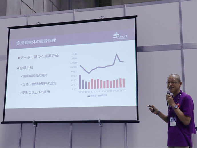 JFレポート JF全漁連、第25回ジャパン・インターナショナル・シーフードショーに出展 2023.9.26 JF全漁連編集部 印刷する 「第25回ジャパン・インターナショナル・シーフードショー」(主催:一般社団法人大日本水産会)が8月23日~25日の3日間、東京ビッグサイトで開催されました。 ジャパン・インターナショナル・シーフードショーは、水産物と冷凍や加工といった水産物にはなくてはならない技術が集結する国際的な展示会です。さまざまな企業・団体が、その技術や取り組み、製品を紹介するブースを設け、国内外にその魅力を発信しています。 今年は、昨年の1万8,820人を大きく上回る、2万3,394人が来場しました。 水産物の試食、機械の実演や展示、さらには握りずし体験といった個性的な催しが行われるなど、それぞれの企業・団体がさまざまな方法で自らの持ち味をアピールし、会場は活気に溢れていました。 JFグループがブース出展、各地の水産物をPRJFグループからは、JF青森漁連、JFいしかわ、JF山口、JFえひめ、JF福岡有明海漁連、JFおおいたのほか、各地のJFや広域水産業再生委員会などが出展しました。 JFいしかわのブース。今回新しく制作したという鮮やかなポスターが目を引きますJF青森漁連のブース。人気商品「ほたてマヨネーズ」は、開けやすくなってリニューアルJFおおいたのブース。かぼすヒラマサは、柑橘の後味がさわやか!JF全漁連が「スマート水産業」をテーマにセミナー、展示を実施8月24日には、JF全漁連が「スマート水産業入門」と題したセミナーを開催しました。 公立はこだて未来大学システム情報学部の和田雅昭教授が登壇し、スマート水産業を導入した4つの地区の事例を紹介しました。 スマート水産業とは、ICT、IoTといった先端技術を活用することで、水産資源を持続的に利用しながらも、水産業の「産業としての成長」を両立させる、次世代の水産業のことです。 スマート水産業は、漁船1隻単位で取り組んでも、その効果は発揮されづらいといいます。 多くの船が一度に取り組み、地域全体のデータが蓄積されることで、「漁に適した場所」「漁に適した時期」などを客観的に洗い出すことができ、効率よく漁を行うことができます。 和田教授は講演で、「水揚げデータの入力画面を、漁業者が以前からつけていた手書きの日誌に近い形にした」「まずは紙媒体でのデータ収集・共有を行い、『これがデータなら、よりリアルタイムで状況を知ることができる』という伝え方をした」と話しており、最先端の技術を身近に感じられるような工夫をすることで、少しずつ受け入れられていったことを、実際の体験談をもとに解説しました。 また、スマート水産業の広がりには、人・地域・産業などでスマート水産業を「みんなで育てる」という発想が重要だと語り、スマート水産業の将来性について考える、大変貴重な講演となりました。 座席数を上回る予約があったセミナー。質疑応答では、スマート水産業の養殖業への応用について質問が出ましたJF全漁連のブースでは「身近なスマート水産業」をテーマに出展。 実際に漁業の現場で使用されているスマート水産業の機器を展示したほか、実際に使用しているJF宗像(宗像地区地域水産業再生委員会)、JF池田(香川県地域水産業再生委員会 小豆地区部会)の取り組みを紹介するポスター展示を行いました。 カキ養殖に力を入れているJF池田の事例。この機械を海中に入れることで、水温や塩分濃度といったデータの計測が可能となり、現場では作業効率化が実現また、2018年度浜の活力再生プラン優良事例表彰にて農林中金理事長賞を受賞した、香川県地域水産業再生委員会・小豆地区部会に所属するJF池田による加工品の展示、試食コーナーもあり、ともに大盛況でした。 ブースにお立ち寄りくださった皆さま、ありがとうございました。 来場者の質問に答えるJF池田の岡本さんJF全漁連のブース。3日間を通じて、多くの方にご来場いただきました* * * Sakanadia関連記事 ▶JF全漁連、第24回ジャパンインターナショナルシーフードショー出展し海業についてセミナーを実施 ▶8/25にシーフードショー内で、JF全漁連セミナー開催!「海業の振興による漁村地域の活性化に取組む 和歌山県太地町」 ▶水産の大商談会「ジャパンインターナショナルシーフードショー」開催、1万1125人が来場 約380社が出展 JF全漁連漁協(JF)漁師イベントJF全漁連編集部漁師の団体JF(漁業協同組合)の全国組織として、日本各地のかっこいい漁師、漁村で働く人々、美味しいお魚を皆様にご紹介します。 地域産業としての成功事例や、地域リーダーの言葉から、ビジネスにも役立つ話題も提供します。 SakanadiaFacebookこのライターの記事をもっと読む