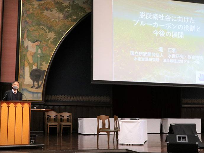 JFレポート 東大安田講堂でシンポジウム「里海保全の最前線」開催 2023.3.28 JF全漁連編集部 印刷する JF全漁連と全国内水面漁業協同組合連合会、全国豊かな海づくり推進協会は2月11日、東京大学安田講堂でシンポジウム「里海保全の最前線」を開催しました。 このシンポジウムは、全国各地の海辺や川辺で環境保全活動などの「水産多面的機能発揮対策」に取り組む漁師や市民を中心としたグループが、これまでの活動の成果や課題について報告などを行うもの。 今回も新型コロナウイルス感染対策のため、会場参加人数を制限してオンラインと併用開催となりましたが、活動報告や専門家の講演を聞くために、多くの関係者が聴講しました。 ※「水産業の多面的機能」とは、「美味しく新鮮な魚を安定的に皆さんに提供する」以外の「水産業がもたらす良い影響」のこと。 漁師や漁協は、海難救助や海浜清掃、藻場や干潟を守り海の環境を保全する活動などを行っており、住民や企業などと連携した活動に発展にしている地域もあります。 ▶水産業の多面的機能とは? https://sakanadia.jp/gyogyou/word_tamentekikinou/ 基調講演は「脱炭素社会に向けたブルーカーボンの役割と今後の展開」がテーマ基調講演では、国立研究開発法人水産研究・教育機構 水産資源研究所 水産資源研究センター 社会・生態系システム部 沿岸生態系グループ長の堀正和氏が、脱炭素社会に向けたブルーカーボンの役割と今後の展開について講演しました。 堀氏は、国内外のブルーカーボンに関連した動きについて、「海産物は食料生産によるCO2排出が陸上よりかなり少ないため、世界中で大規模な海藻養殖が始まっている」と紹介。また、藻場と陸上植物のCO2吸収量を比較した結果について、「藻場は森林と同等。アマモは広葉樹やスギの人工林よりも高い。海藻養殖でも天然の藻場と遜色がない」と報告しました。その上で、今後について、CO2吸収源としての藻場を維持・拡大することや、海藻養殖のための技術開発の必要性を指摘しました。 5つのグループが活動報告活動報告では、全国各地で藻場・干潟、サンゴ礁の環境保全、国境監視などに取り組んでいる活動組織の中から先進的、効果的な取り組みを行っている5つのグループが活動内容を報告しました。 【内水面生態系の保全】 「市民・学生の協働で守る盛川の生態系」盛川の環境を守る会(岩手県大船渡市) 【国境・水域の監視、海の監視ネットワーク強化】 「奥尻の海の安全と環境を見守って」奥尻地区海の監視活動組織(北海道奥尻町) 【藻場の保全】 「葉山町の多様な主体が連携した海の森づくり活動」葉山アマモ協議会(神奈川県葉山町) 【干潟等の保全】 「干潟の保全活動報告」美浜町漁場環境保全会(愛知県美浜町) 【サンゴ礁の保全】 「サンゴ礁の里海づくり」恩納村美ら海を育む会(沖縄県恩納村) ▶発表詳細はシンポジウム資料でご覧いただけます。 https://hitoumi.jp/event/R4symposium_text-final.pdf ディスカッション—あるものに目を向けて積極的な出会いを最後に東京大学大学院農学生命科学研究科教授の八木信行氏がコーディネーターとなり、ディスカッションを行いました。参加者からの質問に回答したほか、6人のコメンテーターと活動報告を行った発表者が意見交換しました。 <ディスカッション> ■コーディネーター 八木 信行氏(東京大学大学院農学生命科学研究科国際水産学研究室 教授) ■コメンテーター 鹿熊 信一郎 氏(佐賀大学海洋エネルギー研究所 特任教授) 桑原 久実 氏 (元 国立研究開発法人 水産研究・教育機構 水産技術研究所 企画調整部門 研究主幹) 崎長 威志 氏 (広島県内水面漁業協同組合連合会 参与) 玉置 泰司 氏 (元 国立研究開発法人 水産研究・教育機構 中央水産研究所 経営経済研究センター長) 藤田 大介 氏 (東京海洋大学大学院 准教授) 堀正和氏(国立研究開発法人 水産研究・教育機構 水産資源研究所 水産資源研究センター 社会・生態系システム部 沿岸生態系グループ長) ▶水産多面的機能発揮対策情報はこちら 専用サイト「ひとうみ.jp」 JF全漁連イベントJF全漁連編集部漁師の団体JF(漁業協同組合)の全国組織として、日本各地のかっこいい漁師、漁村で働く人々、美味しいお魚を皆様にご紹介します。 地域産業としての成功事例や、地域リーダーの言葉から、ビジネスにも役立つ話題も提供します。 SakanadiaFacebookこのライターの記事をもっと読む