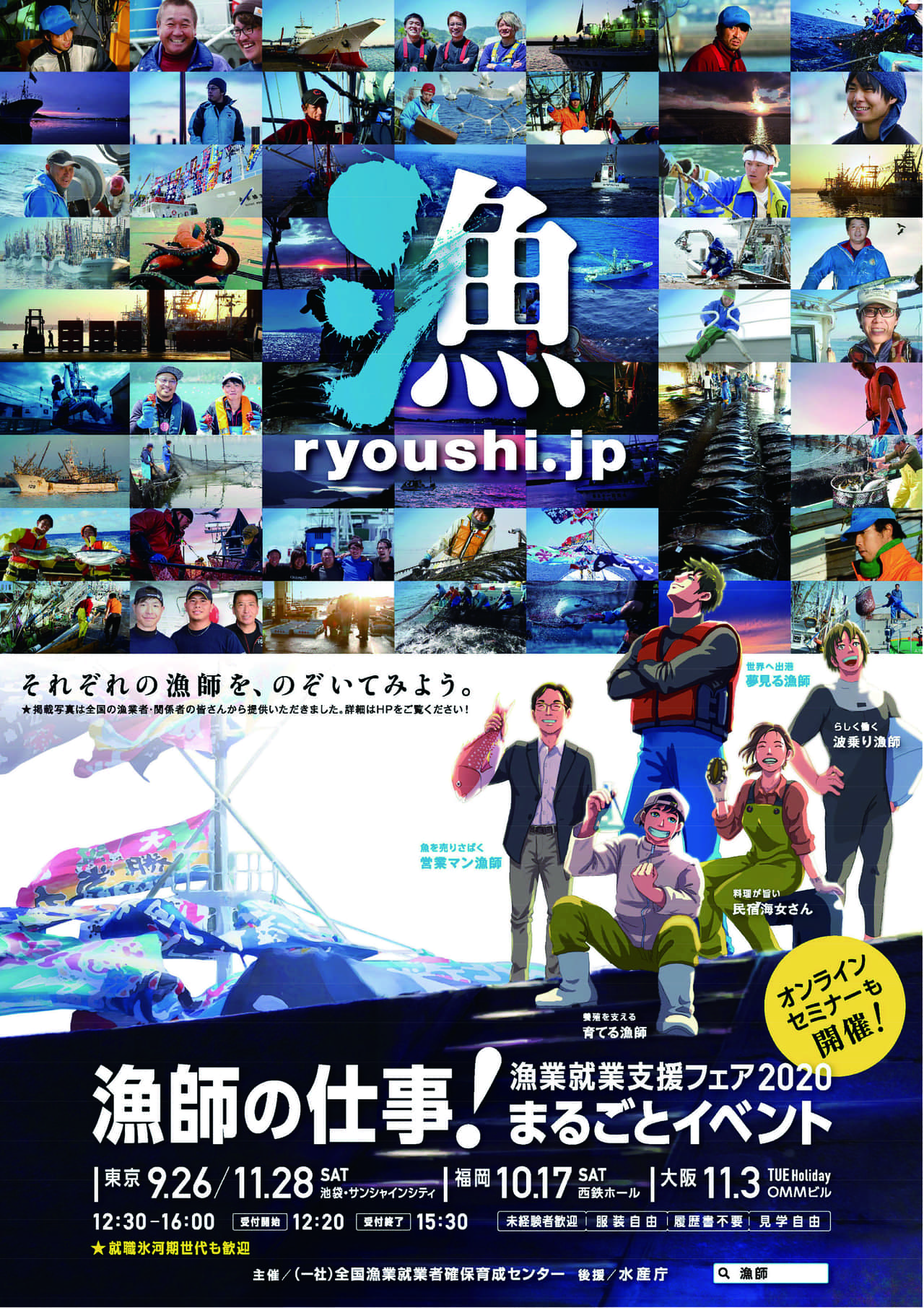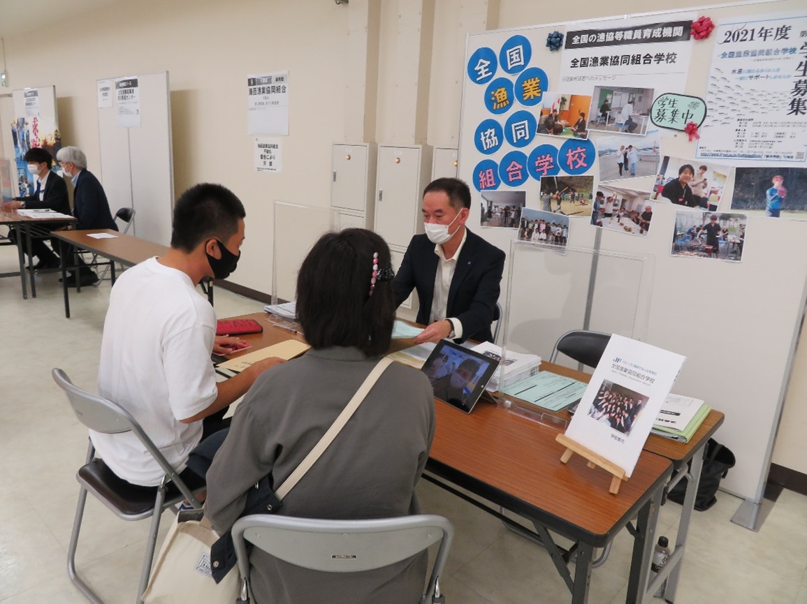 JFレポート 「漁師になりたい人、集まれ」 漁業就業支援フェア2020開催 2020.10.6 JF全漁連編集部 印刷する コロナ対策を徹底、オンライン面接なども実施「漁師になりたい」、「漁業に興味・関心があり、就職したい職業の選択肢の一つとして考えている」このように考えていても、「漁師になるための方法や就労に関する情報が手に入りにくい」、「できるかどうか不安なので、直接、関係者の話を聞いてみたい」という人は多いはず。 そんな想いに応えるべく、新たな漁業の担い手の確保・育成に取り組んでいる一般社団法人全国漁業就業者確保育成センターでは、誰でも気軽に参加でき、漁業についてまるごとわかる「漁業就業支援フェア」を毎年、開催しています(後援:水産庁)。 今年は東京(9月26日、11月28日の2回)、大阪(11月3日)、福岡(10月17日)の3会場で計4回開催する予定で、会場では新型コロナウイルス感染拡大予防対策を実施。併せて、オンラインでの面接や漁業ガイダンスなども初めて開催されます。 今回は、9月26日(土)に開催された「漁業就業支援フェア2020 」の東京会場(1回目)の模様をご紹介します。 東京会場(1回目)には26団体出展、163人来場「漁業就業支援フェア」には、毎年、新人漁師を募集している漁協や船主、関係団体などが多数、ブース出展し、来場した多くの就業希望者は、出展者との面談を行います。 その面談で、マッチングが成立した場合は、最終意思を確認した後、受入機関での現場研修に参加し、研修終了後に漁師として就業することができます。 9月26日(土)に東京・池袋サンシャインシティで開催されたフェアには、26団体(うちオンライン9団体)が出展し、163人の就業希望者が来場。 高校生などの若者や、家族連れのサラリーマンなど、幅広い年齢層がブースを訪れ、出展者から、就労条件など採用に関する情報や、漁師の生活や地域の情報などを熱心に聞いていました。 組合学校も出展し、来年度の学生募集漁協の役割などについても紹介また、漁協職員を養成する教育機関である「全国漁業協同組合学校」(以下、組合学校)も9月26日のみブース出展し、来場者に2021年度学生募集の内容や、漁協の役割などについて丁寧に説明しました。 ブースを訪れた、北海道からフェアのために上京してきた大学生や、魚好きなことから漁業に興味を持った高校生(茨城県在住)、漁協については知らなかったが、学校生活の写真等を見て、「楽しそう」と思った高校生らは、真剣な眼差しで学校職員の話を聞いていました。 「漁業就業支援フェア」は、10月17日(土)に福岡、11月3日(火・祝日)に大阪、11月28日(土)に東京(2回目)で引き続き、開催されます。 「漁師になりたい人」、「漁業に興味・関心があり、就職したい職業の選択肢の一つとして考えている人」、「将来を模索している人」は、お気軽に、参加してみてください。 【Iターン・Uターン漁師の記事】 ▶大阪からのⅠターン漁師・中井恭佑さんの挑戦(三重県尾鷲市早田町) ▶長崎のポジティブ漁師、明日の漁業を照らす ▶伝統のシロエビ漁でガッチリ稼ぐ【前編】富山湾のUターン漁師 【漁師の経営塾「浜の起業家養成塾」関連記事】 ▶浜の起業家養成塾1期生を追う ▶漁師の経営塾、7人の漁師たちの11日間 Iターン・Uターン若手研修JF全漁連編集部漁師の団体JF(漁業協同組合)の全国組織として、日本各地のかっこいい漁師、漁村で働く人々、美味しいお魚を皆様にご紹介します。 地域産業としての成功事例や、地域リーダーの言葉から、ビジネスにも役立つ話題も提供します。 SakanadiaFacebookこのライターの記事をもっと読む
