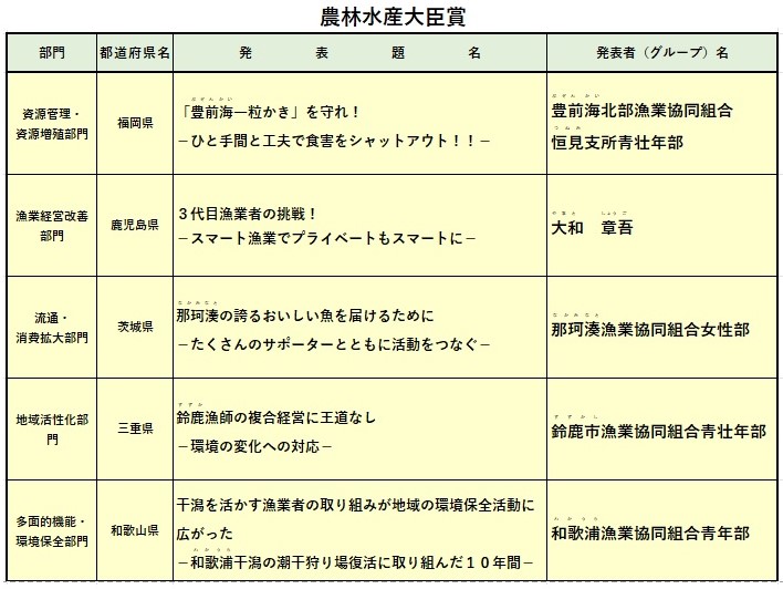 JFレポート 漁師の甲子園「第27回 全国青年・女性漁業者交流大会」レポート―スマート漁業や漁農複合経営などが農林水産大臣賞に― 2022.4.1 JF全漁連編集部 印刷する 今年度の漁業者による発表のようすJF全漁連は3月2日、東京・千代田区のホテルグランドアーク半蔵門で「第27回全国青年・女性漁業者交流大会(協賛:全国漁協女性部連絡協議会・全国漁青連、後援:農林水産省ほか)」を新型コロナウイルス感染症対策のためオンラインで開催し、農林水産大臣賞のほか水産庁長官賞などの各賞を決定しました。 * * * 「全国青年・女性漁業者交流大会」とは2018年度の交流大会のようす ※今年度はオンラインで開催「全国青年・女性漁業者交流大会」は、全国の漁業者が、日頃の研究・実践活動の成果を発表し交流する、年に一度の大会です。 水産業・漁村の発展・活性化のための技術・知識などを研鑽することを目的としており、「漁師の甲子園」とも呼ばれています。 「資源管理・資源増殖部門」「漁業経営改善部門」「流通・消費拡大部門」「地域活性化部門」「多面的機能・環境保全部門」の5つの部門に分かれて、全国各地からエントリーした漁業者たちが活動発表を行い、農林水産大臣賞などが与えられます。 部門ごとに専門家が審査委員となり審査を行います。 また、本大会は農林水産祭参加表彰行事であり、農林水産大臣賞受賞者は、来年度の農林水産祭天皇杯などの候補になります。 * * * 気になる農林水産大臣賞は?農林水産大臣賞の受賞一覧コロナ禍が長引き、攻めの活動が難しい期間が続いていますが、食料生産を担う漁業現場の皆さんは、安心・安全な水産物を安定的に供給するために日々改善を重ねていることが分かります。 農林水産大臣賞を受賞した皆さんの発表のようすは次の動画でご覧ください。 【第1分科会】「資源管理・資源増殖部門」「『豊前海一粒かき』を守れ!ひと手間と工夫で食害をシャットアウト!」 (福岡県豊前海北部漁協恒見支所青壮年部 清水利彦さん) 【審査委員のコメント】 簡易的に手間をかけずにクロダイなどの食害を防ぐことができるということで、すでにこの取り組みの効果が表れてきており、豊前海やそのほかの地域でも普及し始めていることを高く評価しました。 さらに、食害を防ぐだけでなく、養殖カキを効果的に高く販売するというところまで取り組みが進み、限られた資源で漁業経営を効果的に行っていくという観点からも評価できます。 【第2分科会】「漁業経営改善部門」「3代目漁業者の挑戦!~スマート漁業でプライベートもスマートに~」 (東串良漁業協同組合 大和章吾さん) 【審査委員のコメント】 情報システムを利用したスマート化の実践、漁閑期に農業(ピーマン)を兼業することで年間収入の安定化を図っているところが、漁業経営の改善を新しいアプローチで成し遂げています。船団操業の新システムは拡張性があり、沿岸漁業でもこのようなスタイルの漁業の発展が期待されます。 【第3分科会】「流通・消費拡大部門」「那珂湊の誇るおいしい魚を届けるために—たくさんのサポーターとともに活動をつなぐ—」 (那珂湊漁業協同組合女性部 根本経子さん、恵美さん、香織さん) 【審査委員のコメント】 「生み出す」「伝える」「届ける」という3側面で優れた取り組みを行っていることを高く評価しました。もう一つ重要な点は、このような活動の担い手が子育て世代の若い人に広がっていることです。このことは活動の継続性や発展性を示唆するものと考えられます。 【第4分科会】「地域活性化部門」「鈴鹿漁師の複合経営に王道なし—環境の変化への対応—」 (鈴鹿市漁業協同組合青壮年部 矢田直宏さん) 【審査委員のコメント】 漁業者同士が連携して資源管理をしたり、他地区との連携で新しい技術の導入を図ったりすることなどを試して、着実に実践に結び付けて漁業の継続に向けての活動が行われています。またこの取り組みを若手の漁業者が盛り上げている姿が印象深く伝わってきたことを評価しました。 【第5分科会】「多面的機能・環境保全部門」「干潟を活かす漁業者の取り組みが地域の環境保全活動に広がった~和歌浦干潟の潮干狩り場復活に取り組んだ10年~」 (和歌浦漁業協同組合青年部 横田邦雄さん) 【審査委員のコメント】 漁業者たちが食害対策や稚貝の分布調査をして効果を検証しながら、研究機関、普及員、地域の協力を受けて取り組み、増殖効果が目に見えてきています。また、地元の観光協会とも連携し、都市部の消費者にも目を向けています。さまざまな新しい取り組みに挑戦していることや、子どもたちと連携して地域ぐるみの活動をされていることなどを高く評価しました。 総評―小規模漁業が日本の食に重要な役割馬場審査委員長審査委員長をつとめた東京海洋大学の馬場治名誉教授は、次のように総評を述べました。 【馬場審査委員長の総評】 時間をかけて環境を回復するなど、地道な活動が多い「多面的