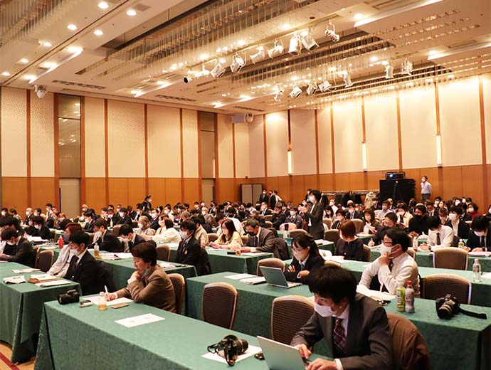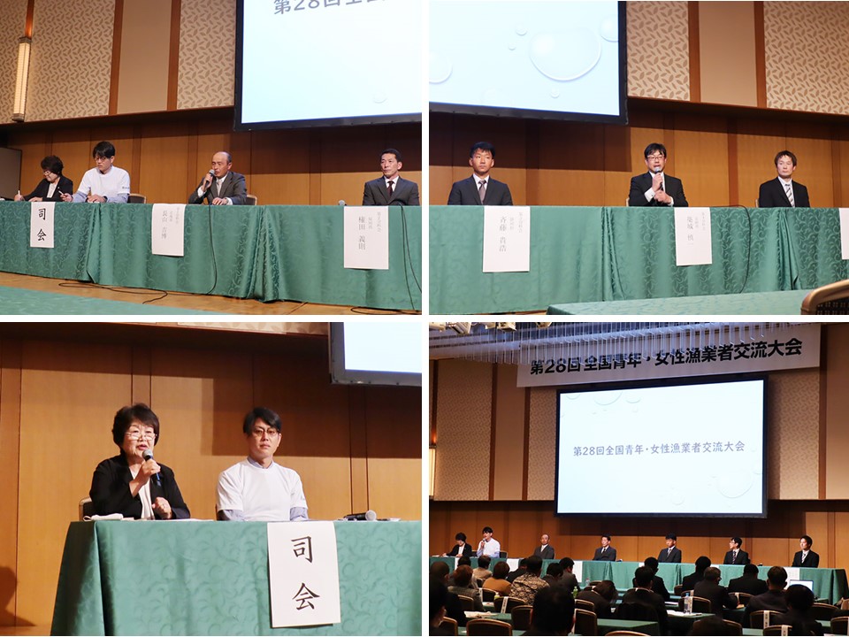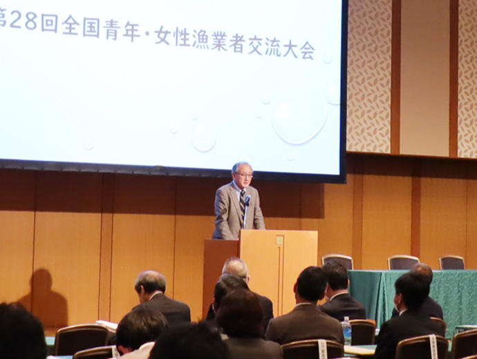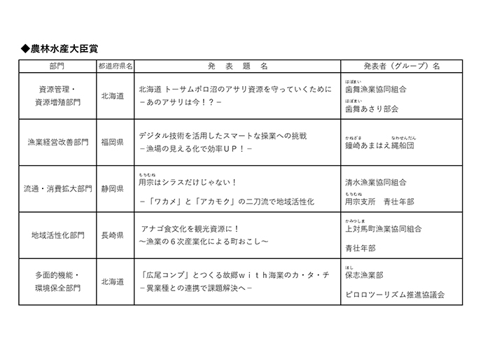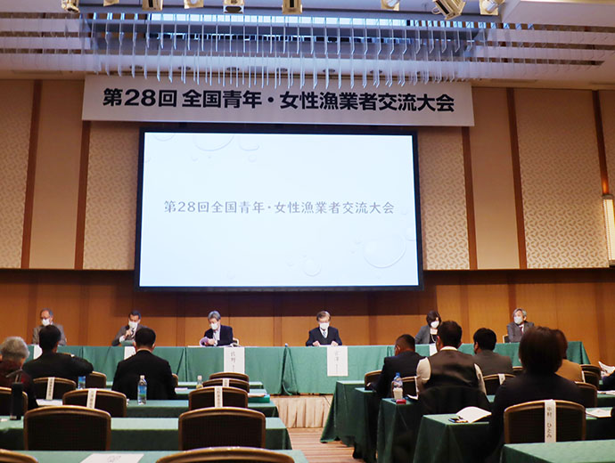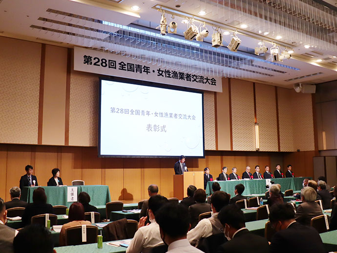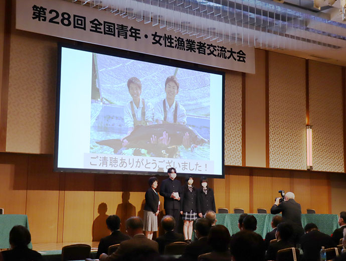 3年ぶりの対面開催「漁師の甲子園」第28回全国青年・女性漁業者交流大会をレポート 2023.3.31 JF全漁連編集部 印刷する JF全漁連は3月1日、2日の2日間、東京・千代田区のホテルグランドアーク半蔵門で「第28回全国青年・女性漁業者交流大会」(協賛:JF全国女性連・JF全国漁青連、後援:農林水産省ほか)を開催し、農林水産大臣賞のほか水産庁長官賞などの各賞を決定しました。 全国青年・女性漁業者交流大会とは?年に一度開催するこの大会は、全国の青年・女性漁業者が日頃の研究・実践活動の成果を発表する場であるとともに、参加者間の交流により知識や情報を共有・進化させることで、水産業・漁村の発展と活性化に資することを目的としています。 そして、水産業・漁村の発展・活性化のための技術・知識などを研鑽する場でもあるため、業界では「漁師の甲子園」とも呼ばれています。 また本大会は農林水産祭参加表彰行事でもあり、農林水産大臣賞受賞者は、来年度の農林水産祭天皇杯などの候補になります。 今年度は新型コロナウイルス感染症拡大の影響が少しずつ緩和されてきたことから、3年ぶりの対面での開催となり、全国から集まった漁業関係者から久しぶりに顔を合わせた交流が行われたことについて喜びの声が聞かれました。 当日の活気に満ちた2日間の様子をここでレポートします! ●1日目:5つの部門、各会場に分かれて発表2日間のうち1日目は、全国各地からエントリーした漁業者たちが発表を行います。 大会には①「資源管理・資源増殖部門」、②「漁業経営改善部門」、③「流通・消費拡大部門」、④「地域活性化部門」、⑤「多面的機能・環境保全部門」の5つの部門があり、当日は各部門ごとに会場を分けて発表が行われ、それぞれの部門で3人の専門家が審査委員として審査を行いました。 各部門ごとの会場では、審査委員をはじめ来場者が発表に真剣に耳を傾ける姿があり、具体的な質問と応答も飛び交いました。 ●2日目:各部門の講評と農林水産大臣賞受賞作品の発表・表彰各部門ごとの審査委員からの講評&農林水産大臣賞発表2日目は各部門ごとの審査委員から農林水産大臣賞が発表され、併せて講評が述べられました。 農林水産大臣賞に選ばれたのはこちら↓ 農林水産大臣賞の受賞一覧▶他各賞の受賞を含め、特設サイトでもご紹介しています 質問や応答が活発に交わされた「意見交換会」農林水産大臣賞の受賞者5人を壇上に迎え、各発表に対し具体的な質問のほか、漁業全体に関する意見交換が行われました。 昨今の気候変動による水温上昇の影響についての質問では、磯焼けの問題、水温上昇によるワカメの生育不良や魚介藻類の種類の変化をリアルに体感しているという声などがあがりました。獲れるものが変われば、取引先や加工、用途、流通、あらゆるものが変わるものの、今後それらにも適応していく必要があると感じていることなど、環境変化への対応について意見が交わされました。 また女性活躍の現状報告や今後への提言をはじめ、各地域での資源管理の課題や対応事例について情報が共有さたほか、参加者から受賞者への具体的な質問があがり、全国各地の漁業者それぞれの現状を知る機会となりました。 ステージ上、左から荒木直子JF全国女性連会長、川畑友和JF全国漁青連会長、農林水産大臣賞を受賞した発表者の長山吉博さん、権田義則さん、斉藤貴浩さん、築城慎一さん、保志弘一さん川畑友和JF全国漁青連会長はIT技術を取り入れたスマート漁業についての発表に触れ、今回の発表事例をモデルに各地でスマート漁業が普及していくことへの期待を述べました。 荒木直子JF全国女性連会長は、「3年ぶりの実開催となり、各部門全体的に皆さんの発表を聞かせてもらいました。沿岸漁業でのITテクノロジーの導入など、新たなワードとして出てきている『海業』の取り組みに向けてもすばらしい交流大会でした。若くて力強い青年部の方と、経験豊富な女性連とで、これからの水産業を盛り上げていきたいと感じました」とコメント。 参加者から受賞者へ、事例に関する具体的な質問も投げかけられました日頃は全国各地で漁業に取り組む参加者らが、別の地域での優良事例を知ることで刺激を受け、地元でそれを取り入れ生かしていくことは、まさにこの交流大会の目的である「水産業・漁村の発展・活性化のための技術・知識などを研鑽する場」になっているのだと感じました。 全国水産・海洋高等学校生徒研究発表大会最優秀賞受賞作品の発表全国水産・海洋高等学校生徒研究発表大会最優秀賞受賞作品として、新潟県立海洋高等学校水産資源科資源育成コースの生徒さんが「地域特産品化を目指したキャビア生産に関する研究 ~DNA分析による雌雄判別法の開発~」と題し発表しました。詳細な研究手法やその成果に、現役漁業者を含め参加者らが真剣に耳を傾けていたことが印象的でした。 各賞発表&表彰式表彰式であいさつする坂本雅信JF全漁連会長農林